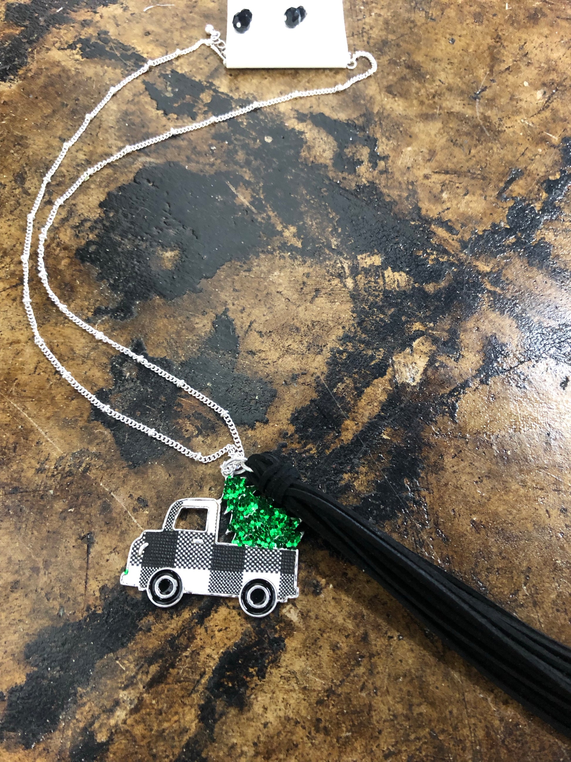 27" Christmas Tree Truck Tassel Necklace - Black White Plaid