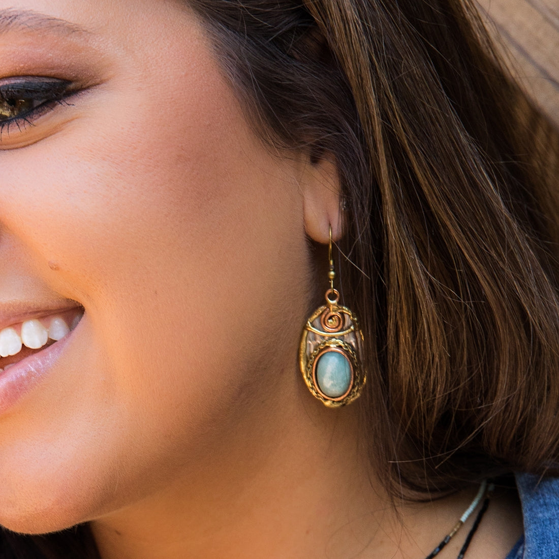 - Details: Oval pendant with brass rope accents, copper swirls & Amazonite stone