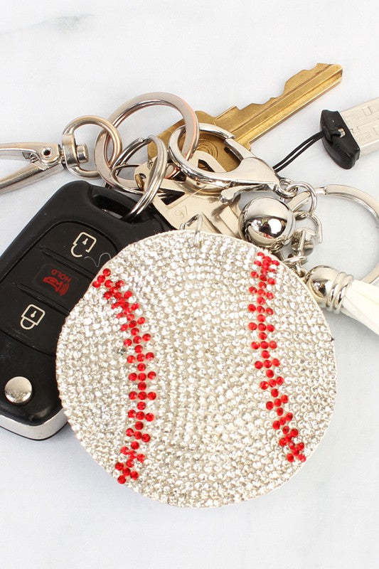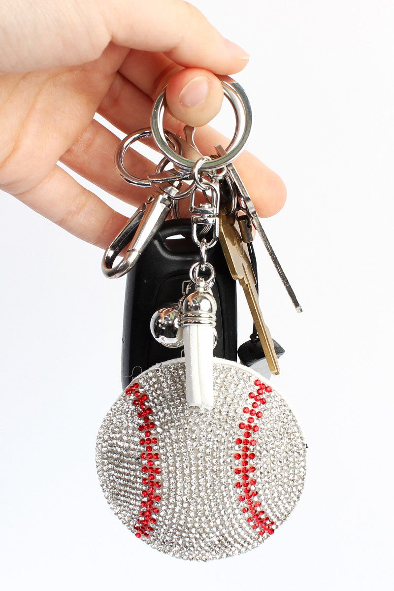 - Each rhinestone keychain has a key ring, a secure lobster claw clasp, a decorative ball and a fringe tassel