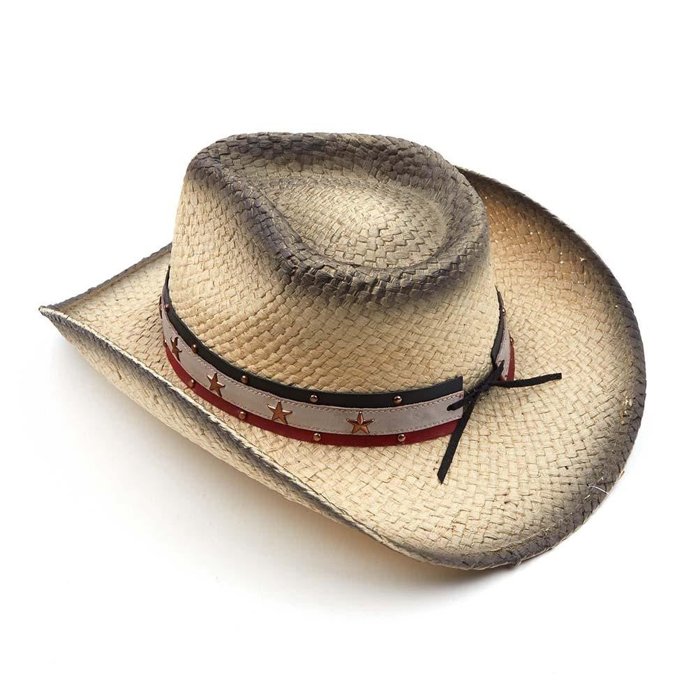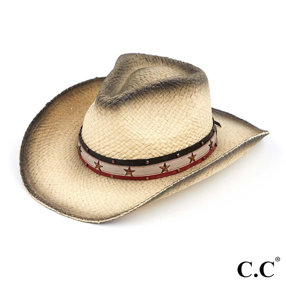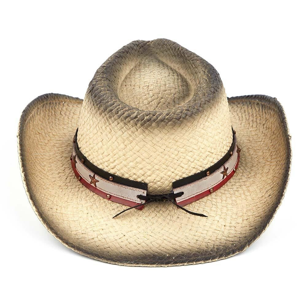 Light Black Stained Straw Cowboy Hat featuring a Red, White & Blue Faux Leather Band with Silver Stars and Studs.