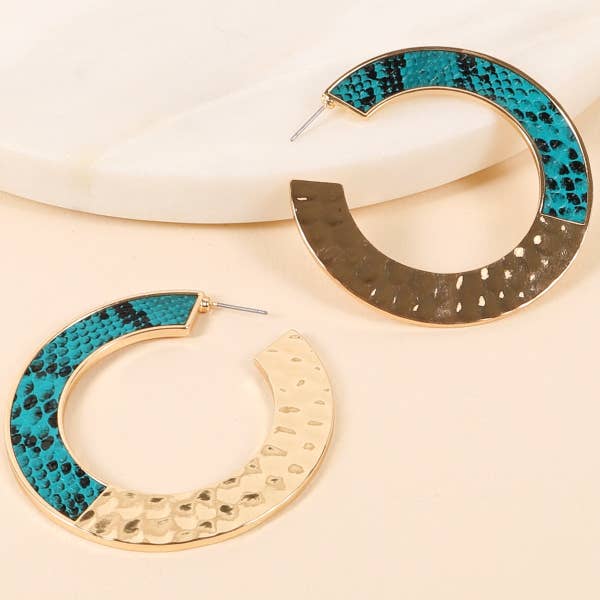 Colorful python printed PU leather and hammered metal open hoop earrings.