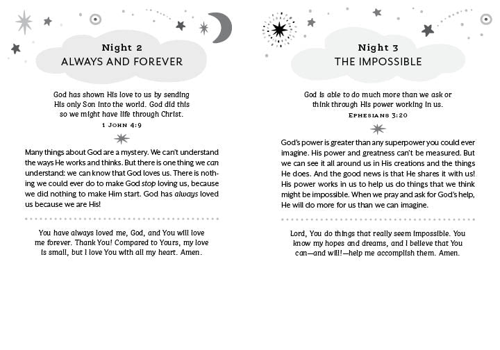 In just 3 easy steps—1) meditate on a brief, but powerful, scripture selection; 2) read through a relevant devotion; 3) start a conversation with God by reading a heartfelt prayer—girls will be encouraged and motivated to grow in their faith. Bedtime will become peaceful and comforting—the very best time of the day!—with these truth-filled devotions and prayers!