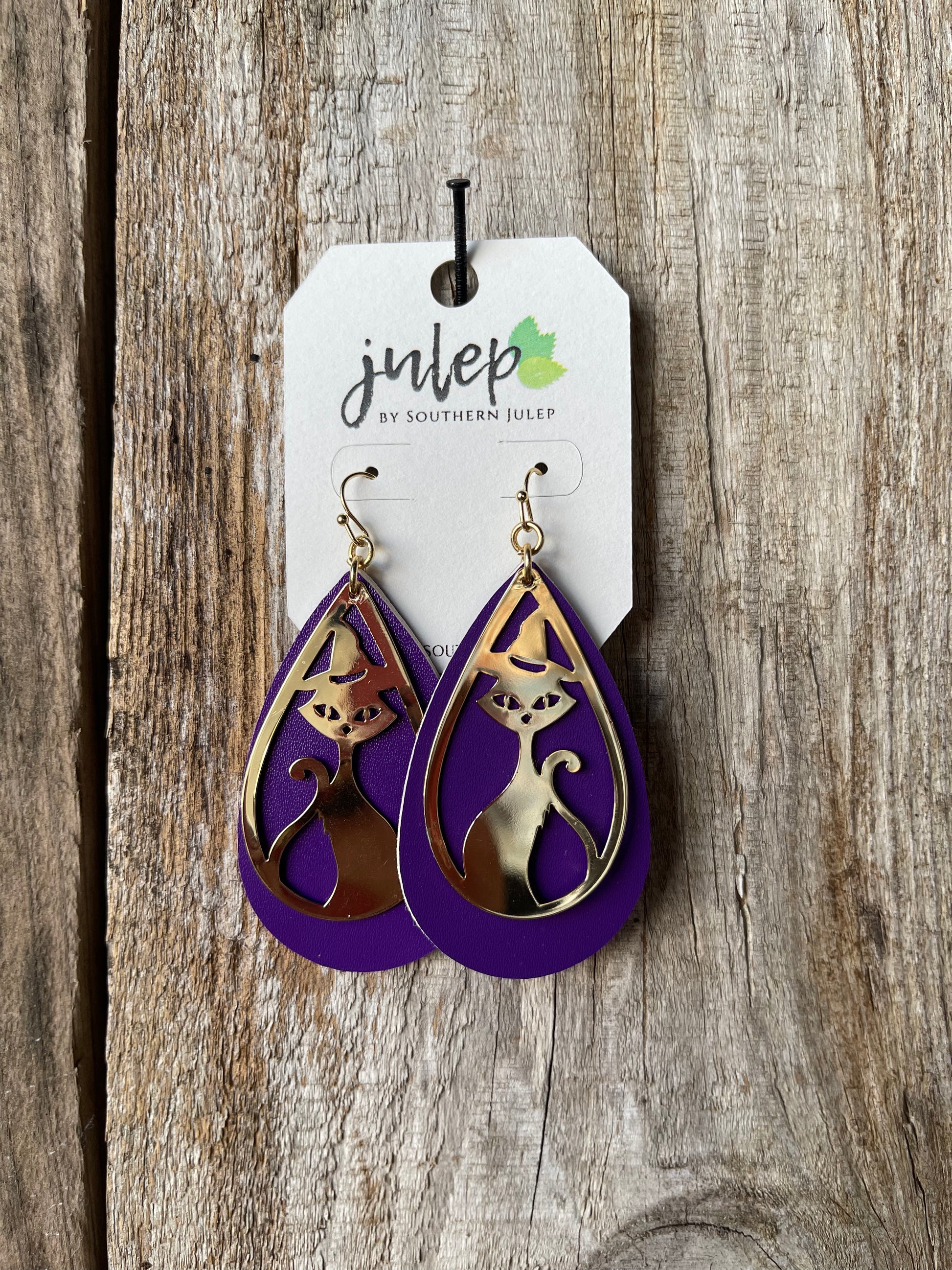 Halloween Leather Teardrop Earrings Featuring Black Cat Details