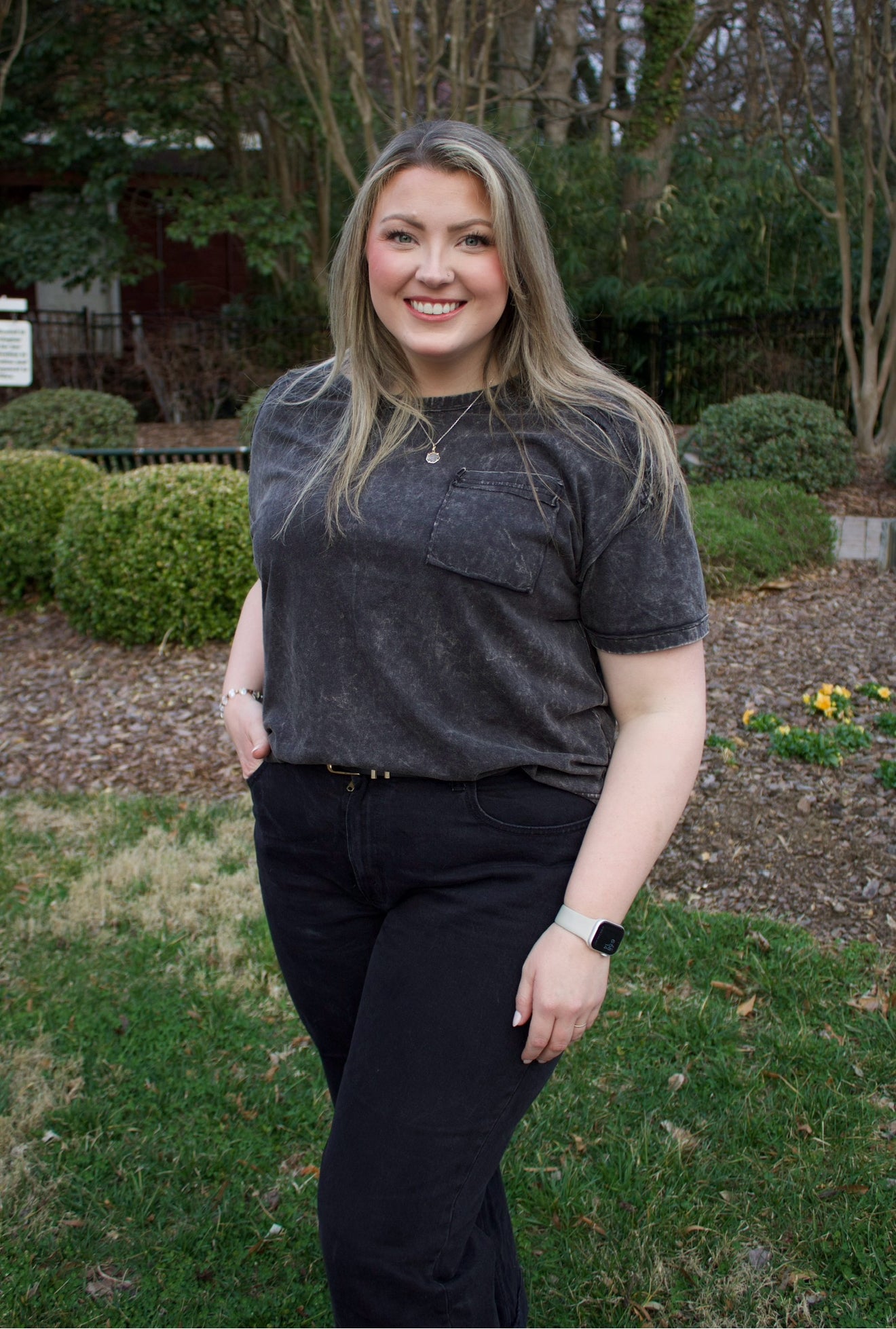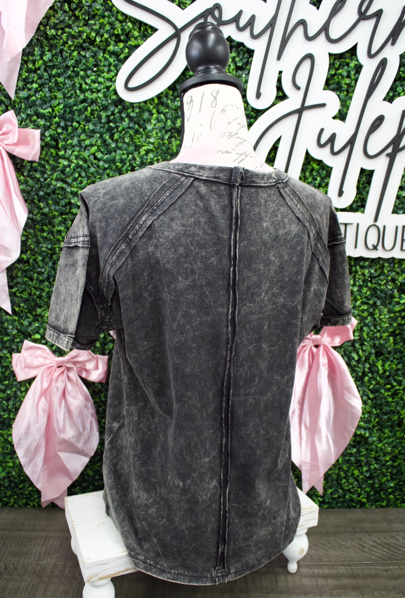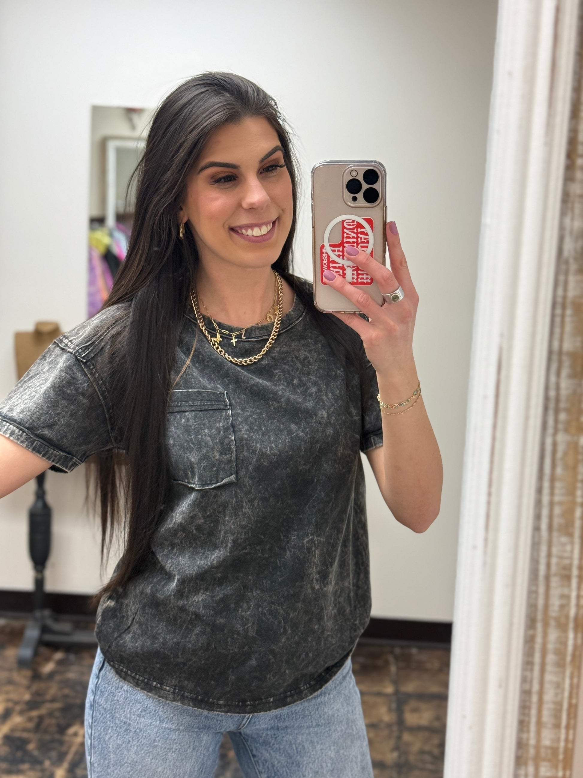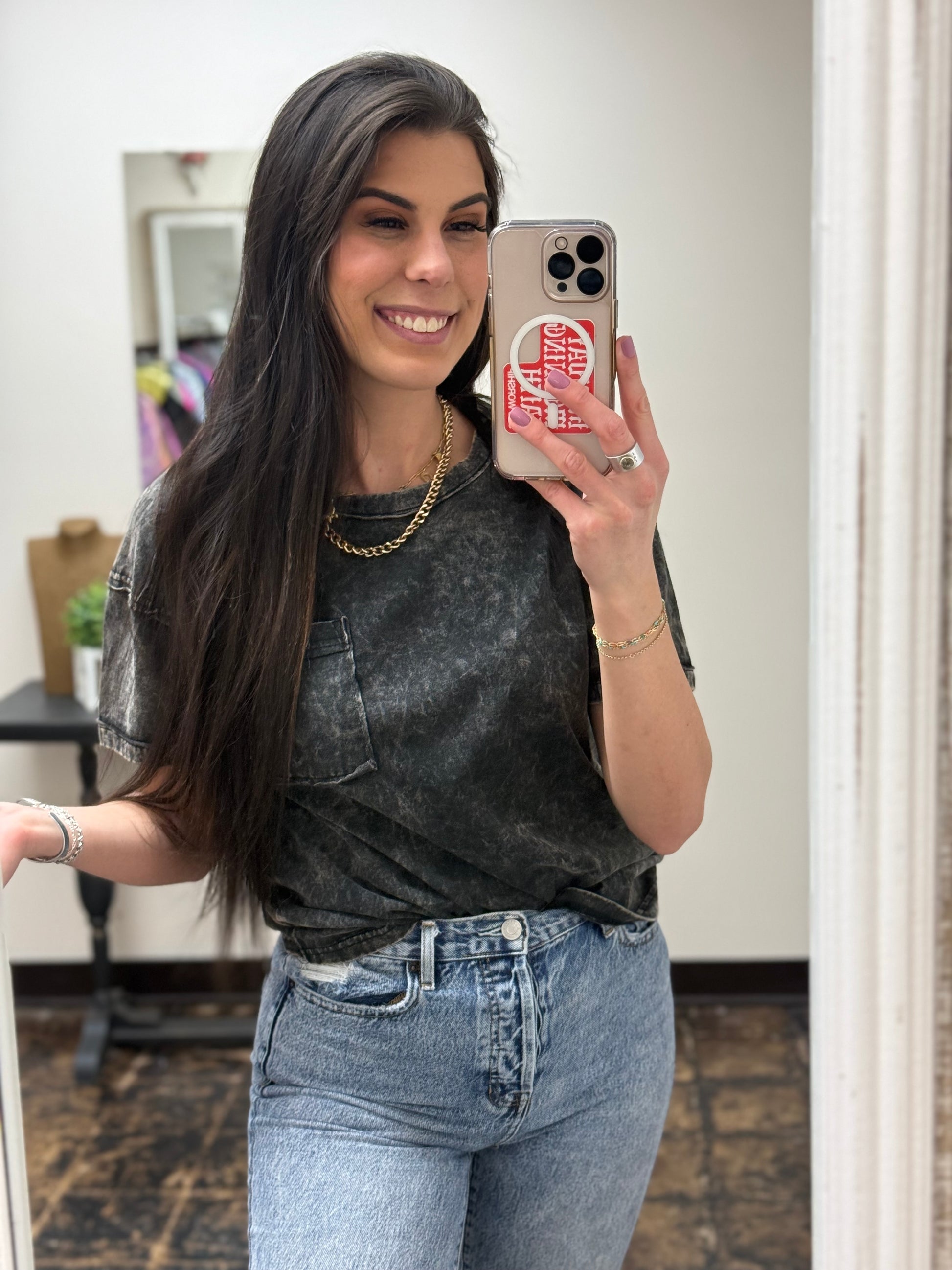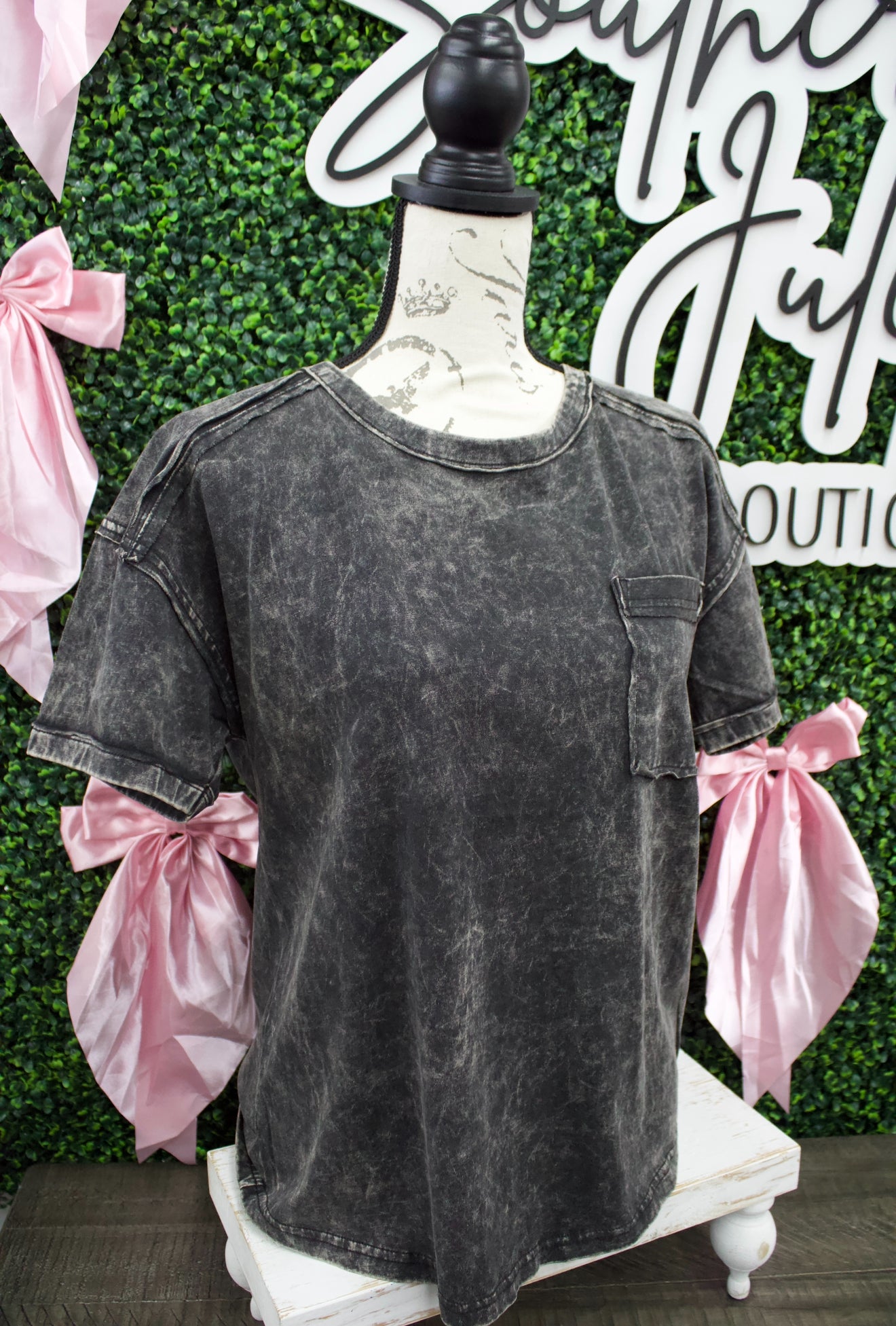 The Molly Acid Wash Tee boasts an edgy acid wash design and exposed seams for a unique twist on the classic round neck tee. The front pocket adds functionality, while the comfy material ensures all-day comfort. Perfect for effortlessly cool and comfortable style.