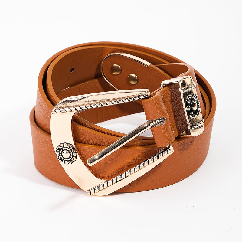 Engraved Buckle Faux Leather Western Belt - Gold Brown