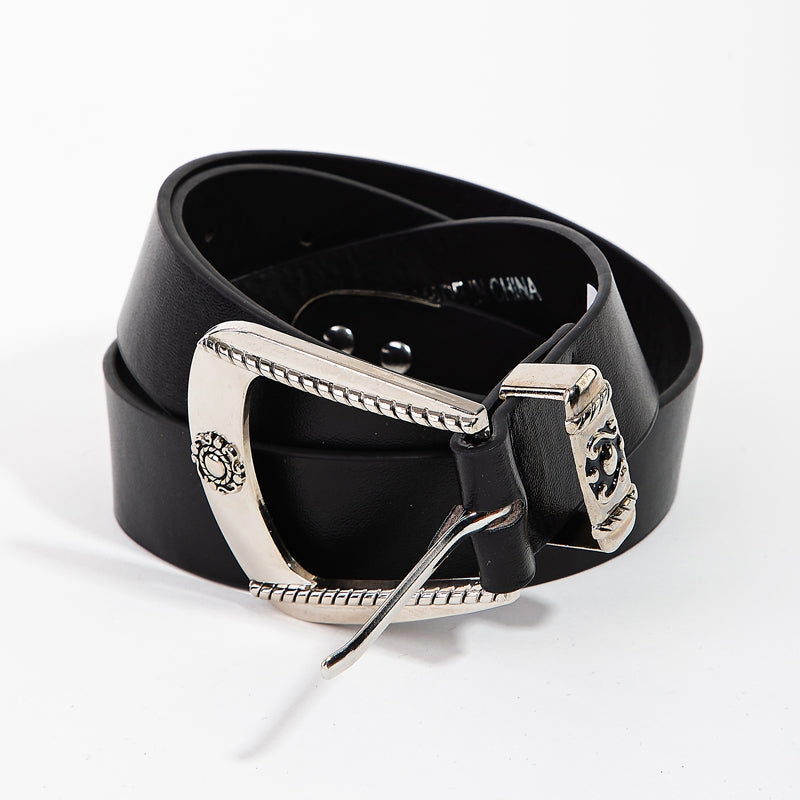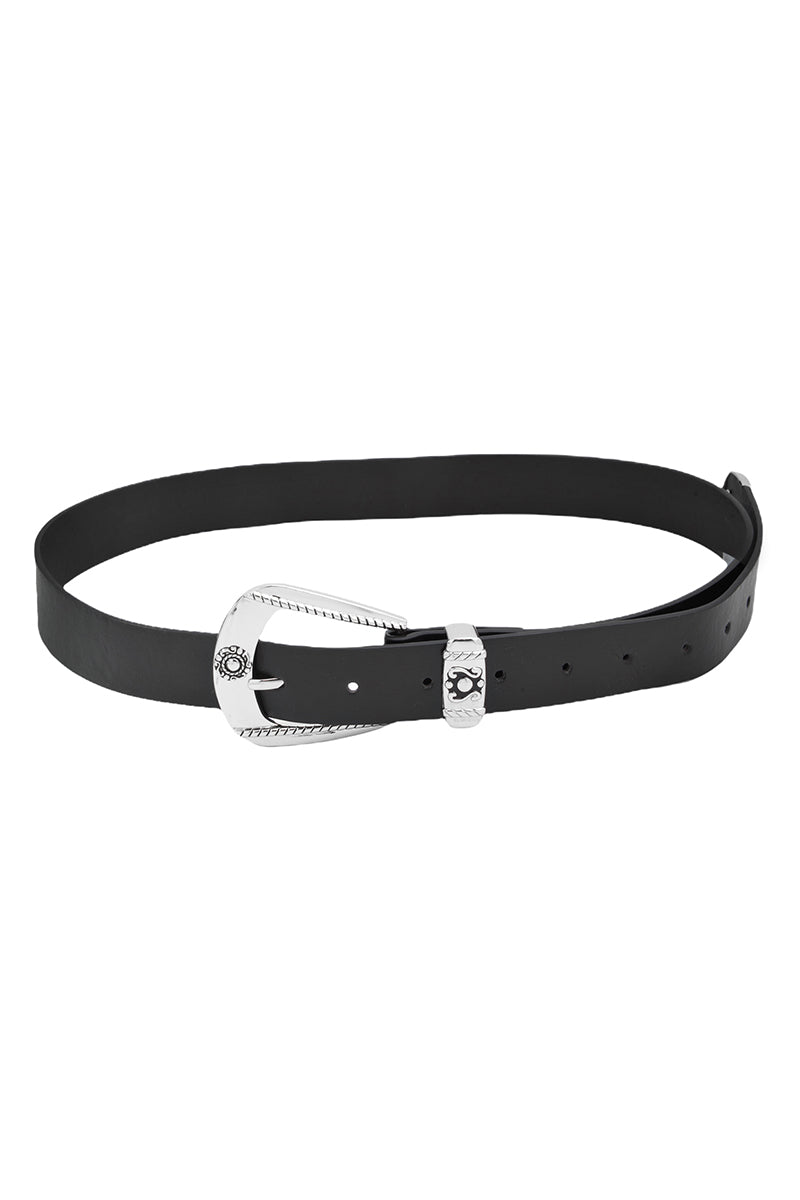 Engraved Buckle Faux Leather Western Belt - Silver Black