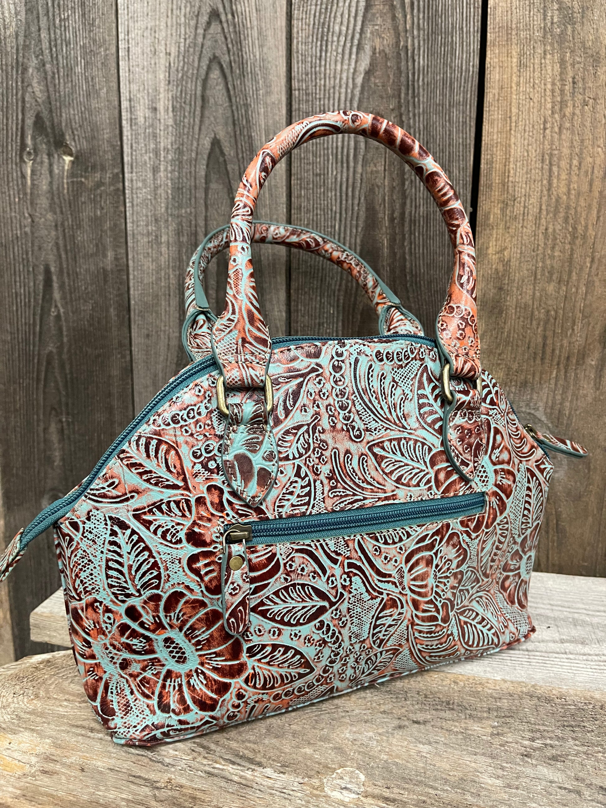 This adorable tooled leather bag can be paired with a formal or casual outfit.