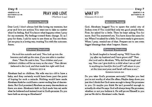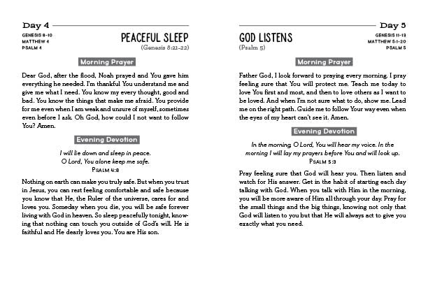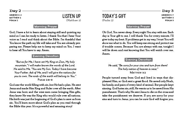 This delightful devotional, created especially for you, includes a simple plan for reading and praying through the Bible in one year alongside a 3-minute devotional reading for the morning and a 3-minute prayer for evening.