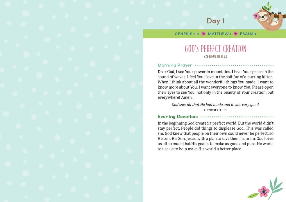 This delightful devotional, created especially for you, includes a simple plan for reading and praying through the Bible in one year alongside a 3-minute devotional reading for the morning and a 3-minute prayer for evening.
