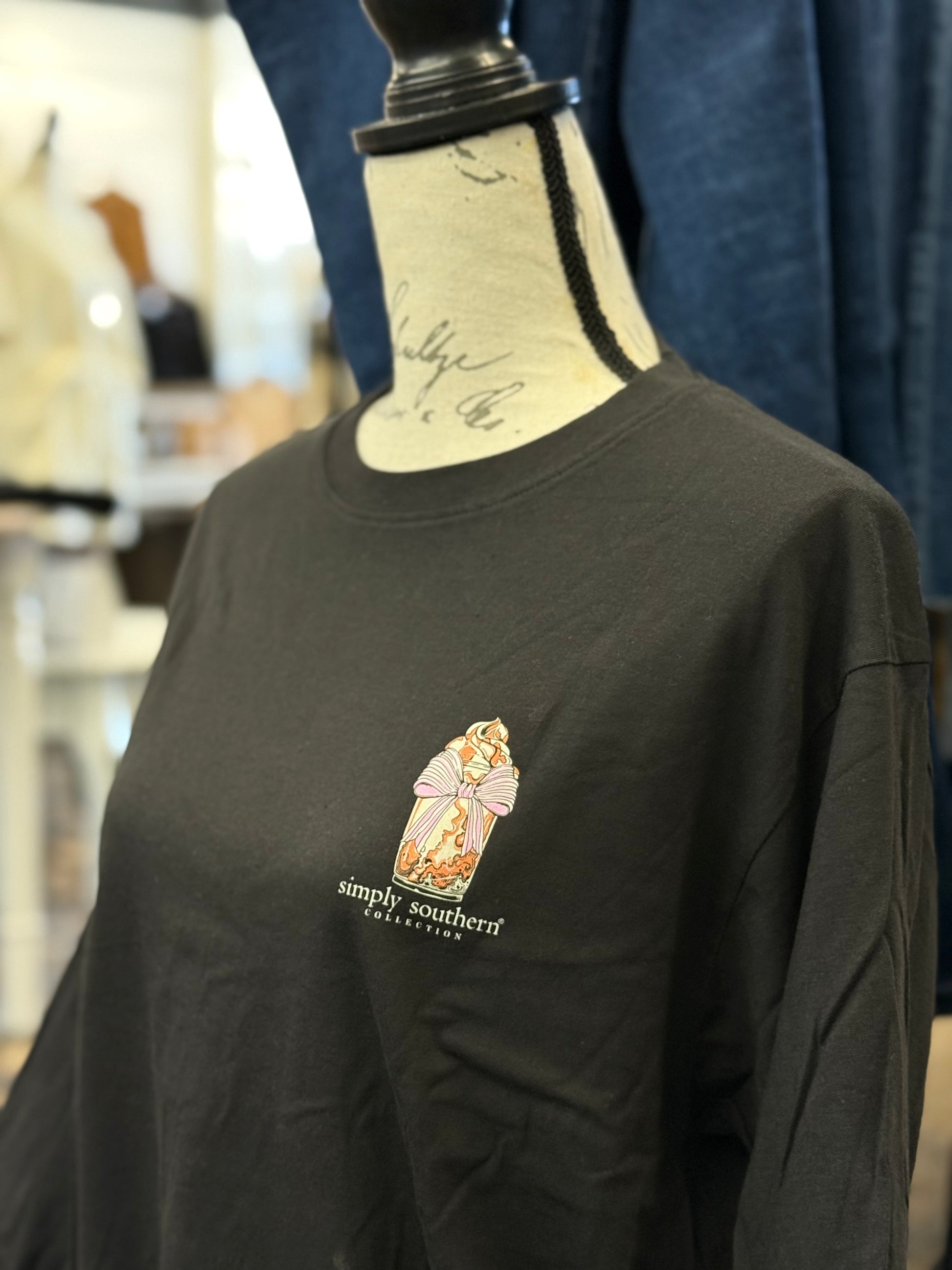 This cozy black long sleeve tee features the playful phrase "Coffee makes me much nicer" surrounded by an assortment of charming coffee drinks. The Simply Southern logo adds a sweet touch below the design, with a matching mini print on the left chest. Perfect for coffee lovers who want to show off their caffeine-fueled mood upgrade in style and comfort.