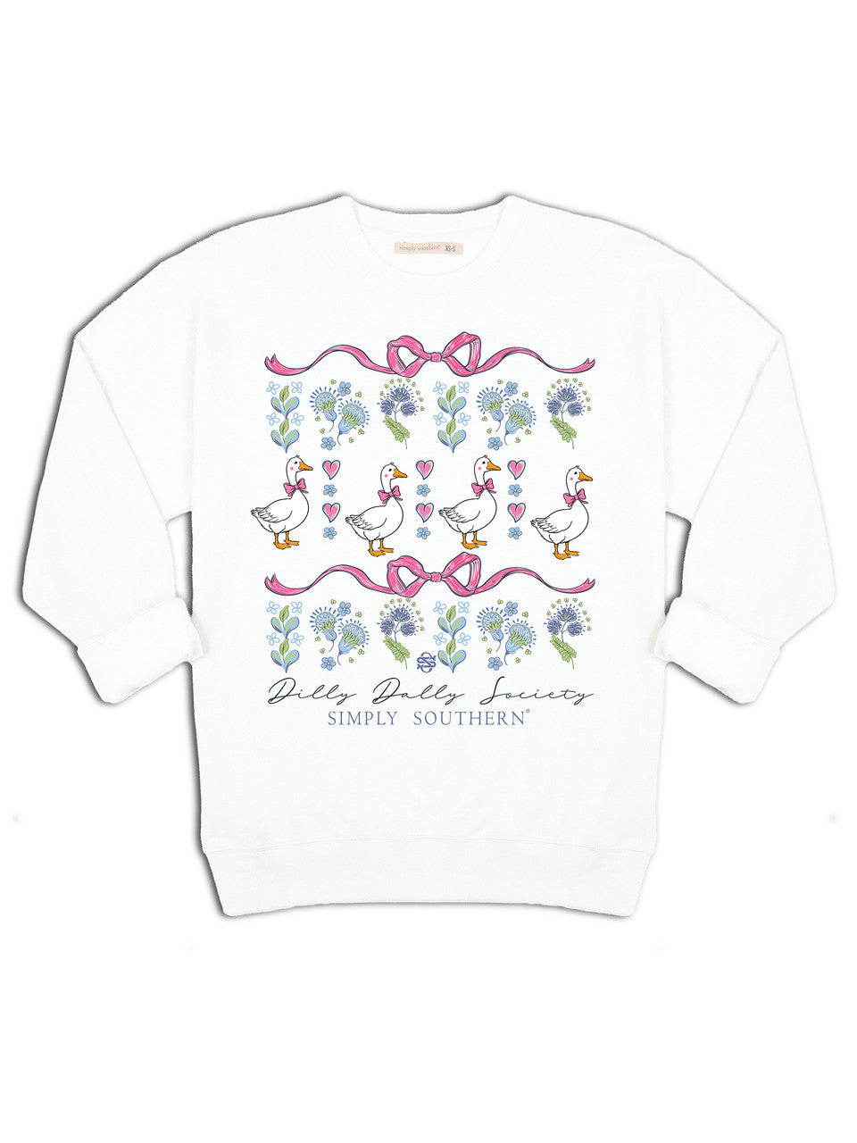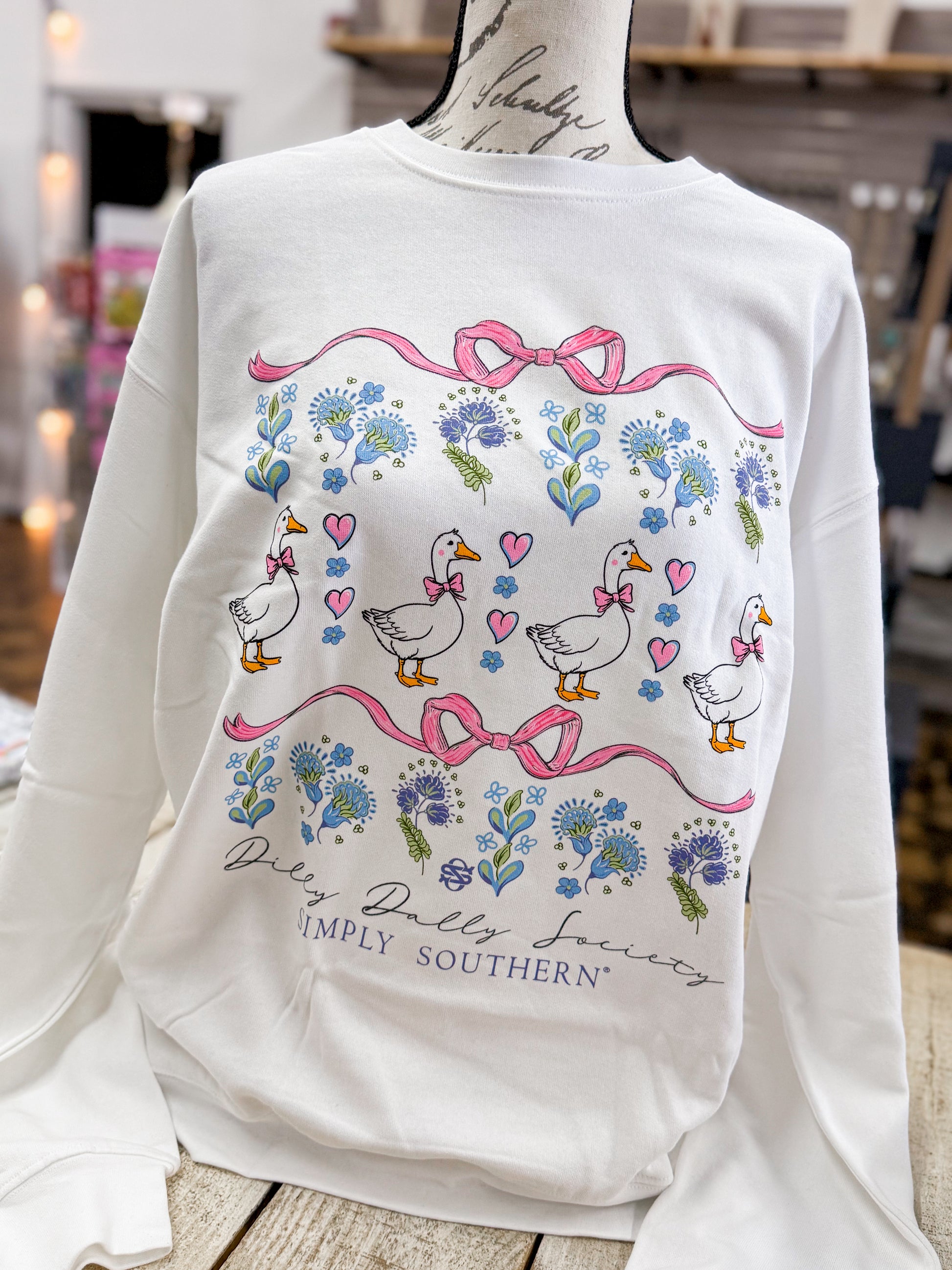This playful white long-sleeve crewneck features the charming phrase "Dilly Dally Society" alongside a delightful row of geese bordered with bows and flowers. Finished with the Simply Southern logo below, it’s perfect for adding a touch of whimsy and comfort to your casual wardrobe.