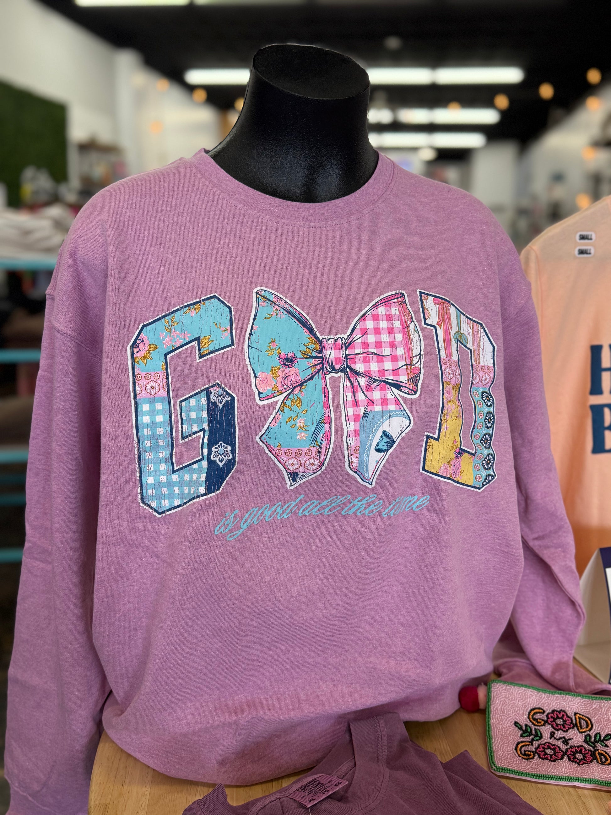 Brighten your wardrobe with this playful bubblegum pink crewneck featuring the uplifting phrase "God is good all the time." The word "God" stands out with charming quilted letters and a bow-shaped "O," adding a fun, textured detail. Perfect for spreading positivity while keeping cozy and stylish all day long.