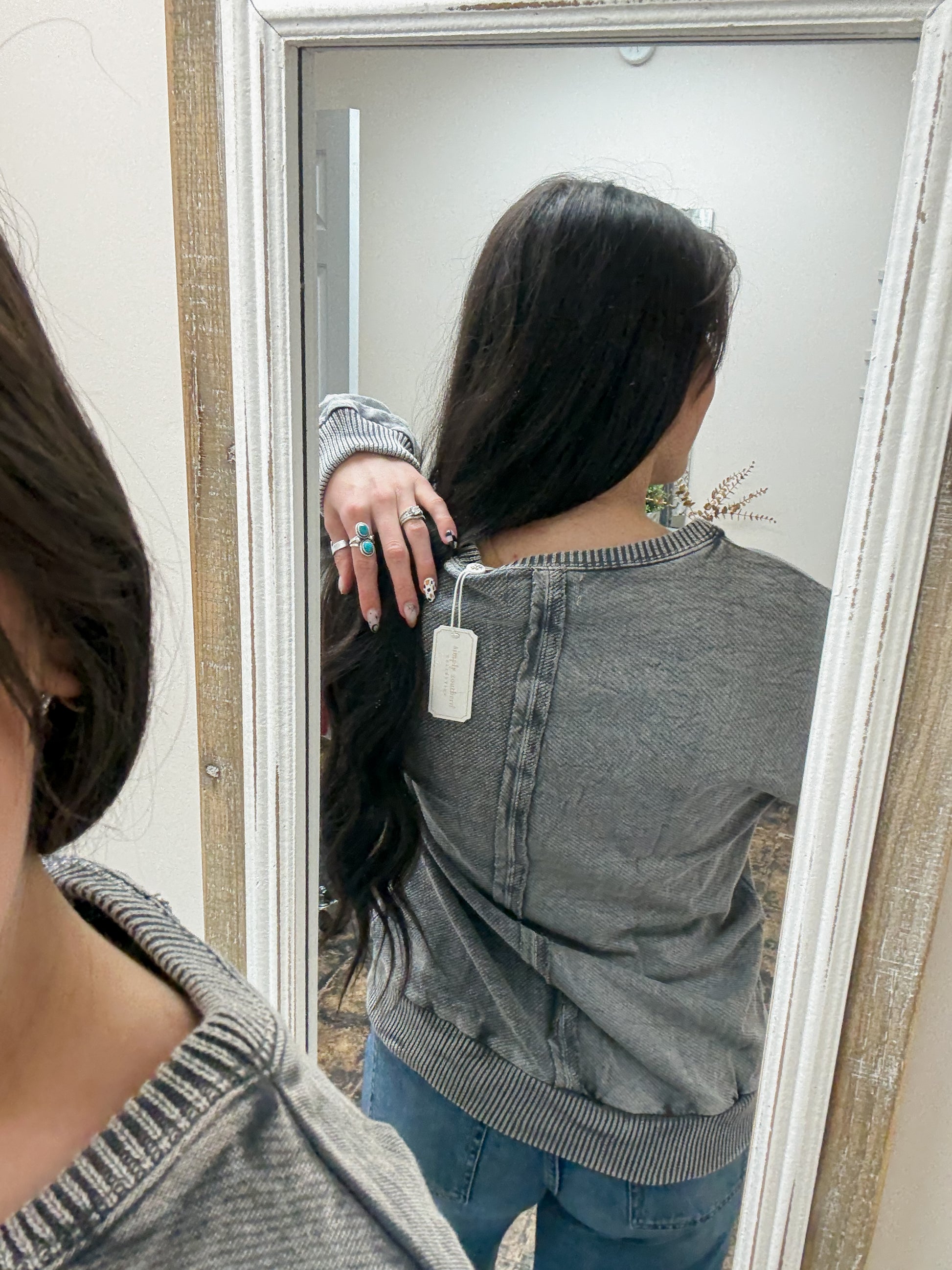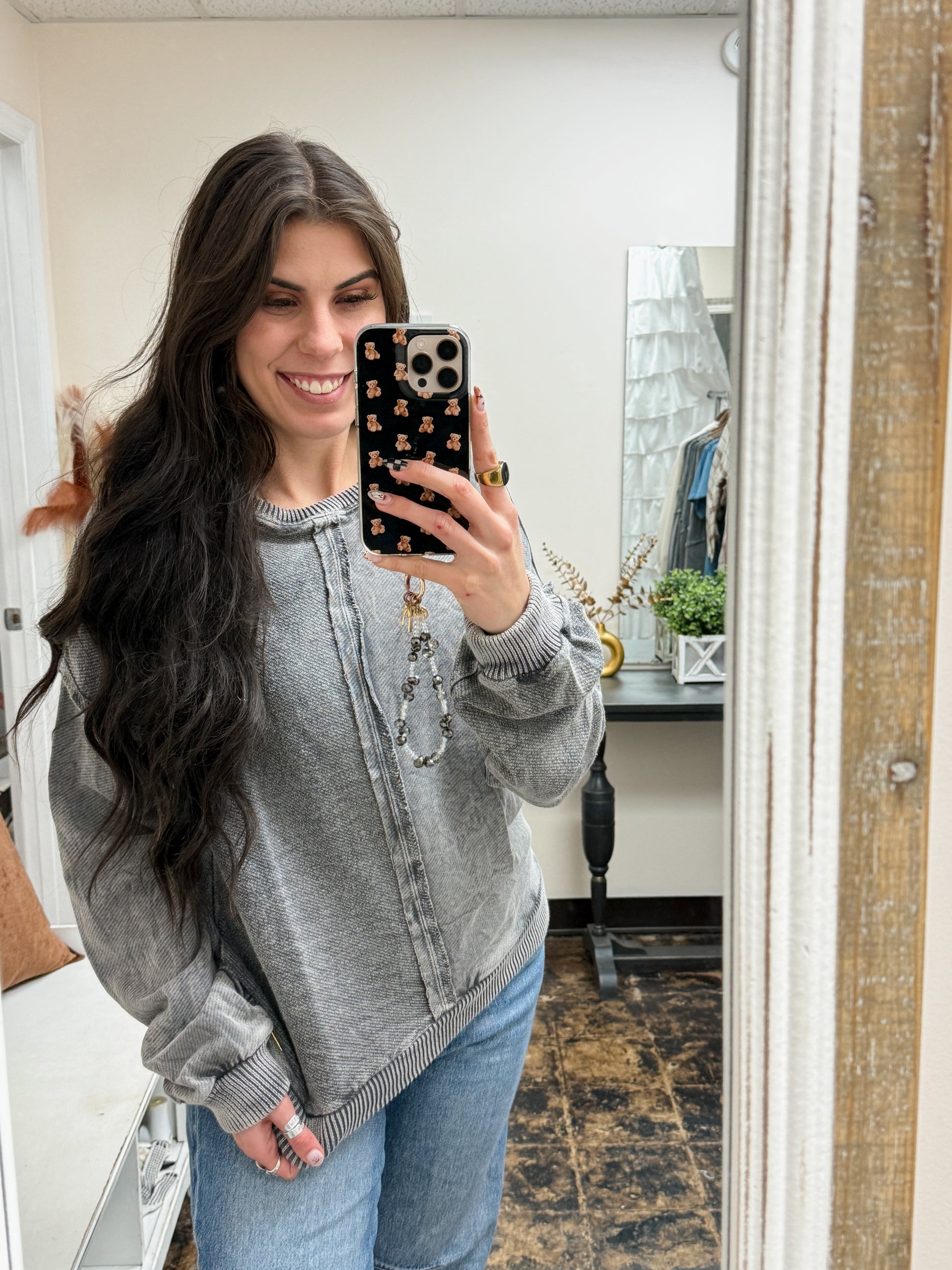 This Simply Southern Leona Pullover in Lead features a premium French Terry fabric with a unique acid wash finish for a vintage-inspired look. Its slightly oversized fit ensures comfortable layering and relaxed wear. Raw exposed seams add an edgy, deconstructed touch, combining casual style with subtle craftsmanship for a versatile wardrobe staple.
