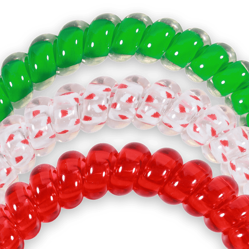 Secret Santa Small Hair Ties in Red, Green, and Clear offer a strong grip without damage, doubling as a chic wrist accessory when not in use. Your new favorite hair essentials all year round.