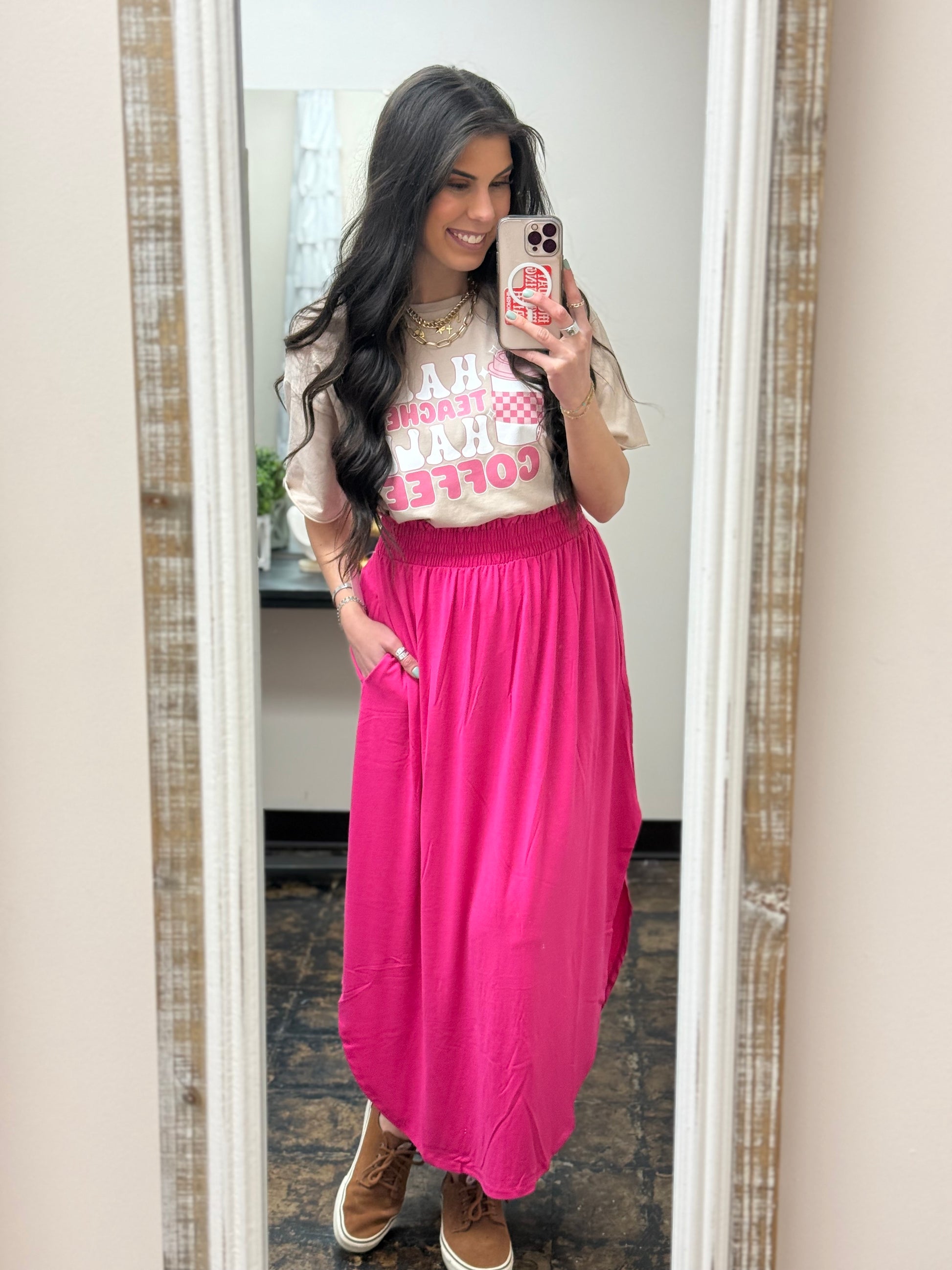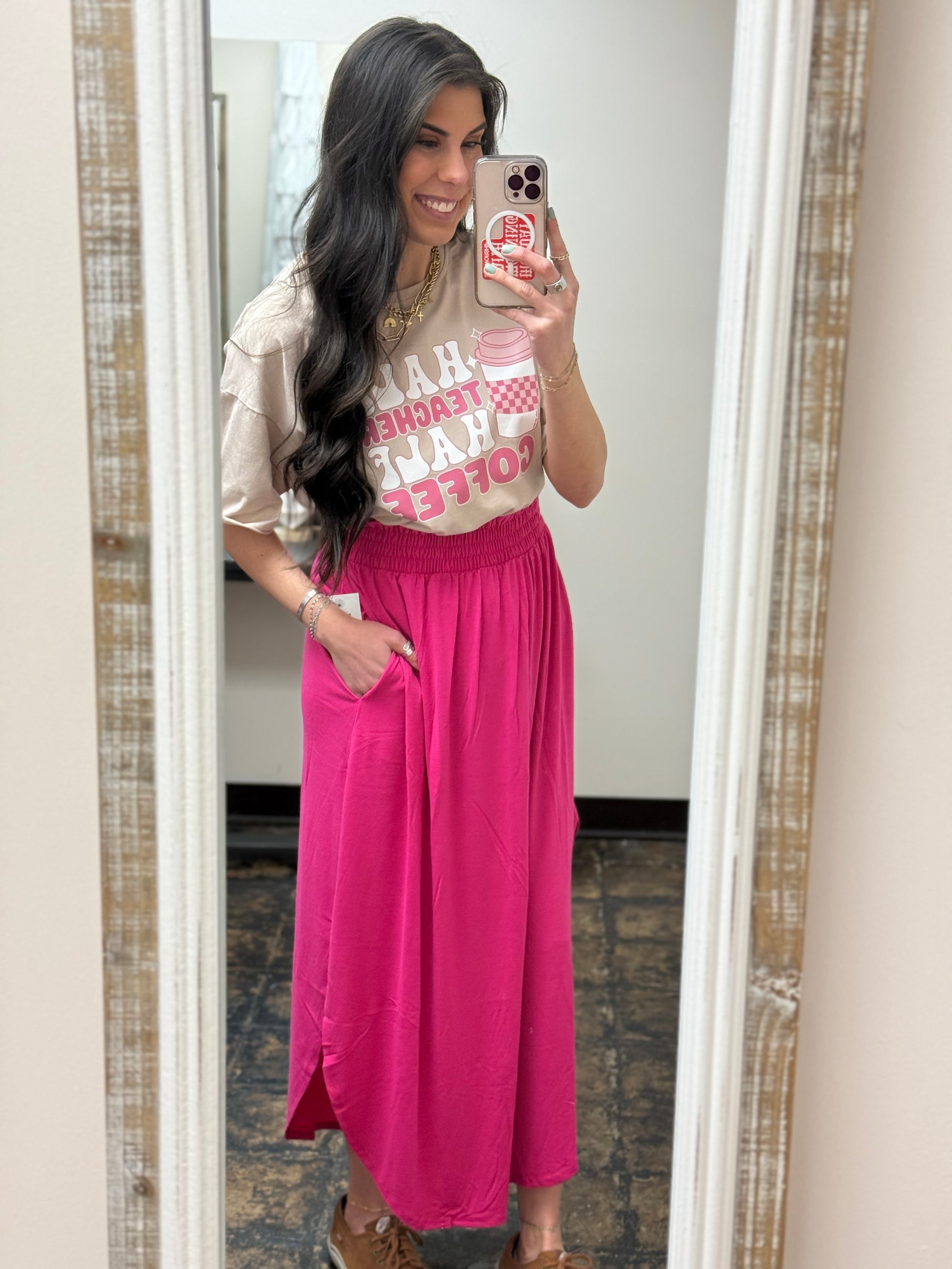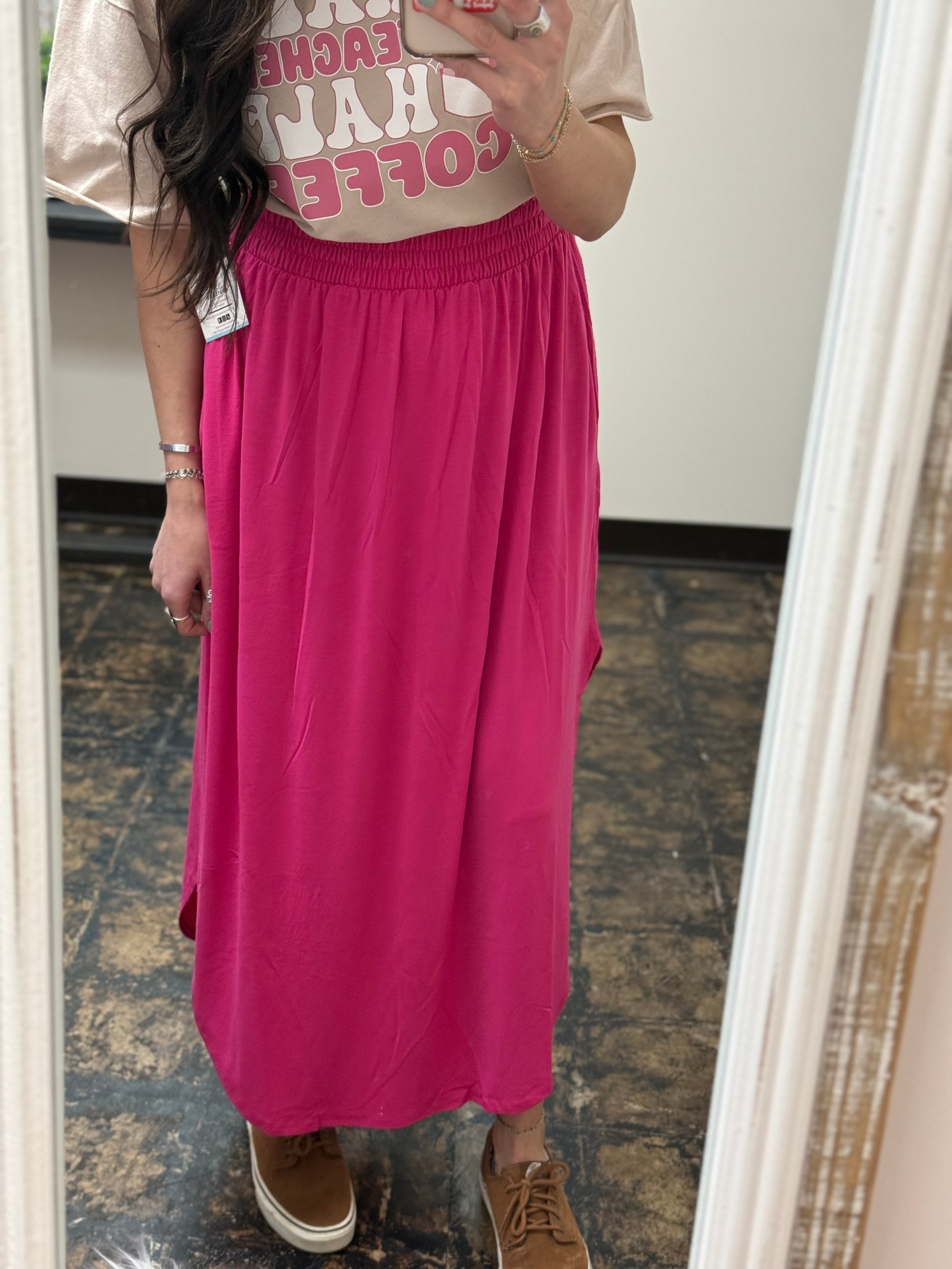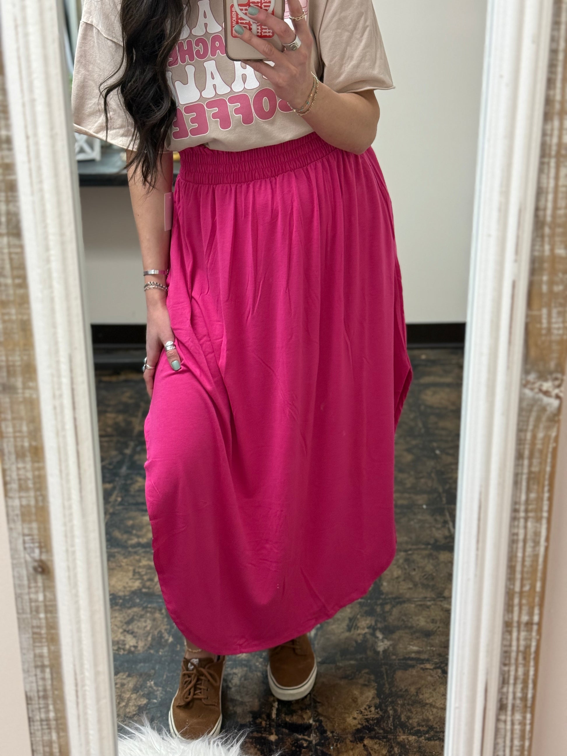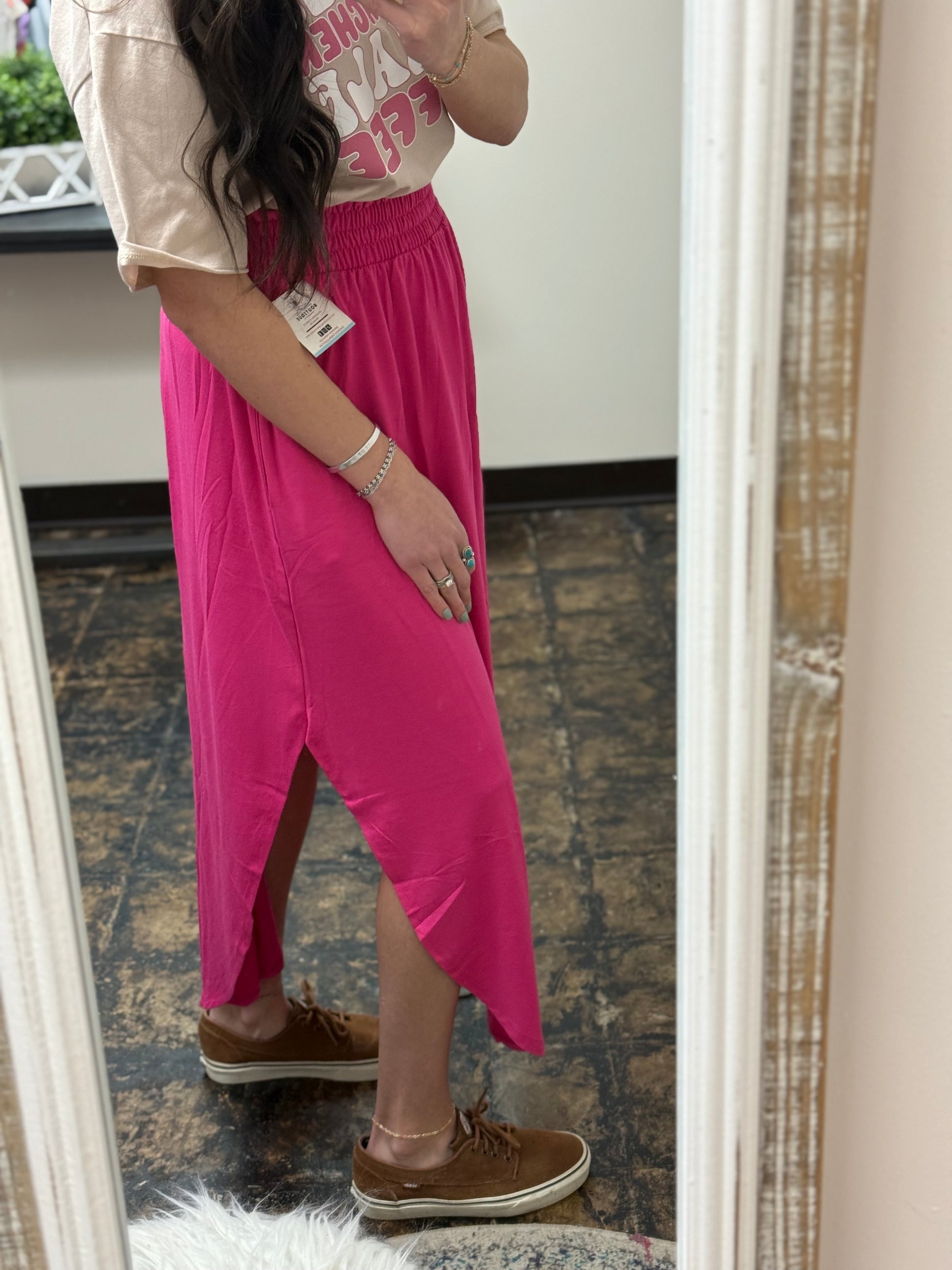 This simple smocked waist pocketed skirt features a flowy design with a classy side slit and a round hemline. She pairs great with your fave bodysuit, crop top or graphic tee. Layer it with a blazer or jacket to finish off your look!