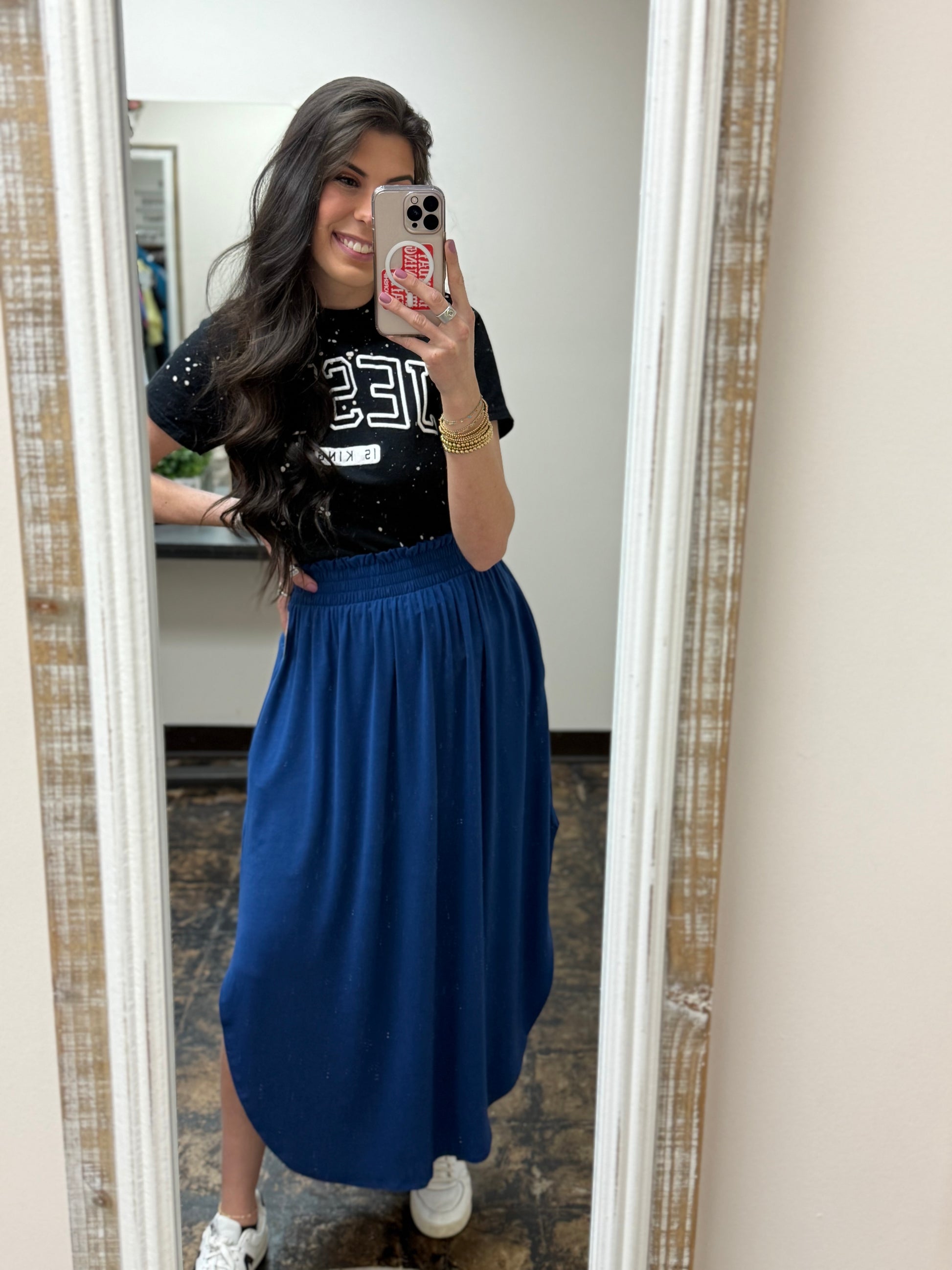 This simple smocked waist pocketed skirt features a flowy design with a classy side slit and a round hemline. She pairs great with your fave bodysuit, crop top or graphic tee. Layer it with a blazer or jacket to finish off your look!