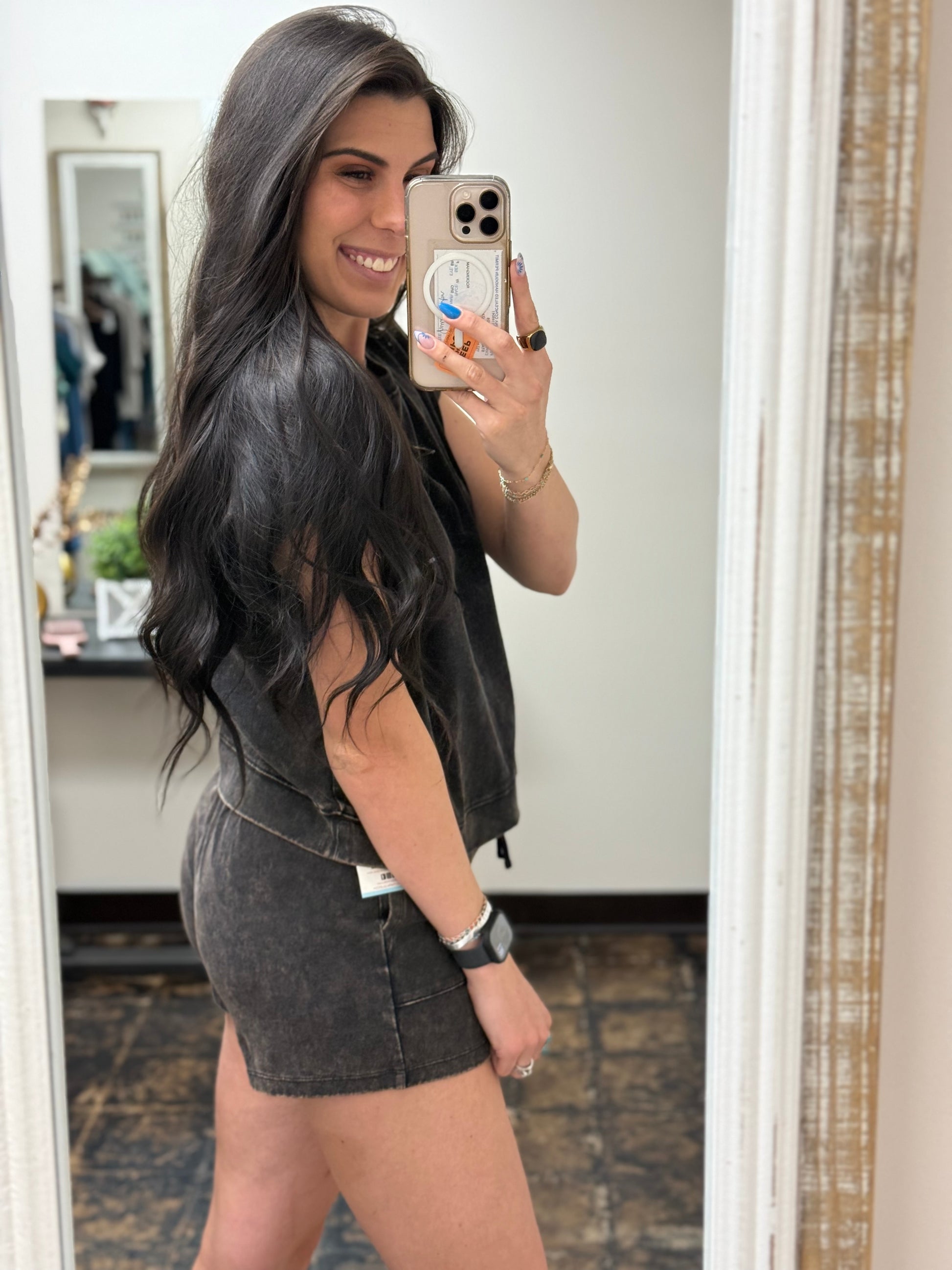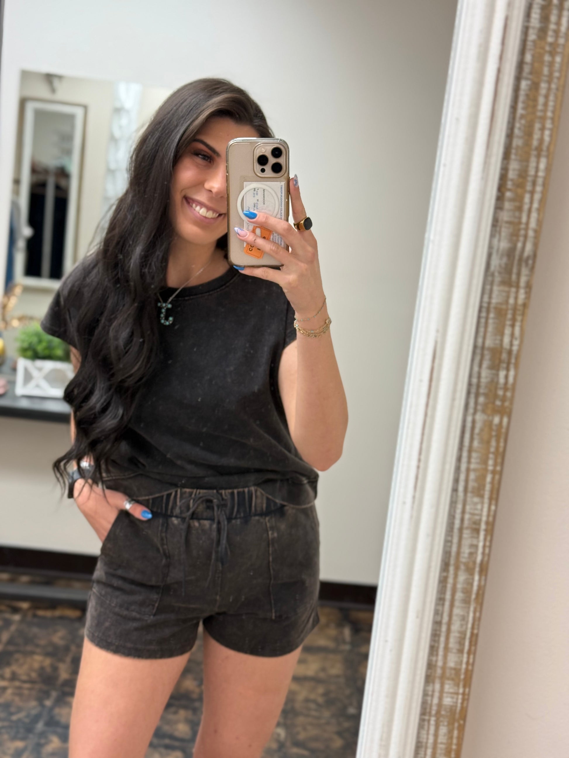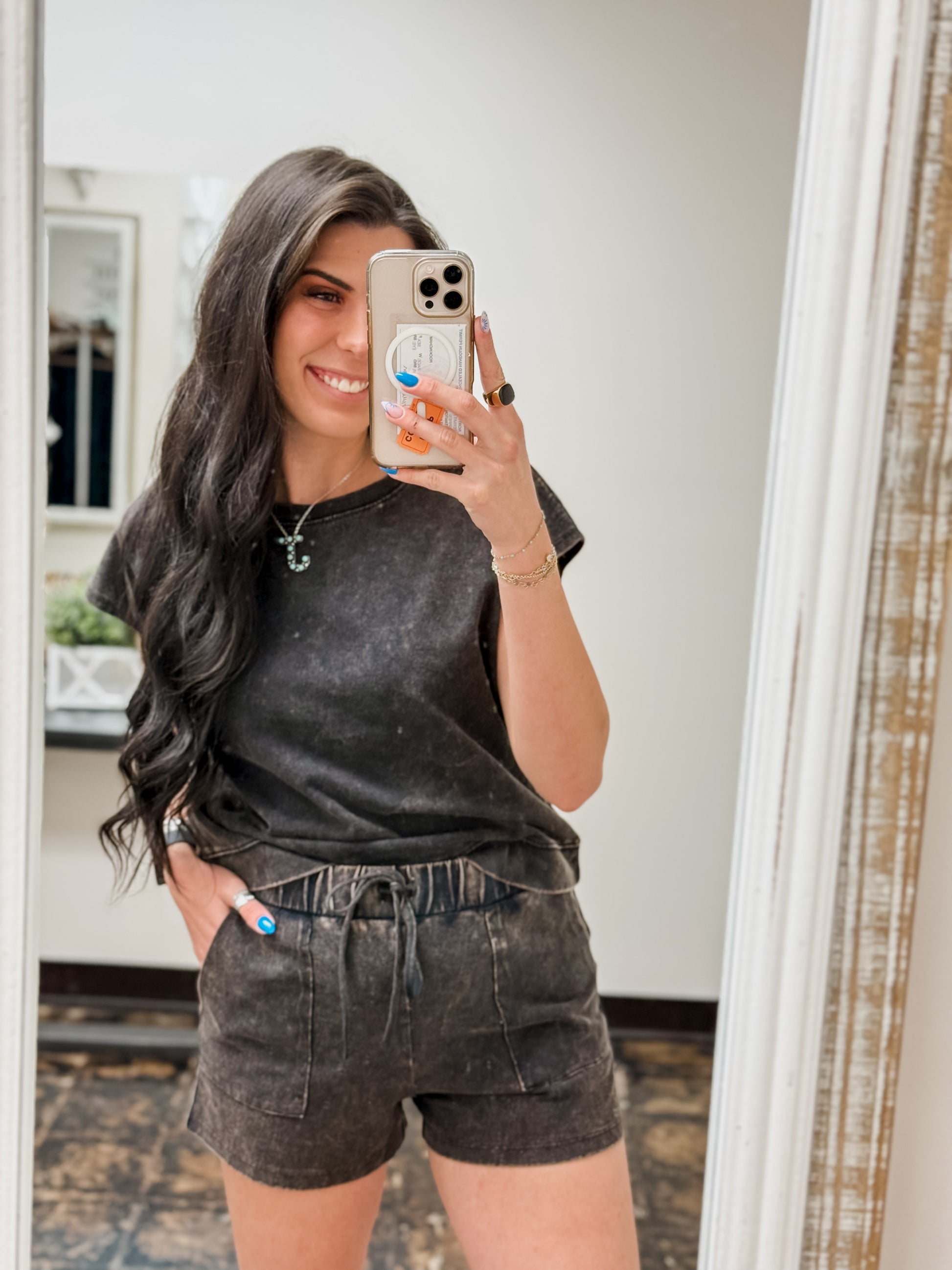 Stay cool and comfy in the Andie Set – Ash Black. This premium cotton sleeveless top features a relaxed round neck, perfect for easy, breezy days. Pair it with matching shorts that have an elastic waistband and drawstring for a snug, adjustable fit. Whether lounging or out and about, this set keeps you feeling fresh and effortlessly stylish.