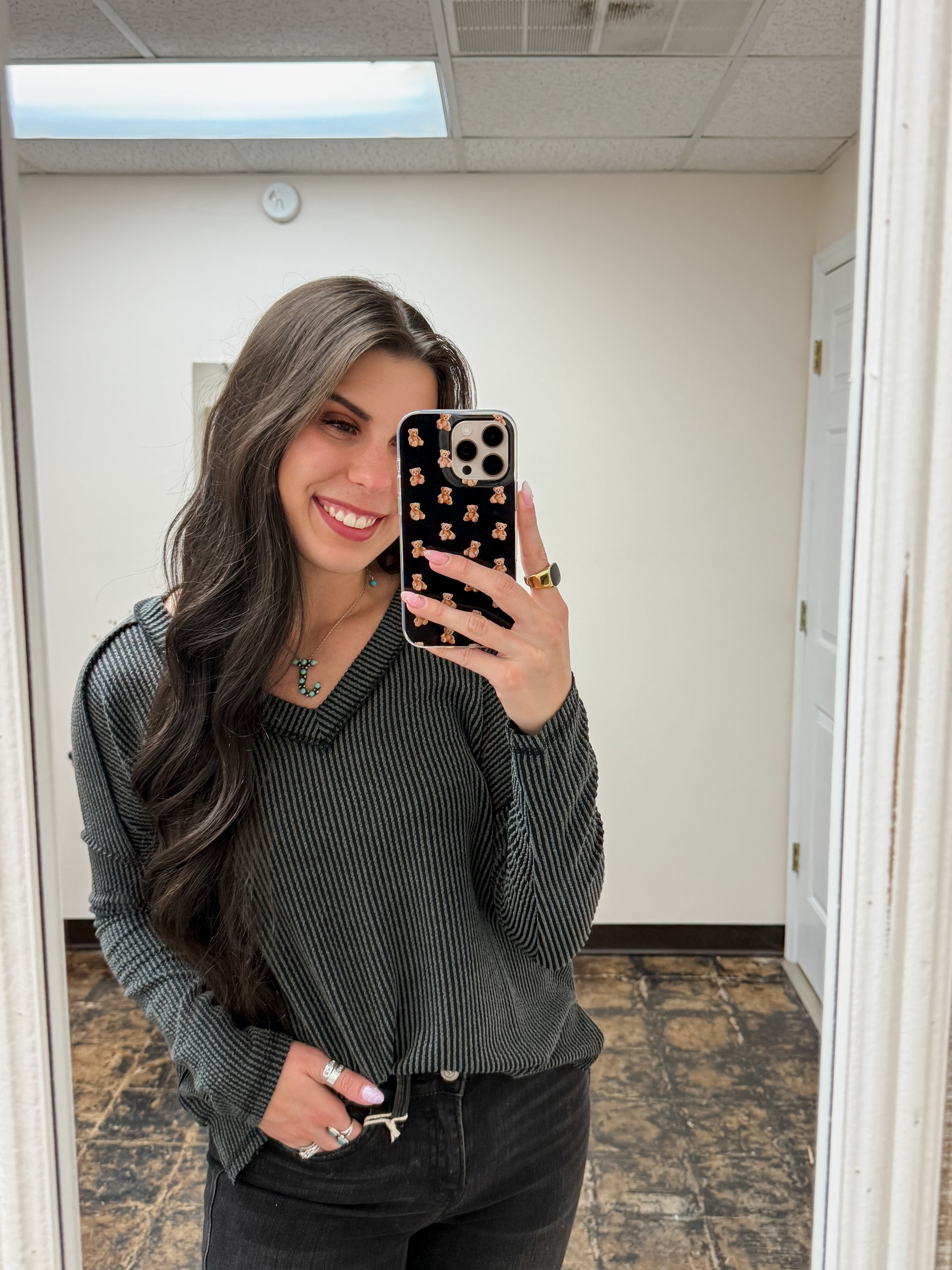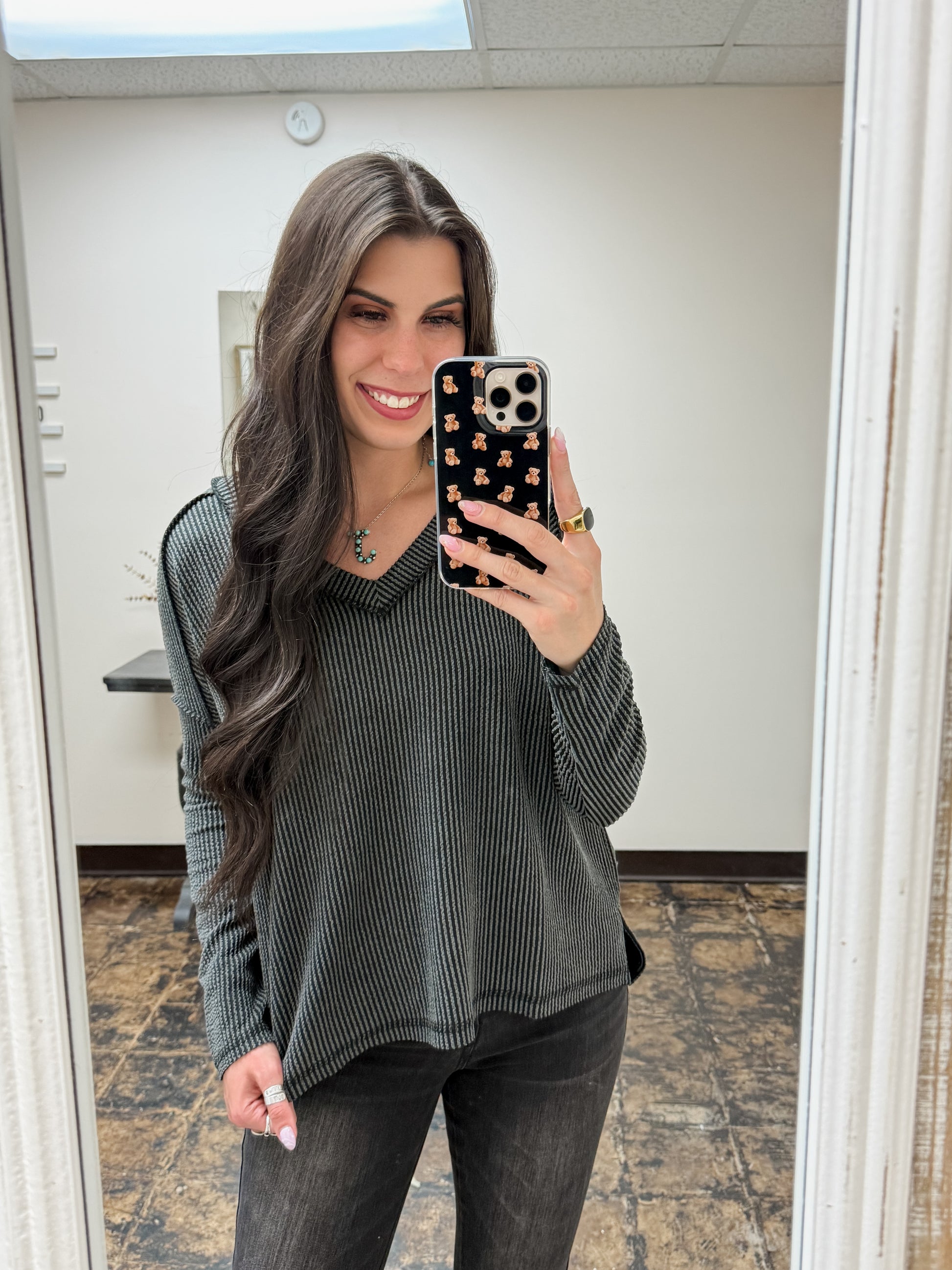 Stay cozy and stylish in The Ansleigh Corded Long Sleeve Top. With its playful hi-low V-neck and relaxed fit, this top moves with you all day long. The exposed seam adds a cheeky touch of detail, making it perfect to dress up or keep chill. Easygoing comfort never looked so good!