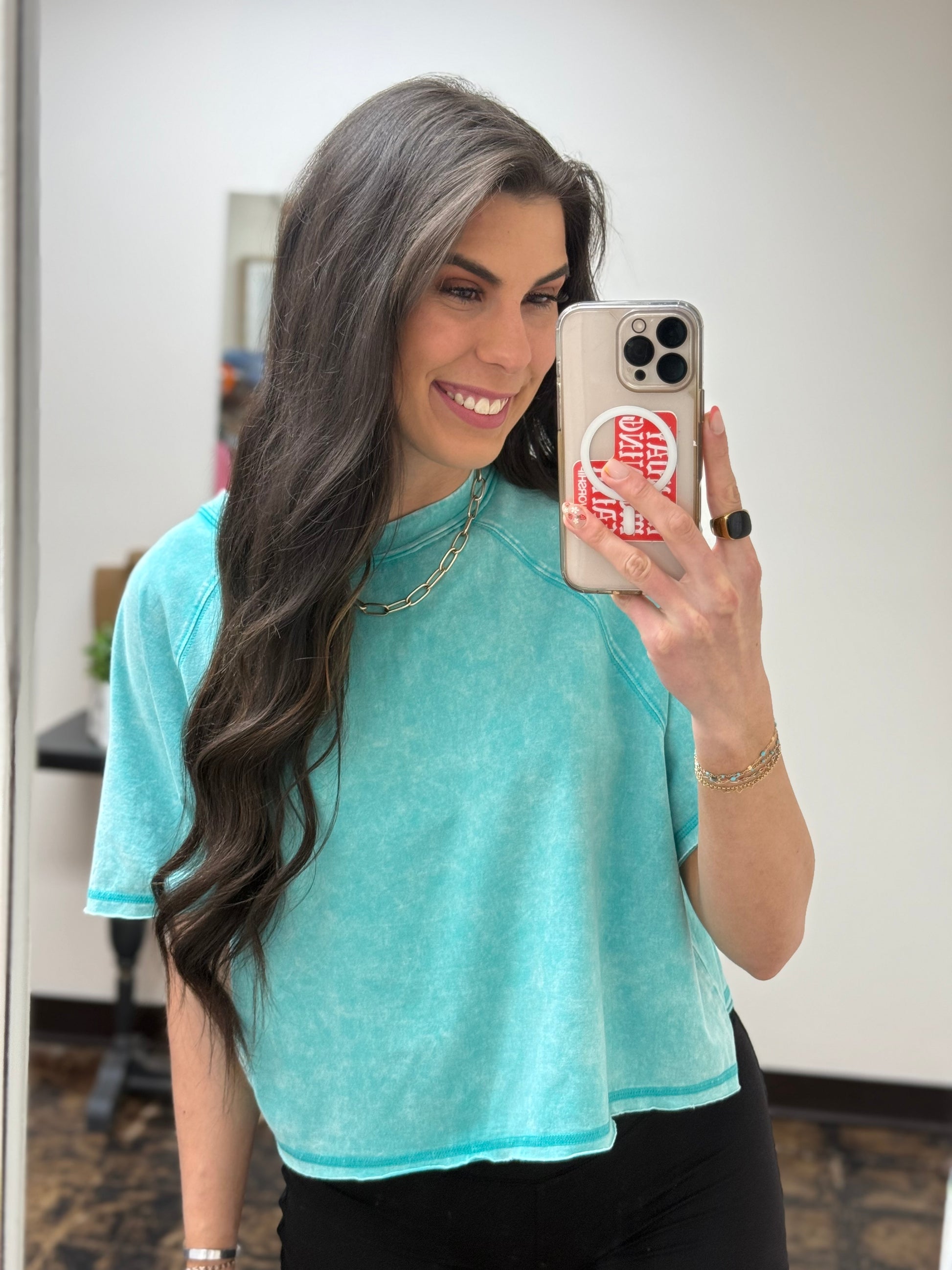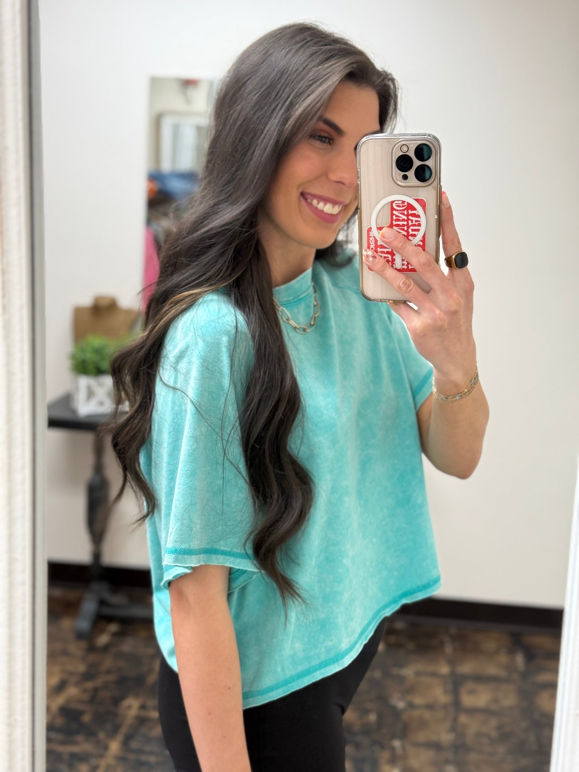 The Audrey Acid Wash Cropped Tee - Turquoise