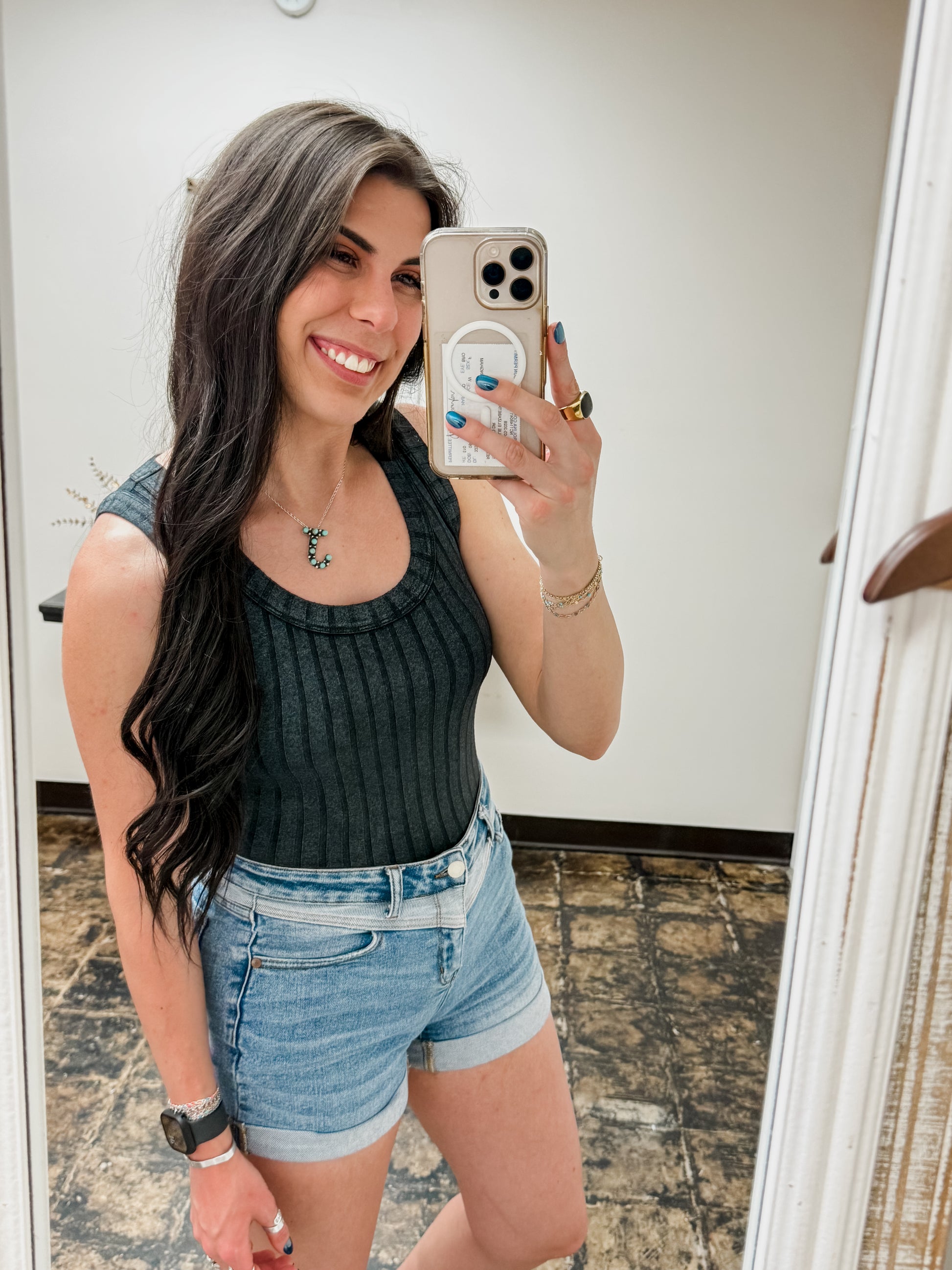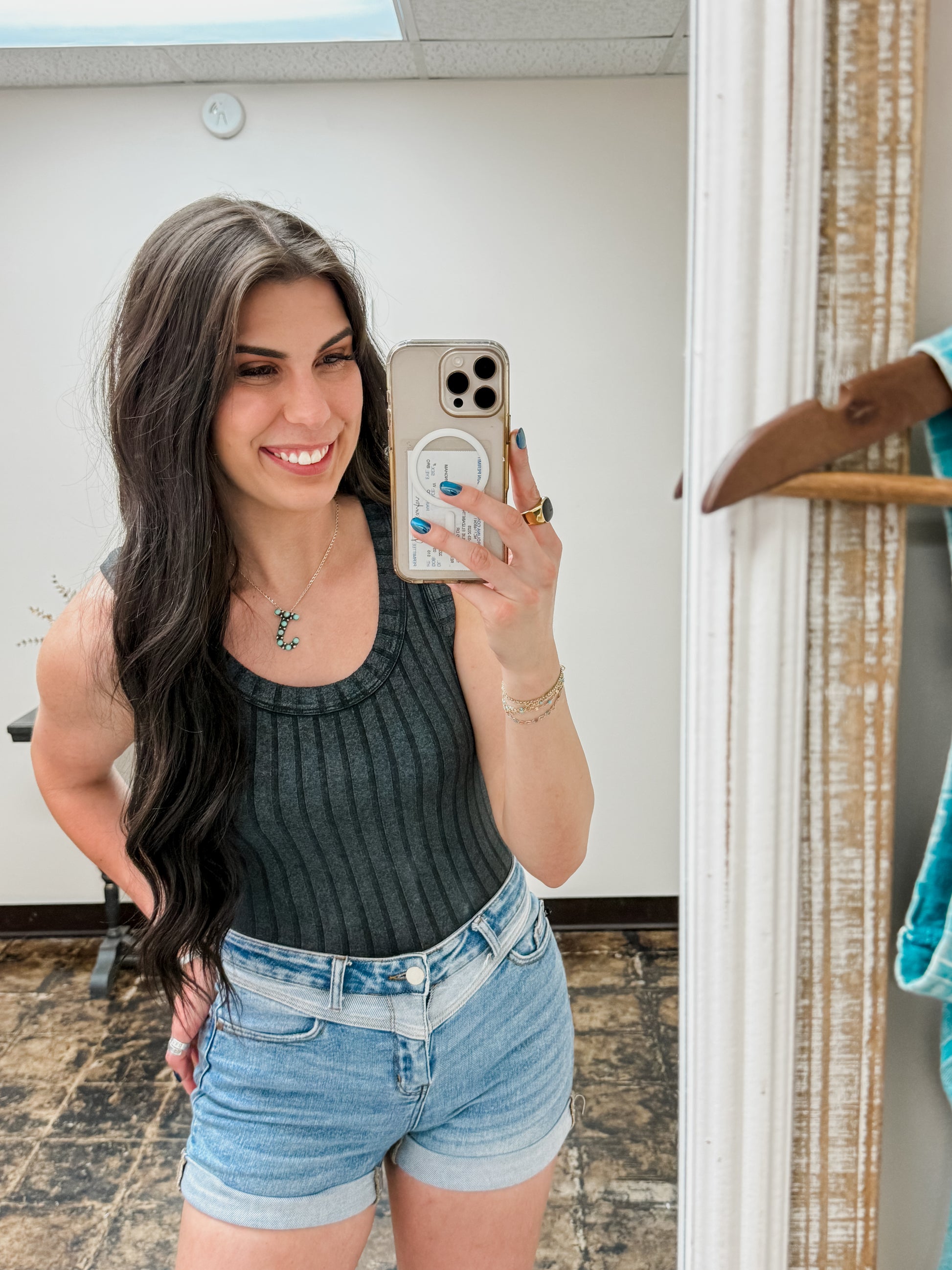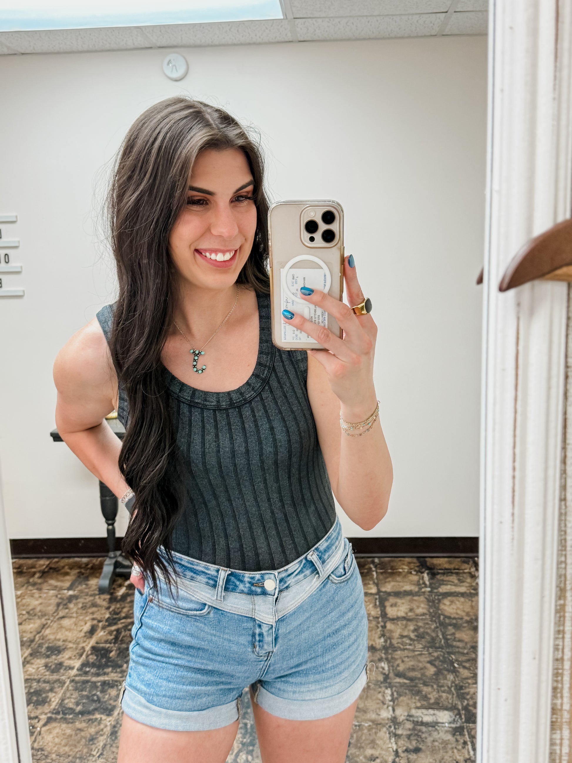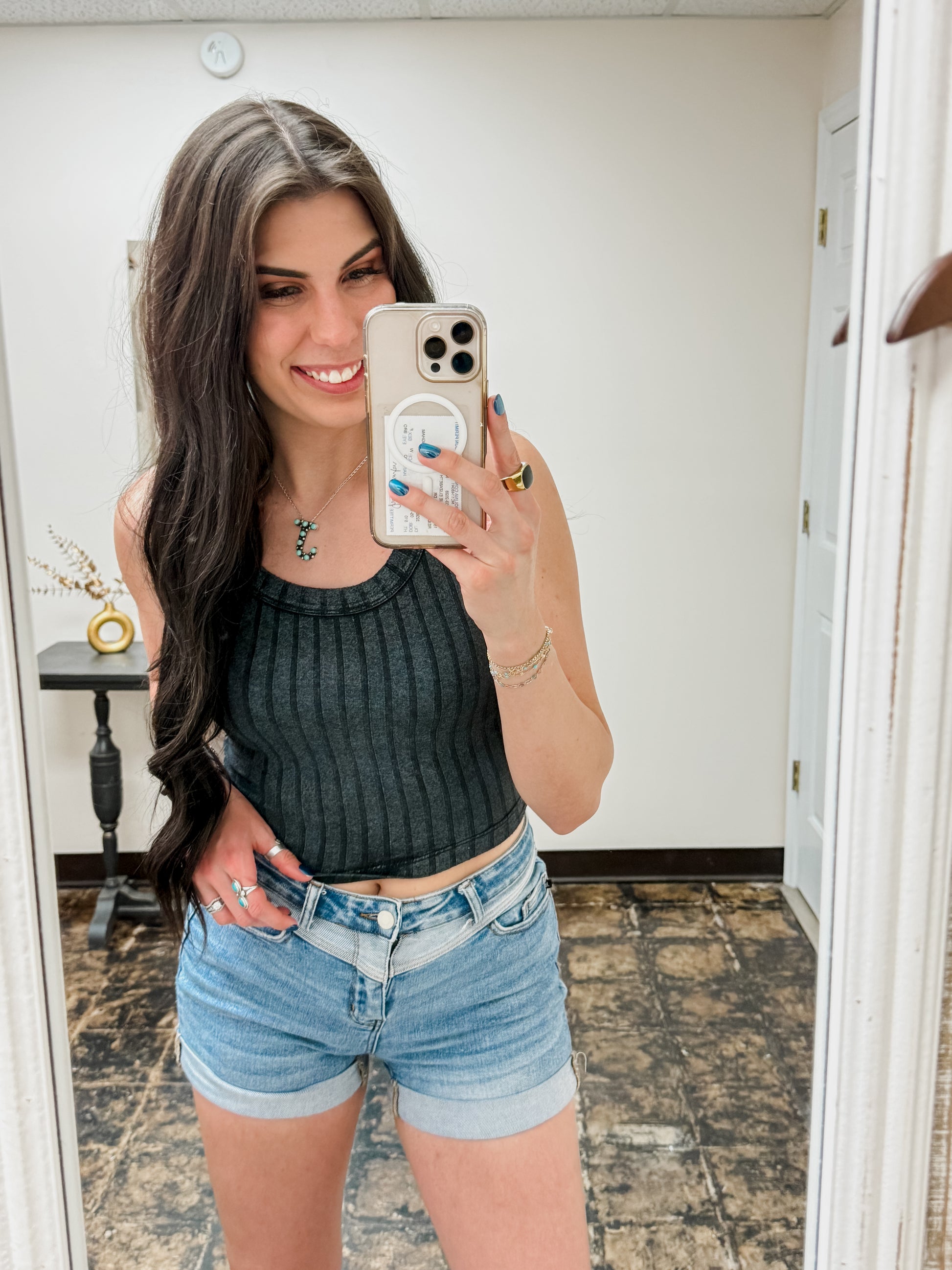 The Briella Top in Ash Black is a fun, ribbed sleeveless tank with a flattering scoop neck and a trendy cropped cut. Each top features a unique back patch, making every piece one-of-a-kind with slight color and finish variations. Perfect for adding a playful edge to your casual wardrobe!