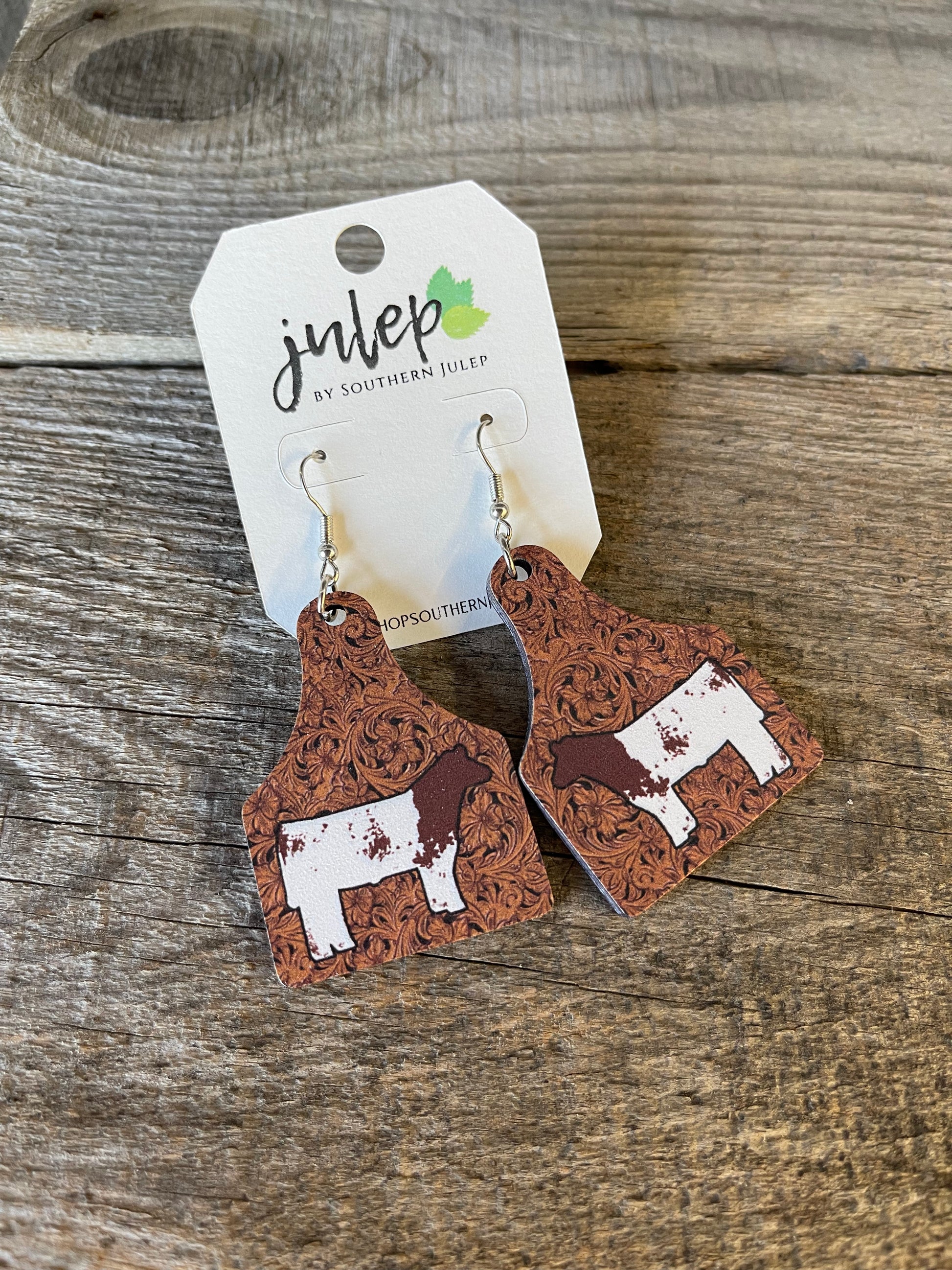 Western style ear tag shaped wood dangle earrings with printed leather look finish background and a brown & white cow.