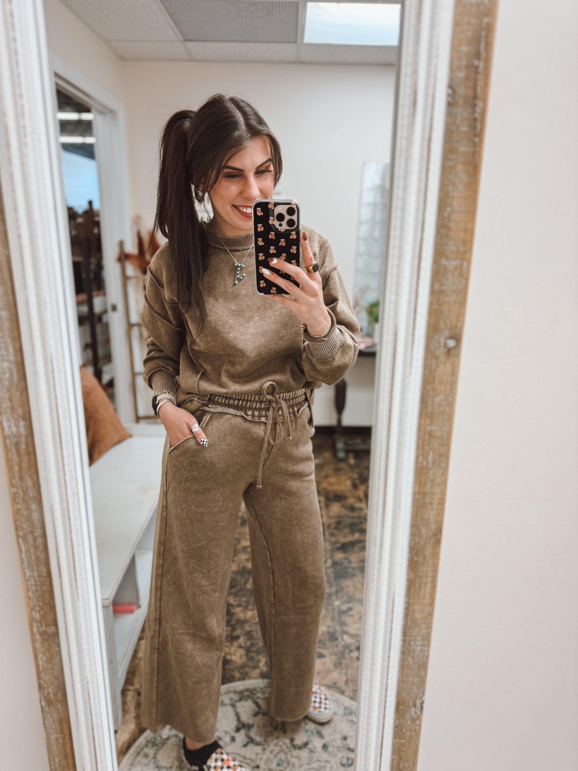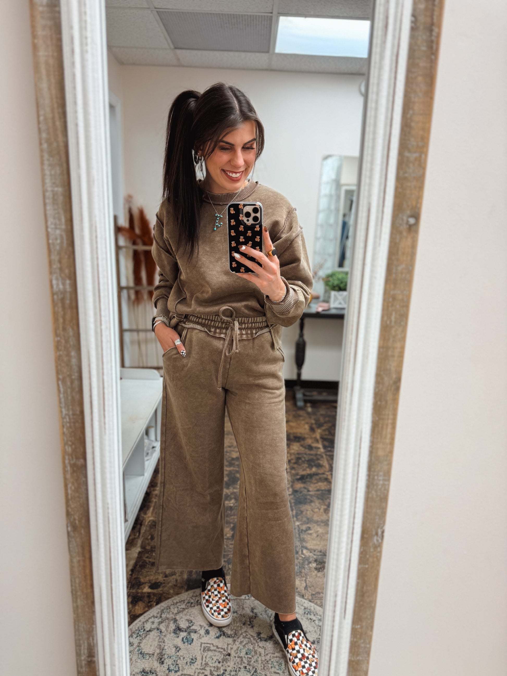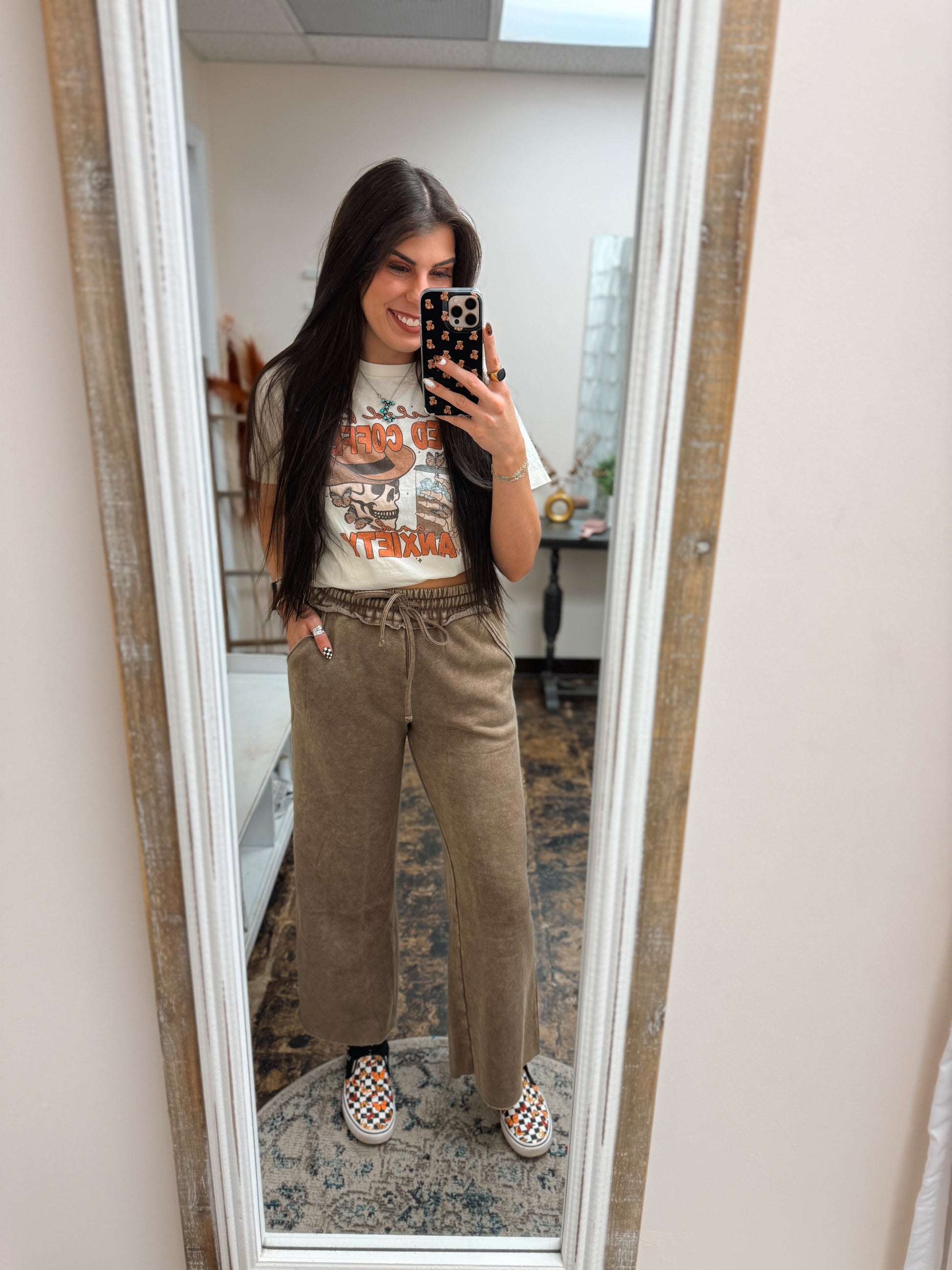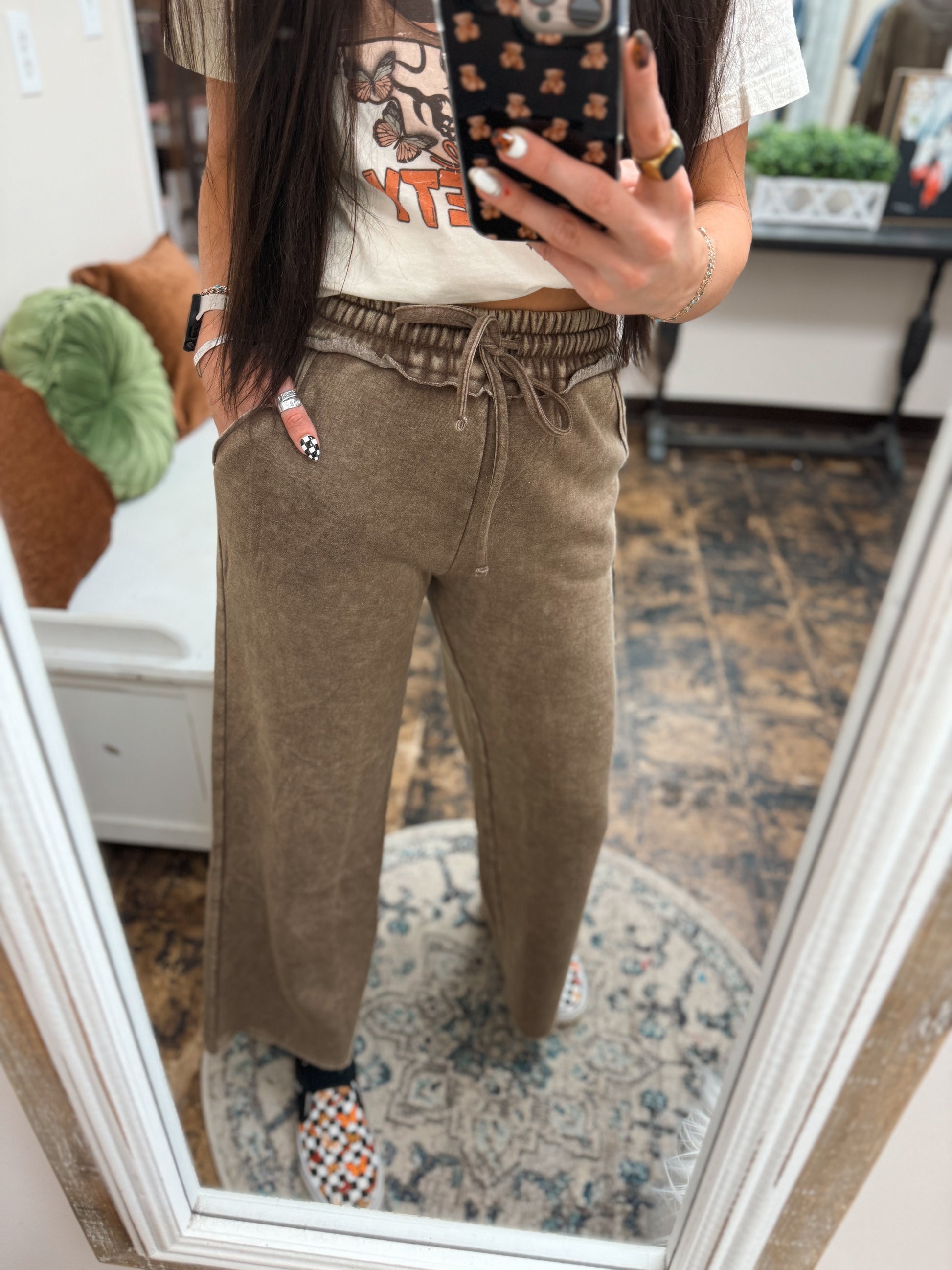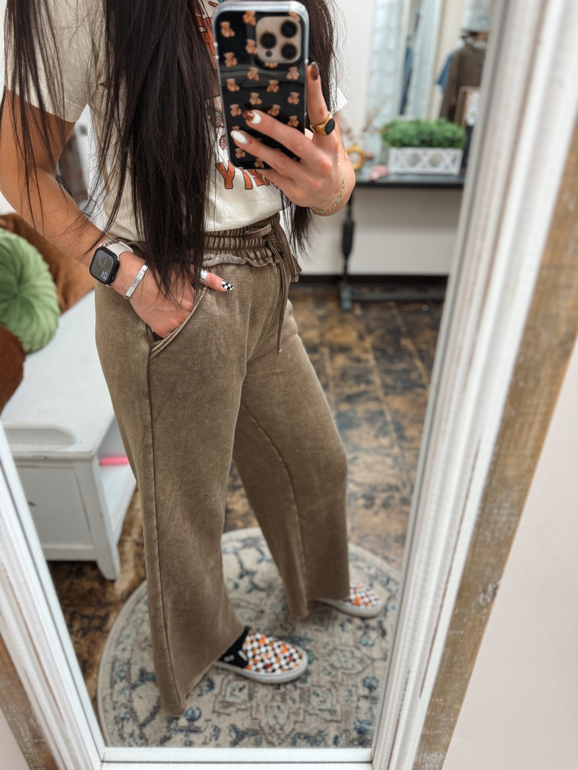 Elevate your loungewear game with The Cambree Palazzo Sweatpants. Made with comfy sweatpants material, the acid wash adds a stylish touch. The elastic waistband ensures a comfortable fit while the exposed seams and pockets add edgy details. Perfect for both relaxation and running errands.
