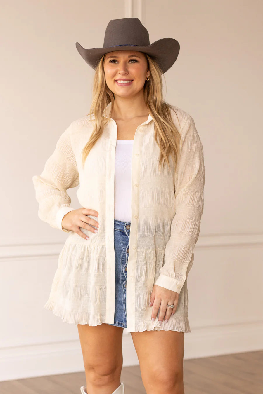 Give yourself the gift of versatility with our Gauzy Button Up Tunic. The lightweight gauzy fabric makes this the perfect layering piece for summer. Whether you need cover up for the beach or a casual top for effortlessly stylish looks, this piece has you covered.