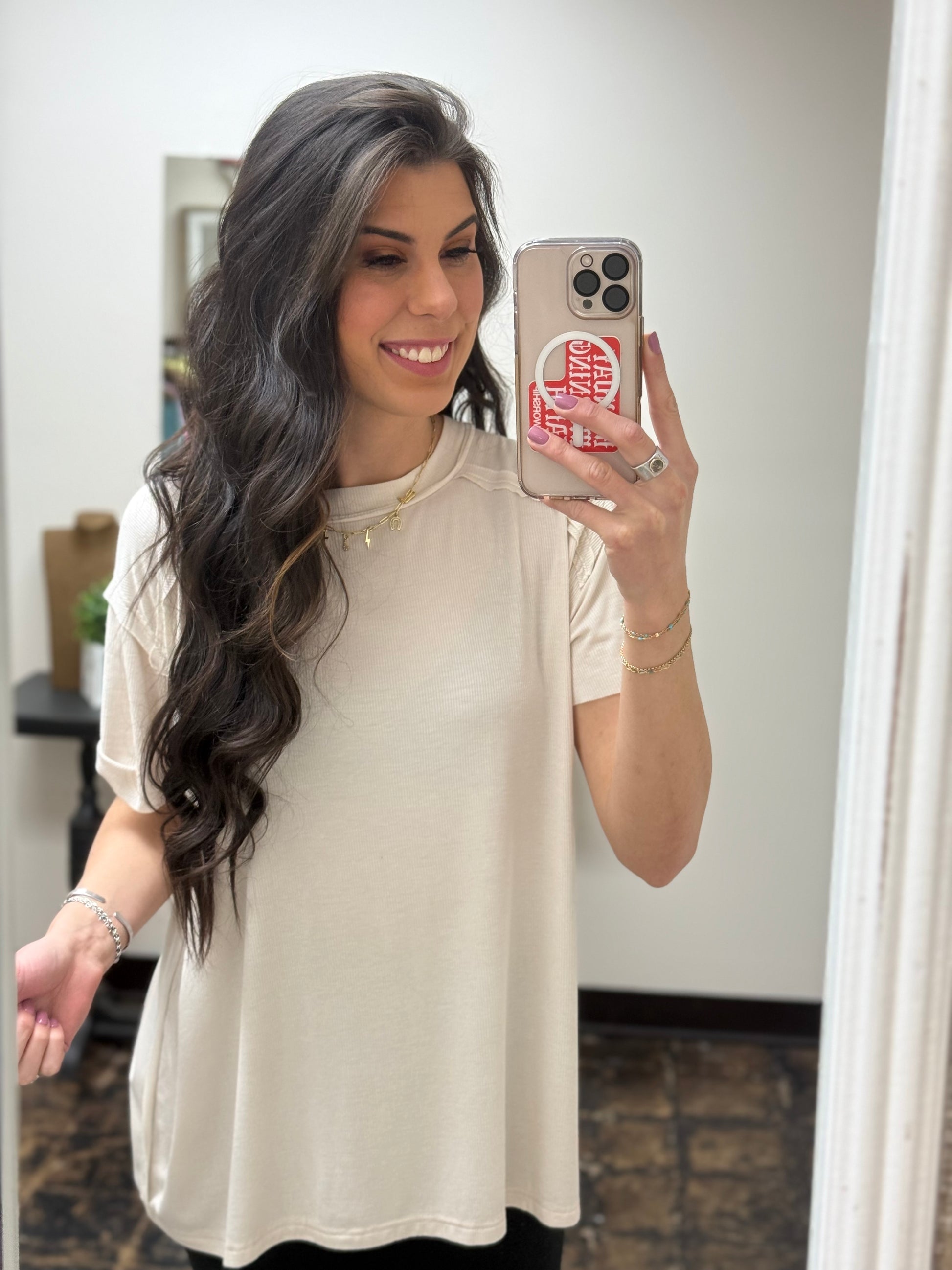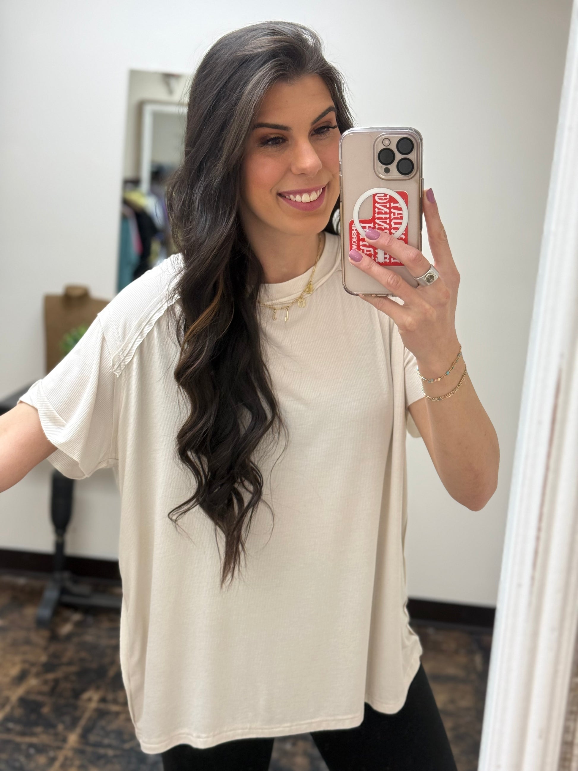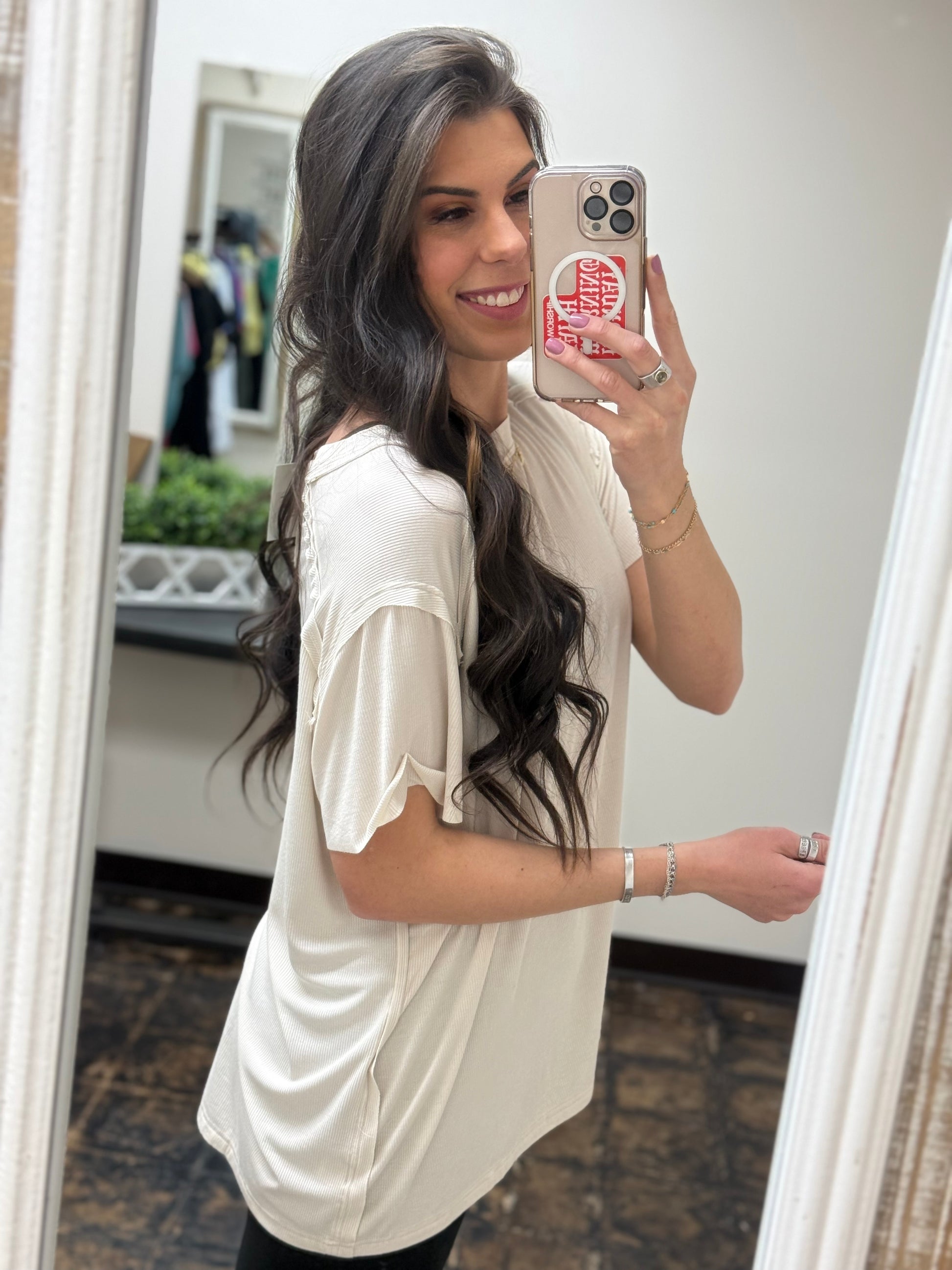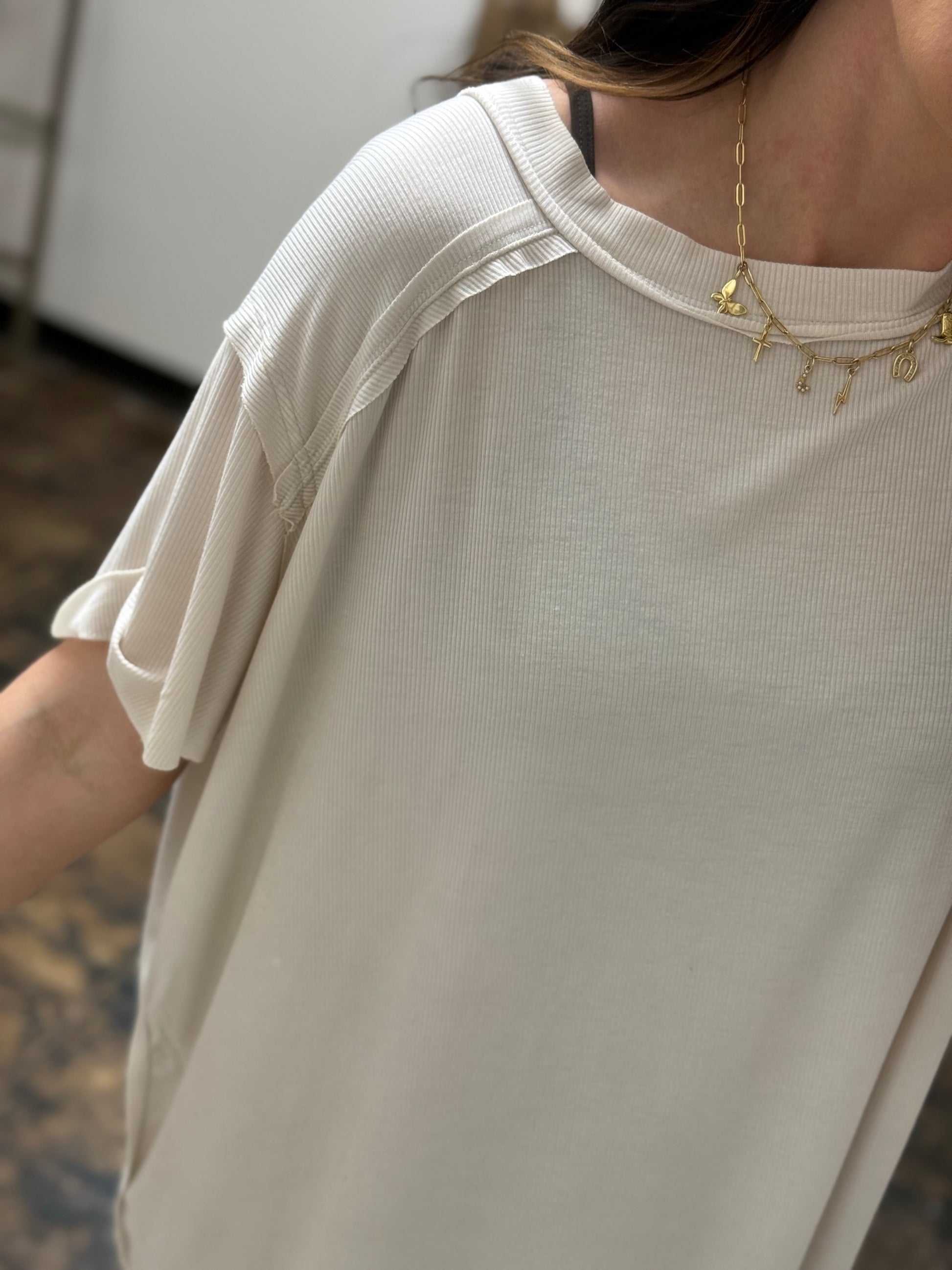 Introducing the Carmina Washed Ribbed Tee. Made from ribbed material for ultimate comfort, this tee boasts an oversized fit and exposed seams for a modern touch. Upgrade your wardrobe with this must-have piece.