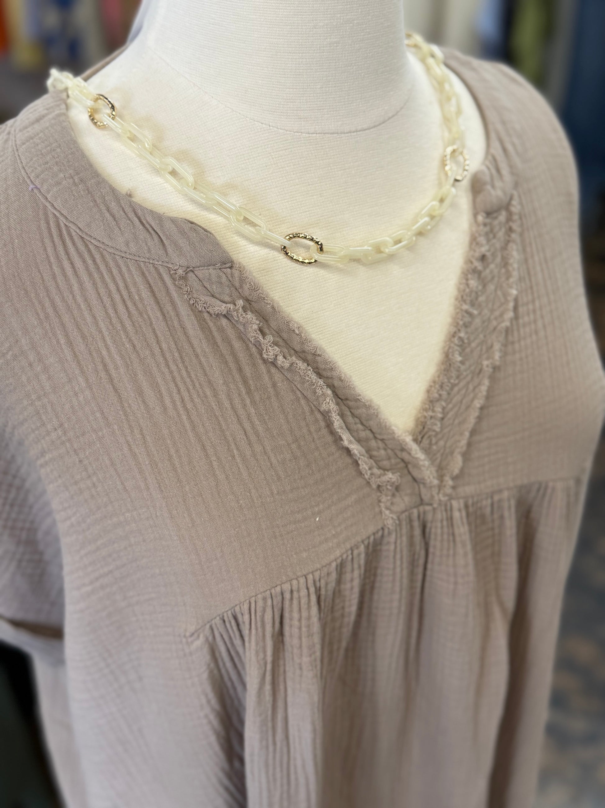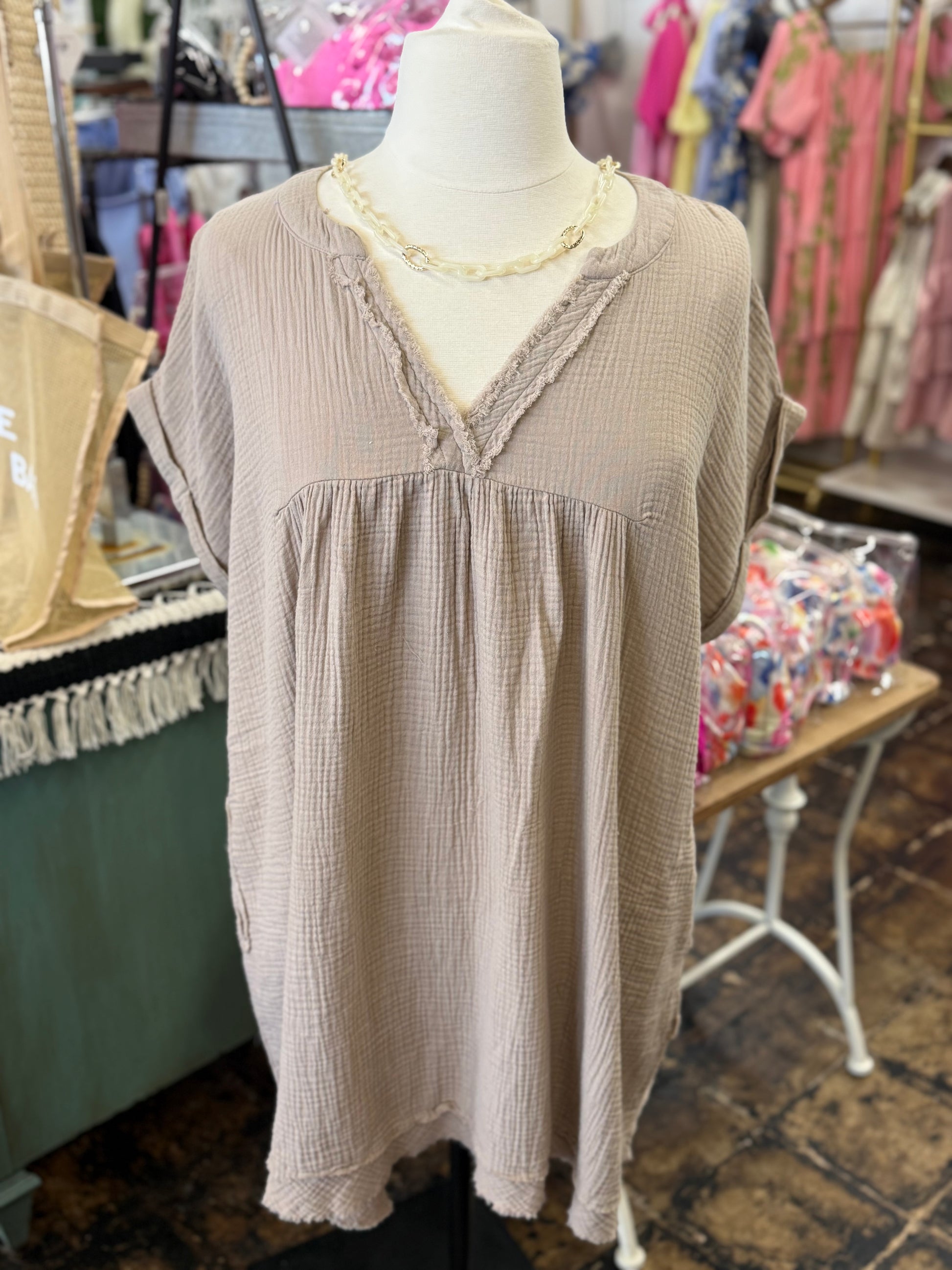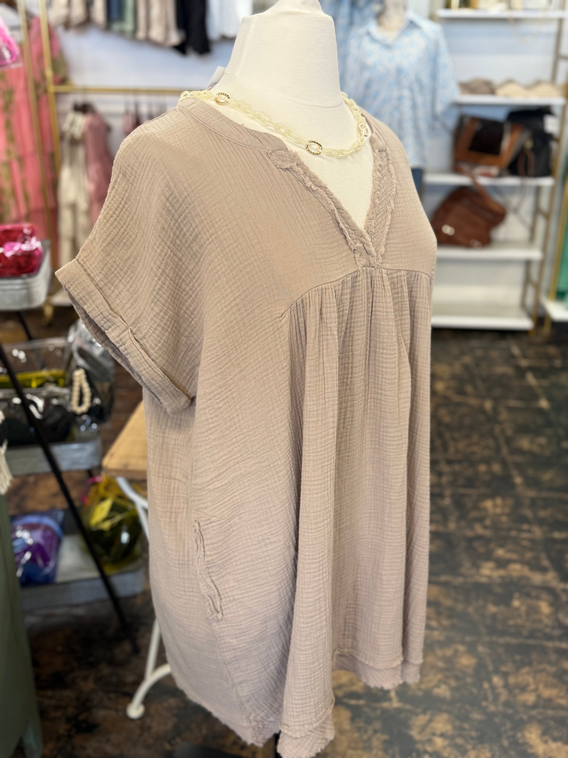 The Danielle Gauze V-Neck Dress - Lt. Mocha - CURVY