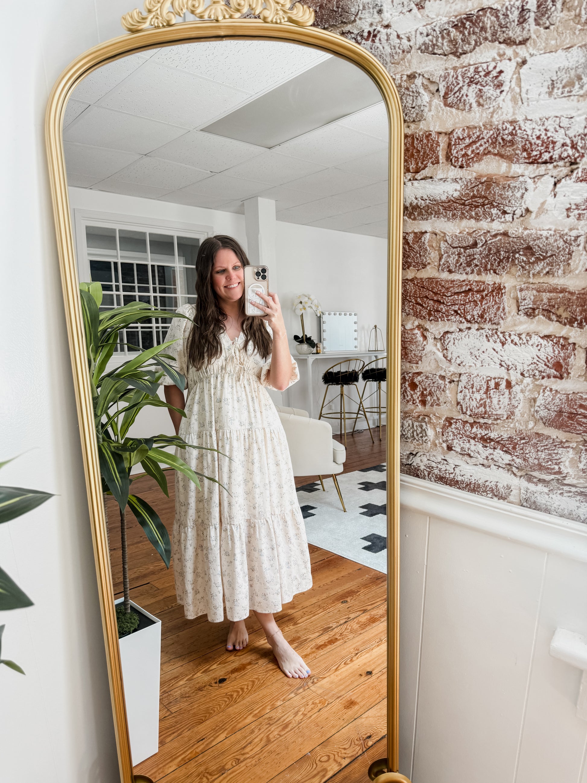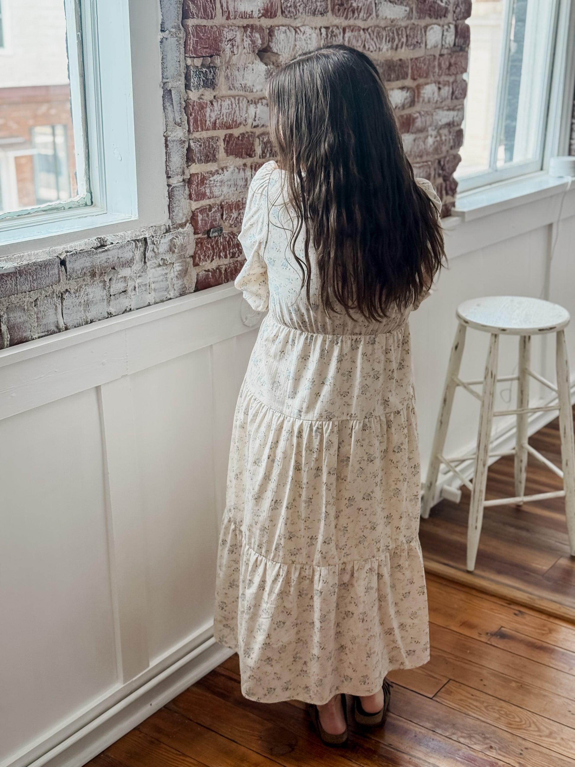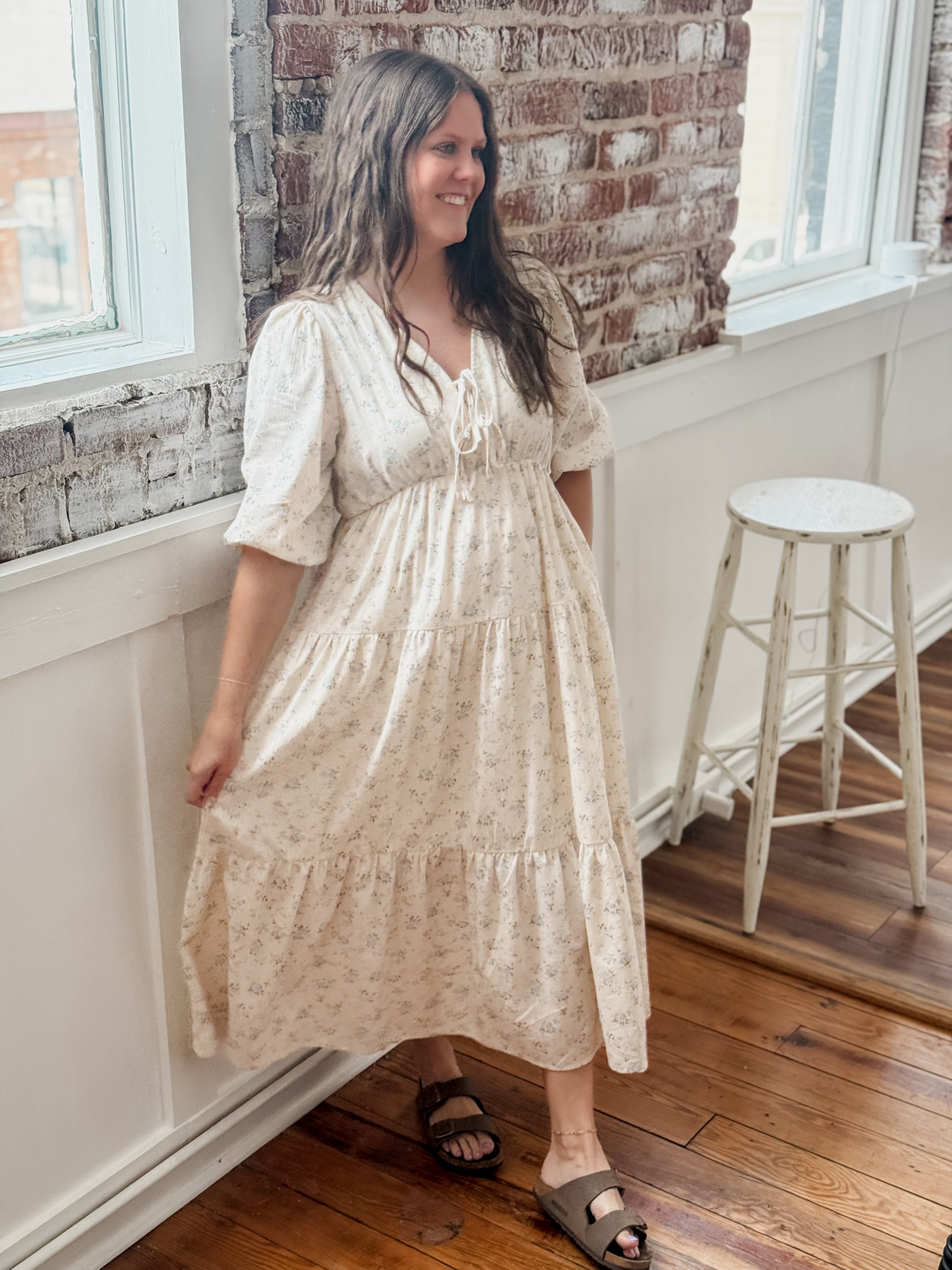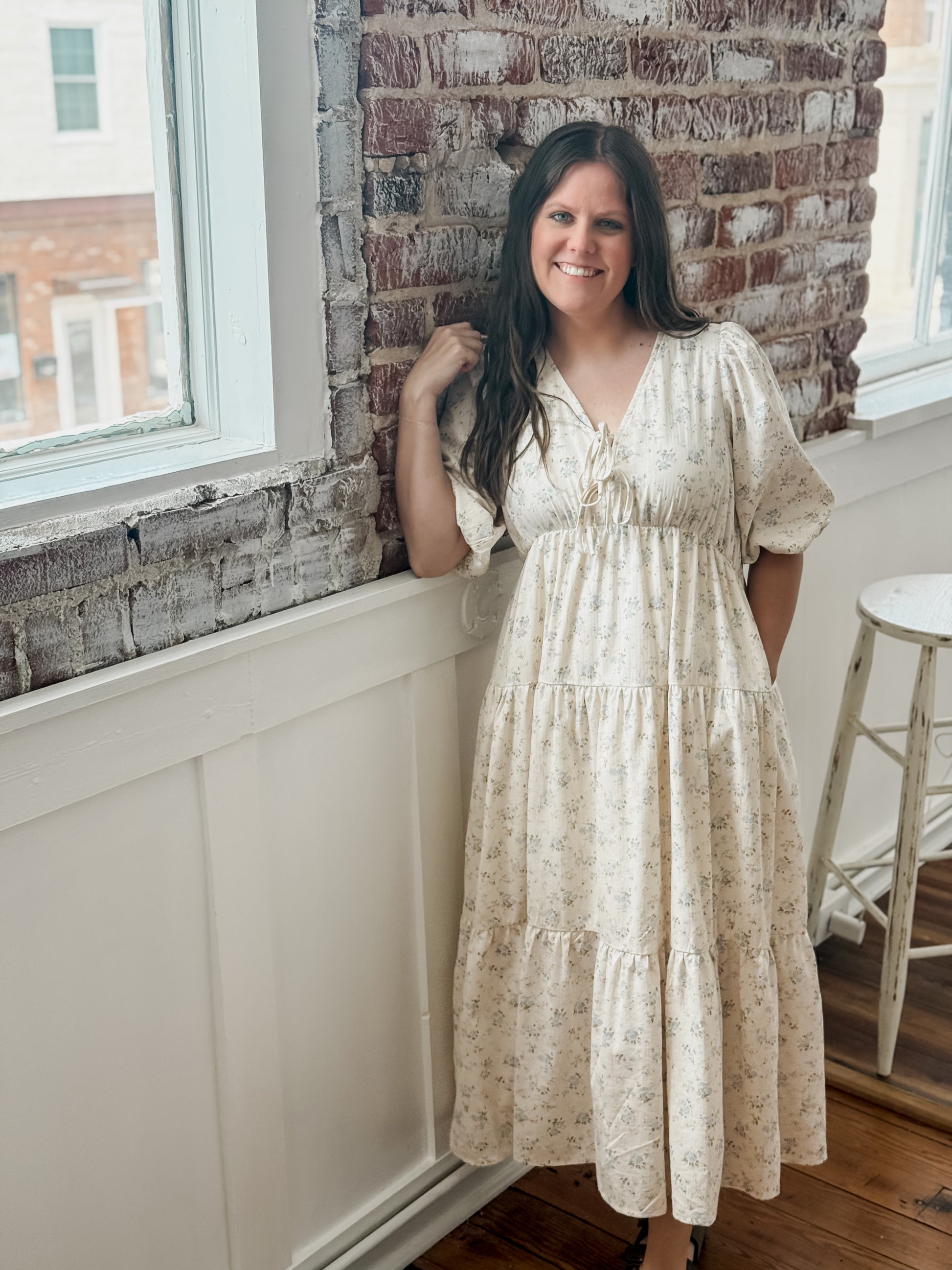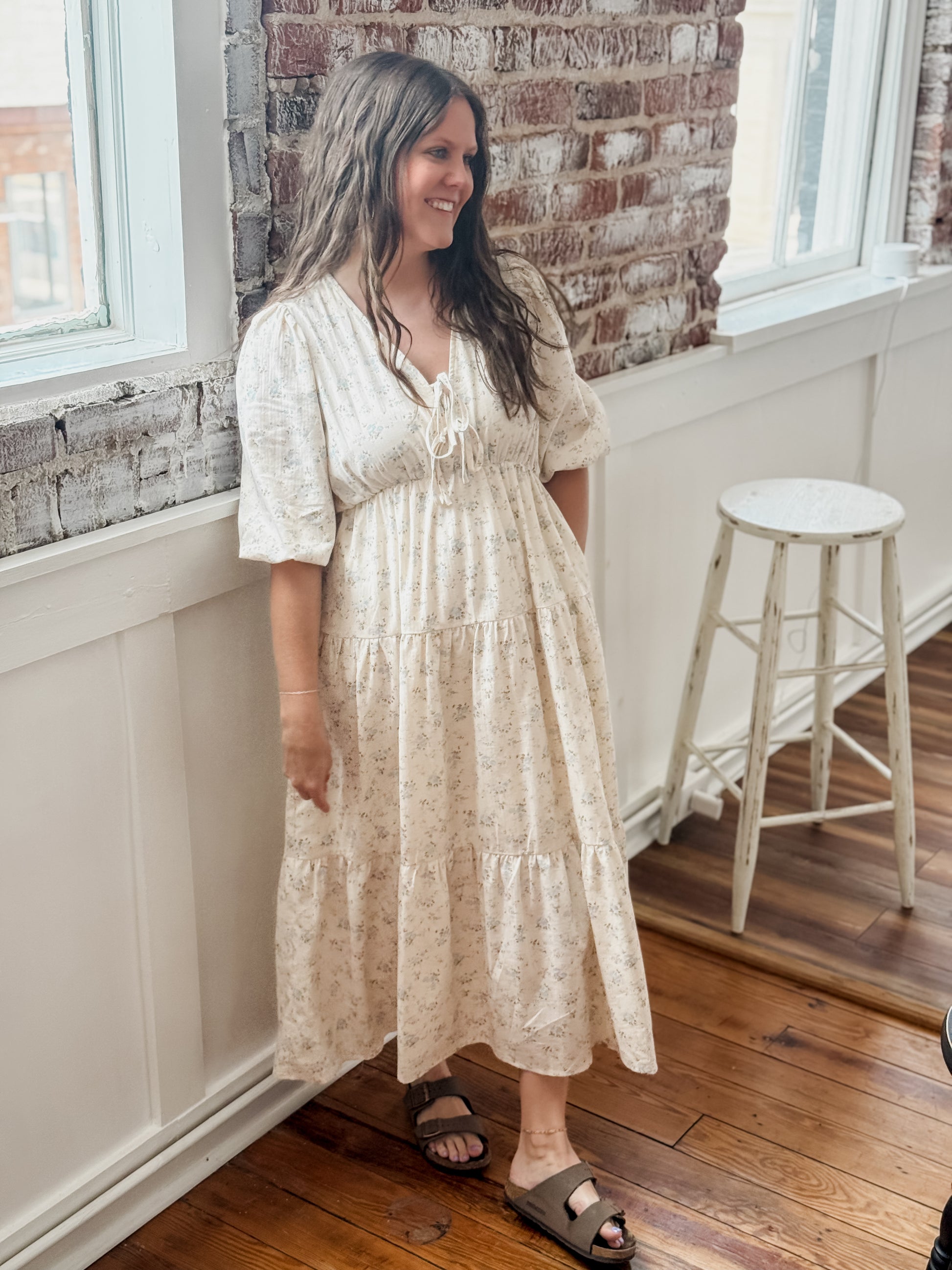 The Elyse Dress features a beautiful flower print and a v-neck with tie detail. The 1/2 puff sleeves and elastic waistline add both style and comfort. The tiered design and midi length create a flattering silhouette. Perfect for any occasion.