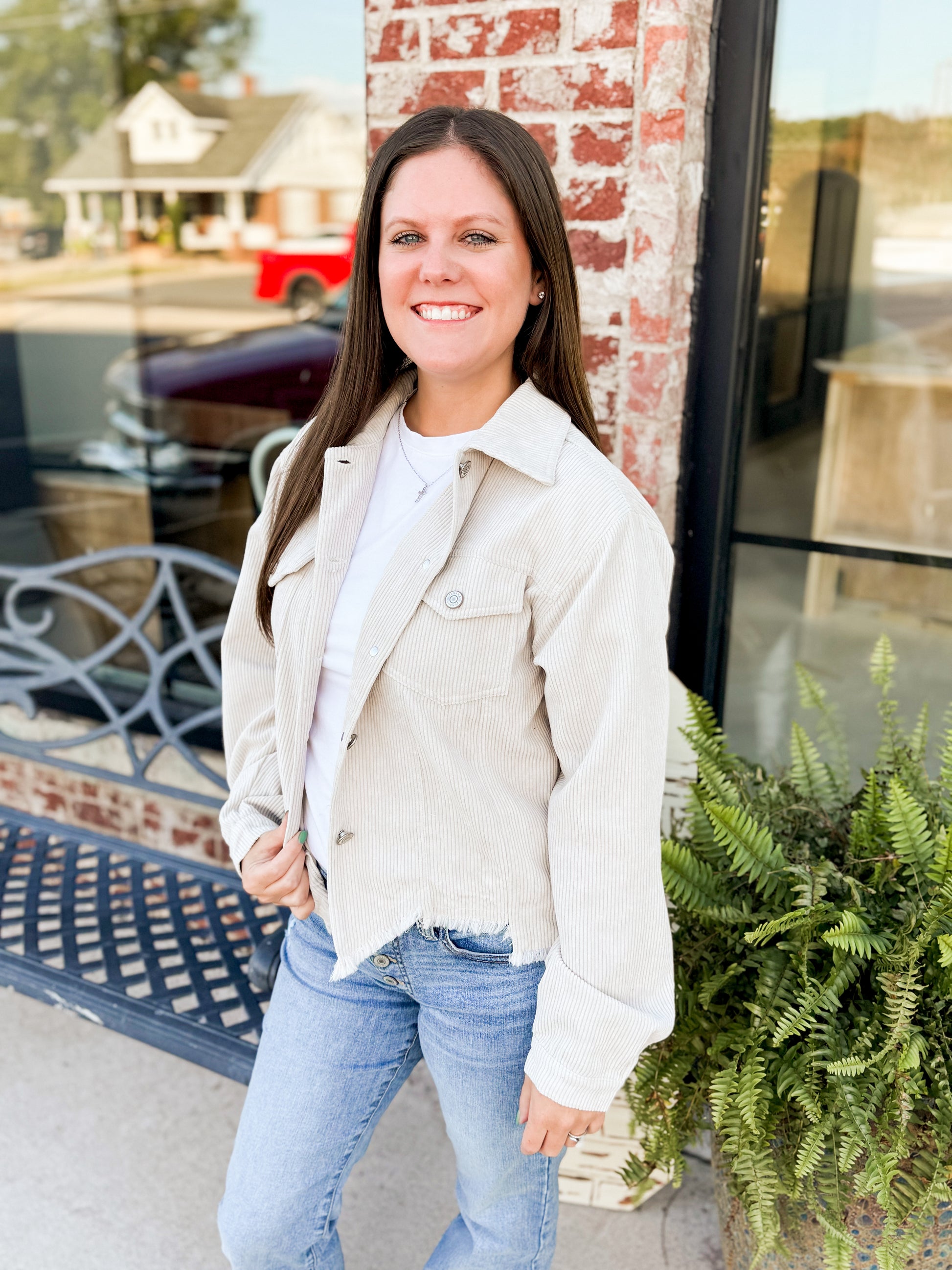 Bring some edge to your wardrobe with The Emersyn Corduroy Distressed Shacket. This cropped jacket features a stylish frayed hem and a soft corduroy texture for a playful, lived-in look that’s perfect for layering. It’s your new go-to piece to add a touch of cool without trying too hard.