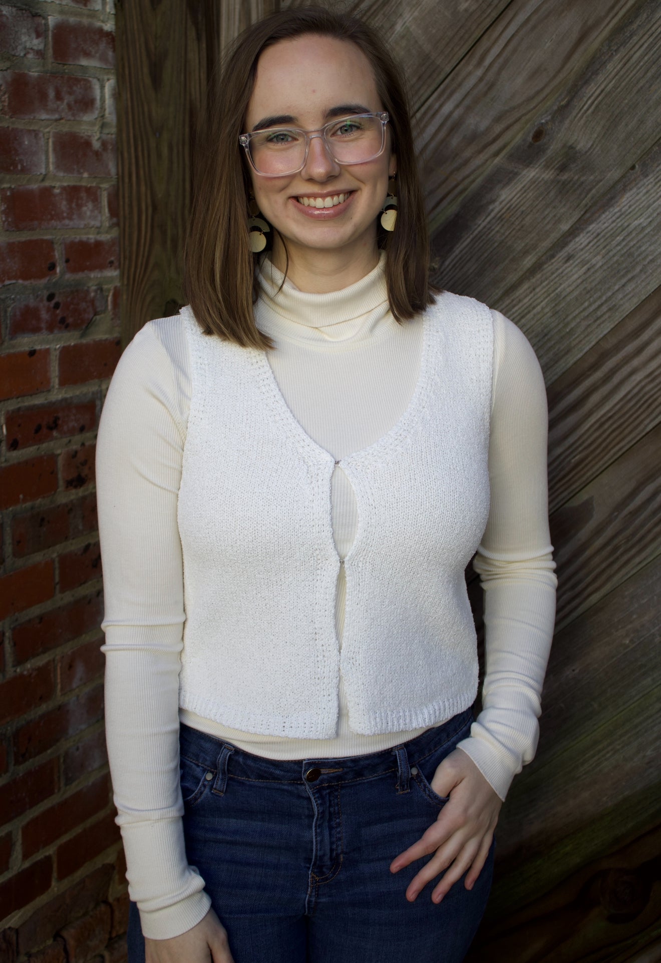 Upgrade your layering game with The Erika Sweater Vest. This off white vest features a hook and eye front, making it easy to put on and take off. Made with knit sweater material, it's perfect for layering over lace tops. Stay stylish and cozy all day long.
