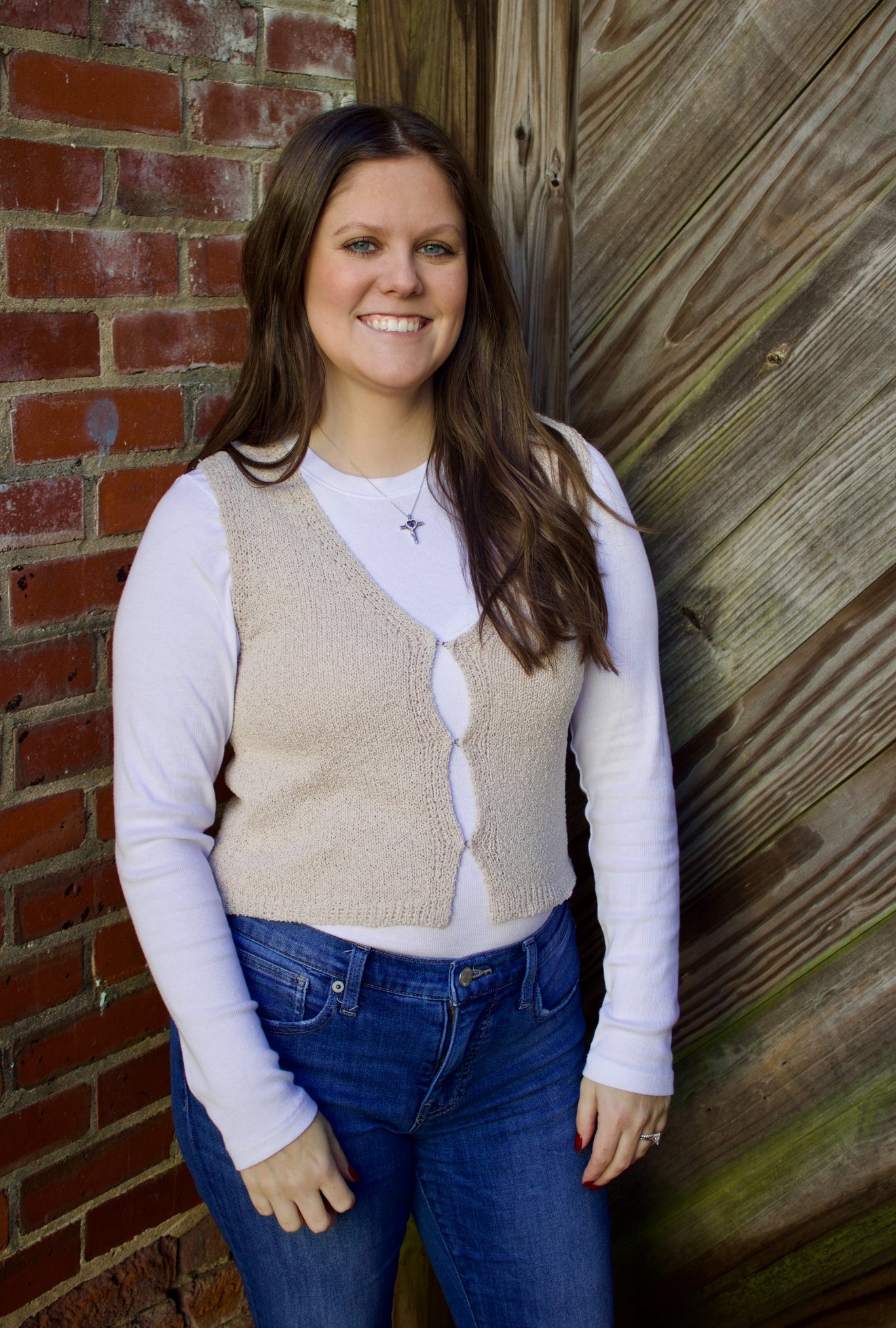 Upgrade your layering game with The Erika Sweater Vest. This sand beige vest features a hook and eye front, making it easy to put on and take off. Made with knit sweater material, it's perfect for layering over lace tops. Stay stylish and cozy all day long.