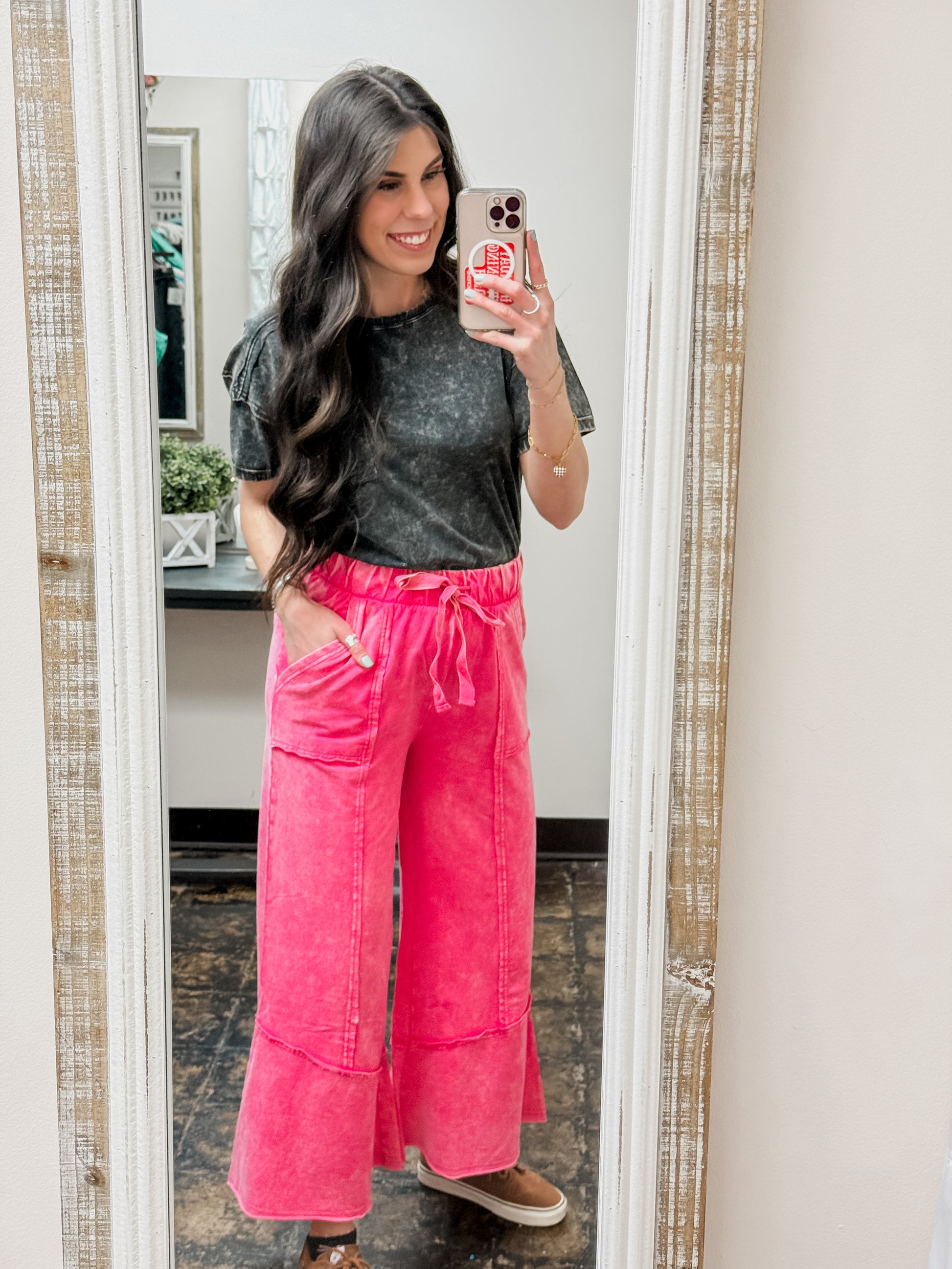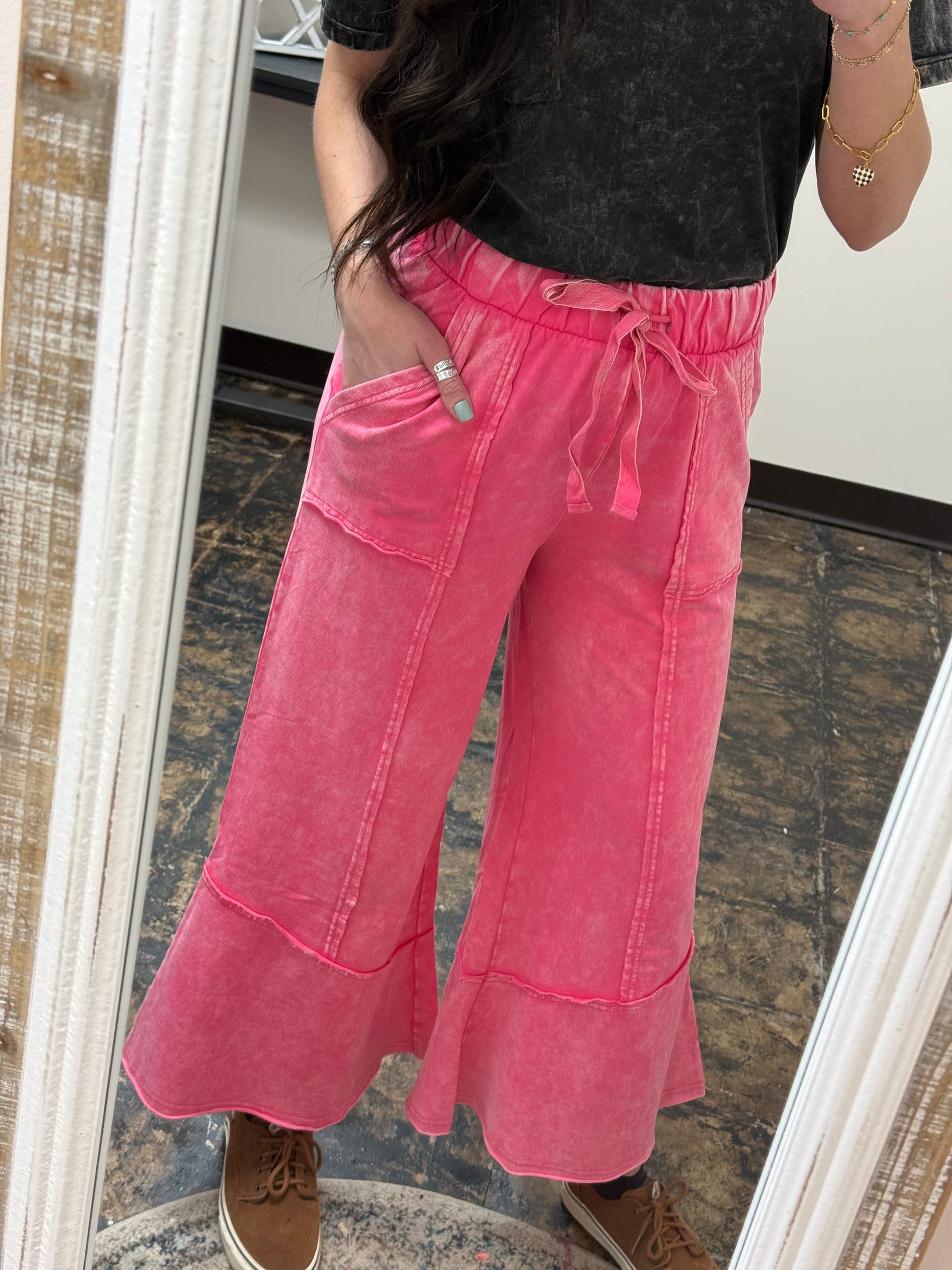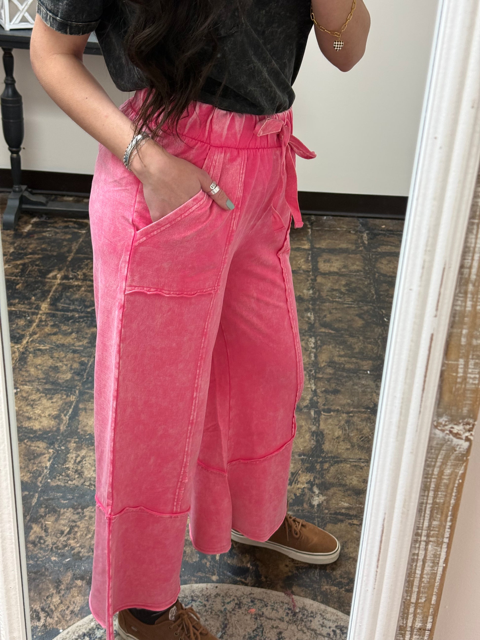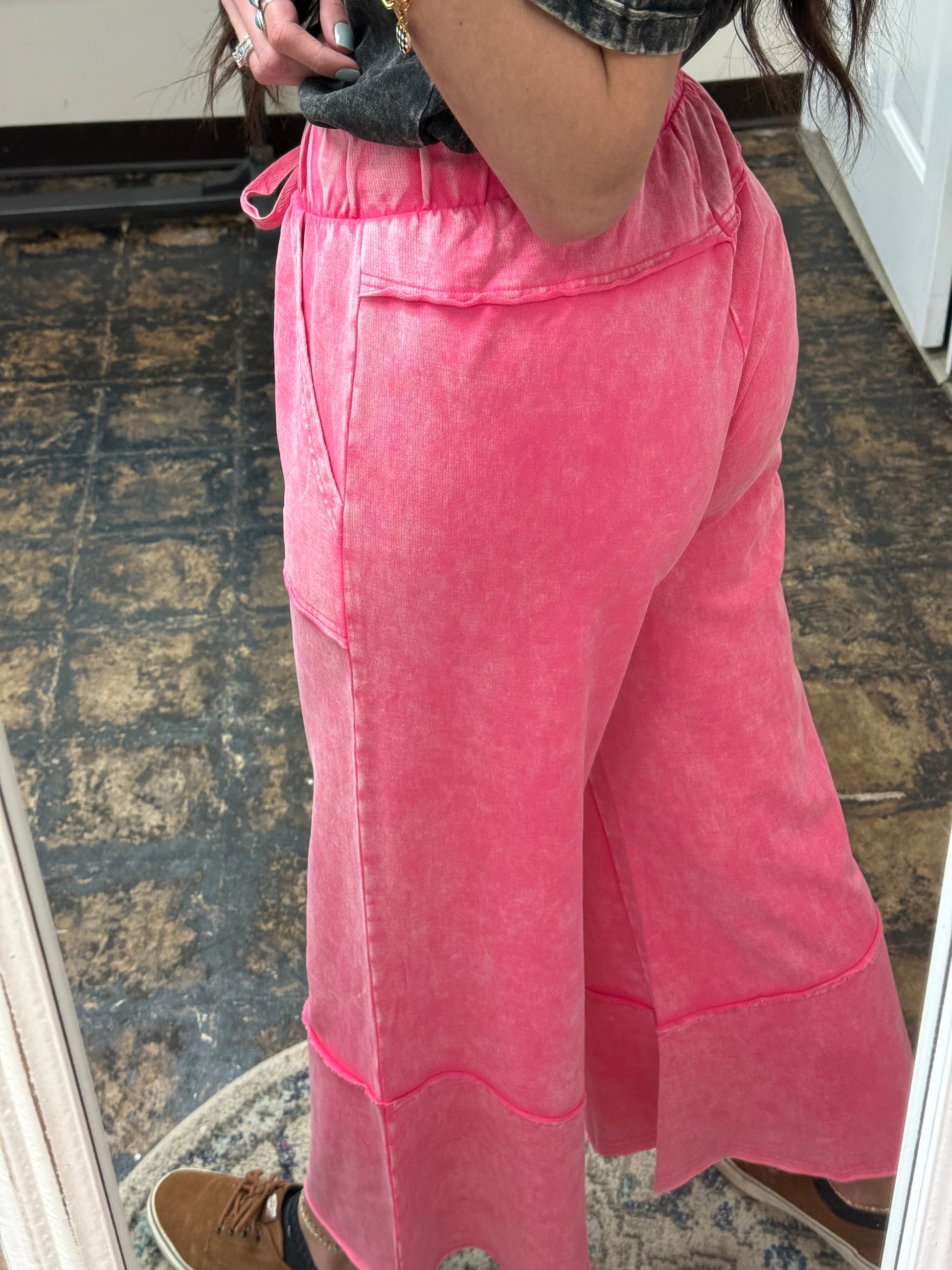 Expertly crafted from French Terry material, The Gillian Exposed Seam Palazzo Pants are both stylish and comfortable. The flare cut and exposed seams add a unique touch, while the functional drawstring and pockets make them practical for everyday wear. Enjoy a slightly cropped length and acid wash finish for a trendy look.