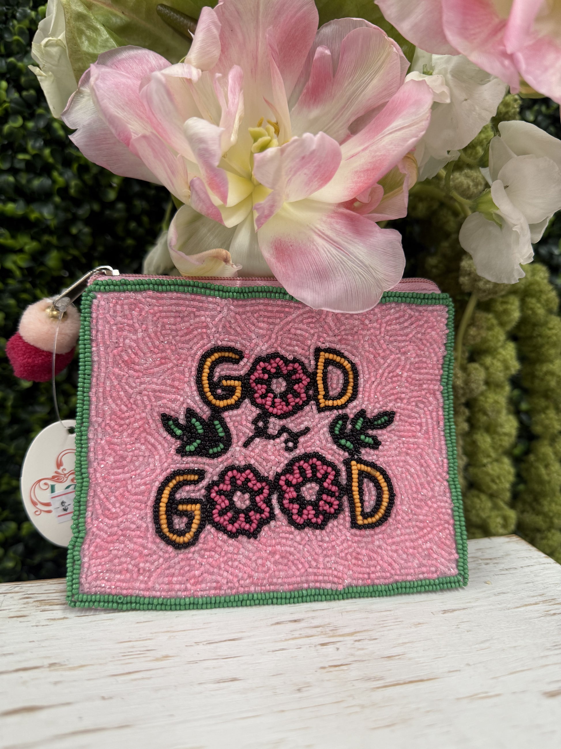 Add a touch of personality to your everyday essentials with The God is Good Seed Bead Pouch. Featuring a playfully embroidered floral "GOD IS GOOD" design, this 100% cotton bag is fully lined and complete with a fun pom pom zipper. Measuring at 5.5" L x 4.5" T, it's the perfect size to keep your belongings organized and stylish on-the-go.
