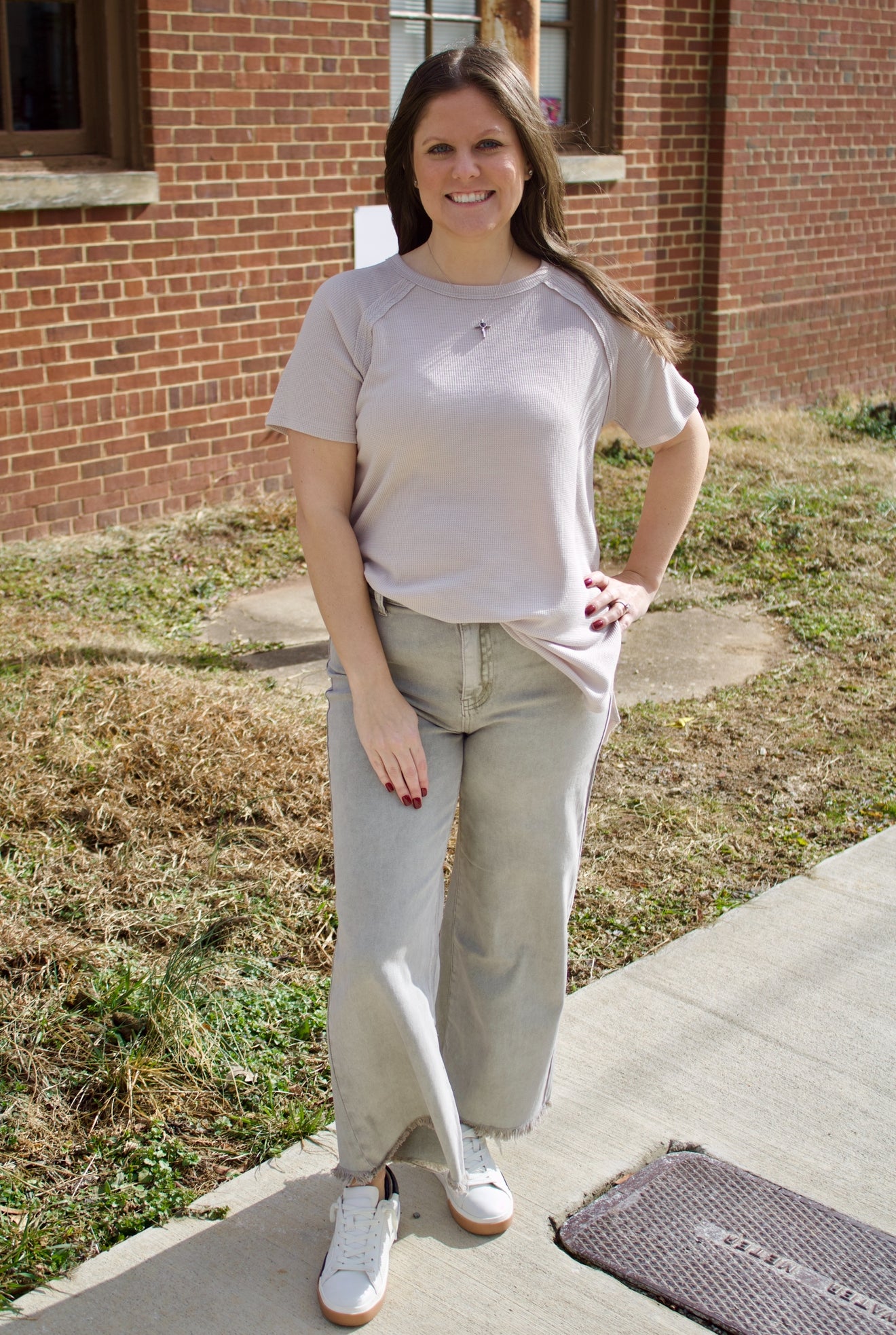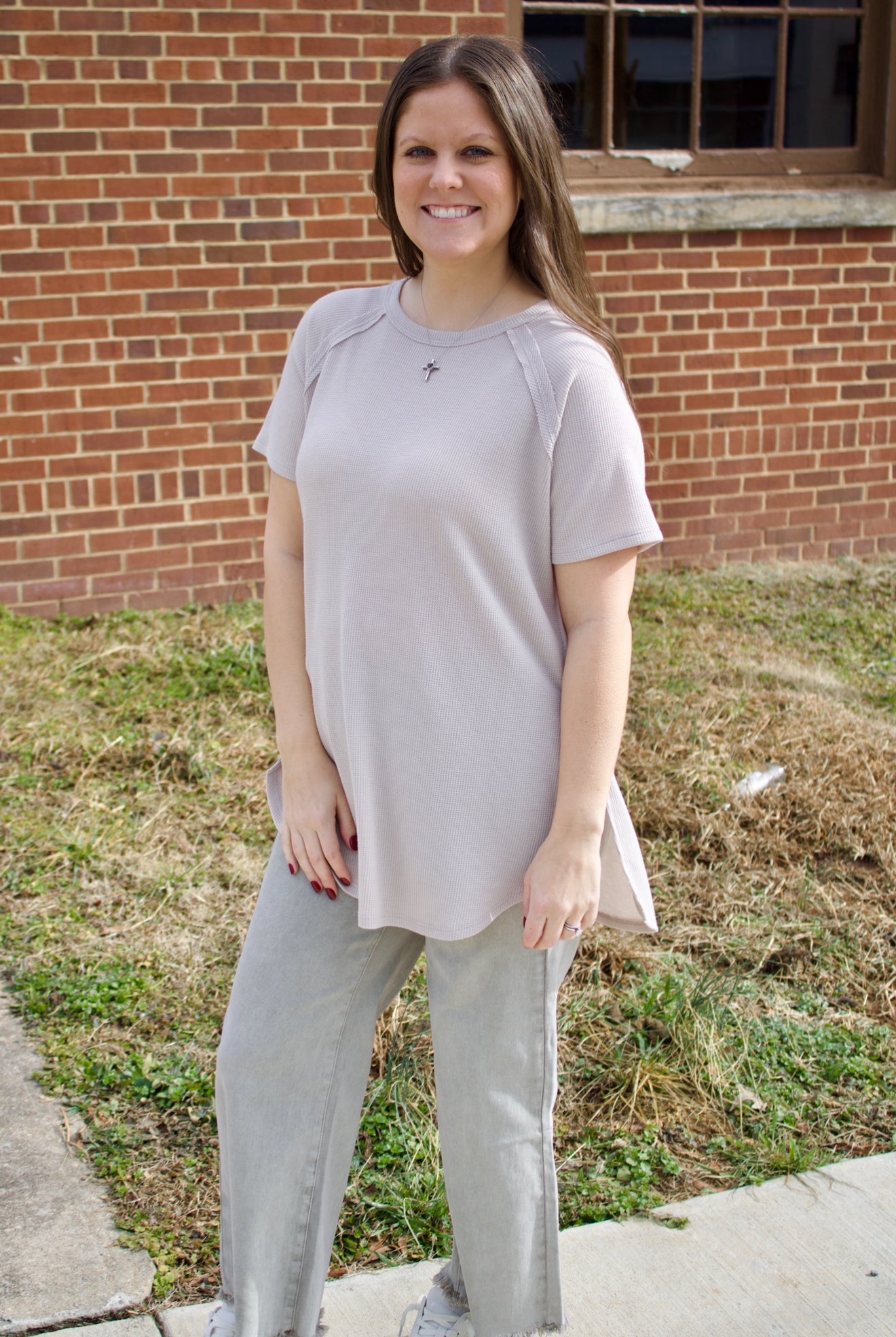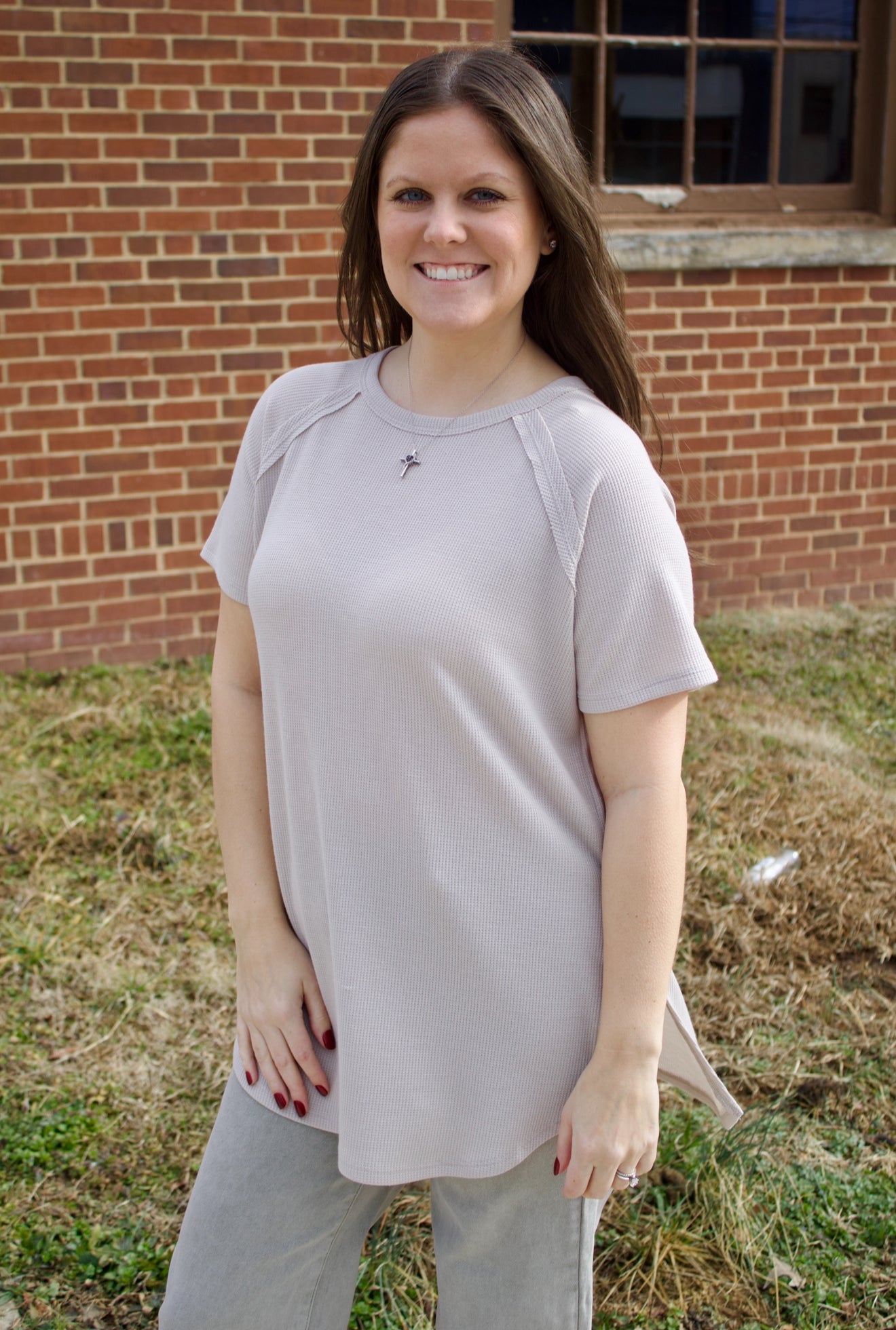 Stay comfy in the Jacey Waffle Knit Top! Its soft, waffle knit fabric and side slits provide ultimate comfort, while the exposed seams add a touch of edge. Perfect for lounging around or a casual day out.