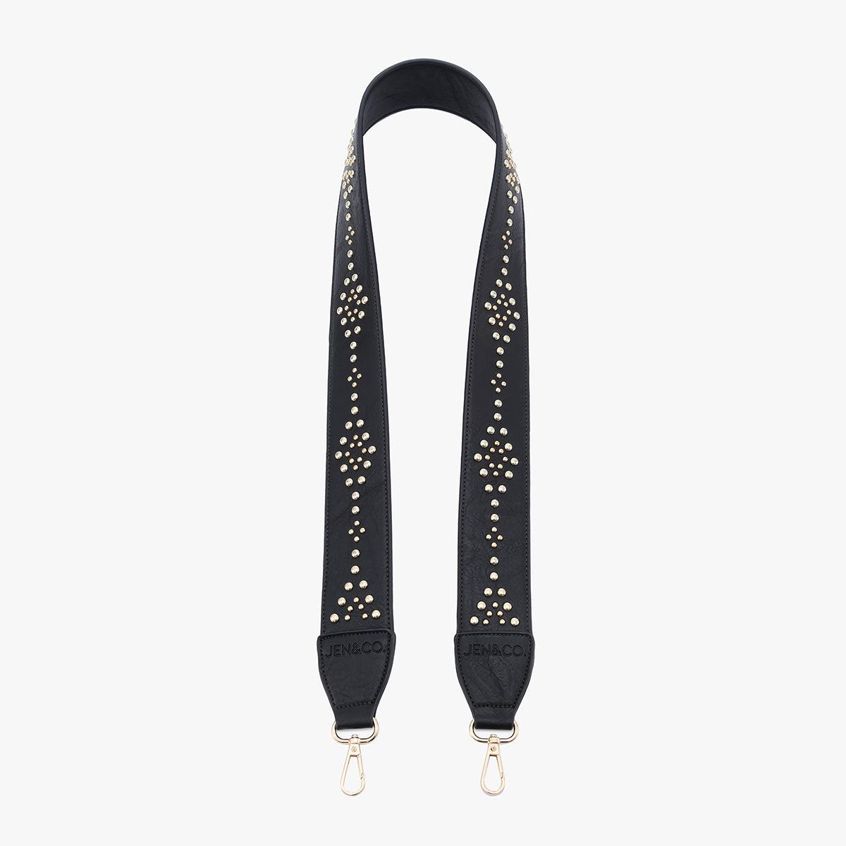 The Jaci Studded Guitar Bag Strap is an ideal accessory for handbags, features gold tone hardware and a non-adjustable 42" length. Utilize this sturdy strap for your daily needs with its secure and stylish design.