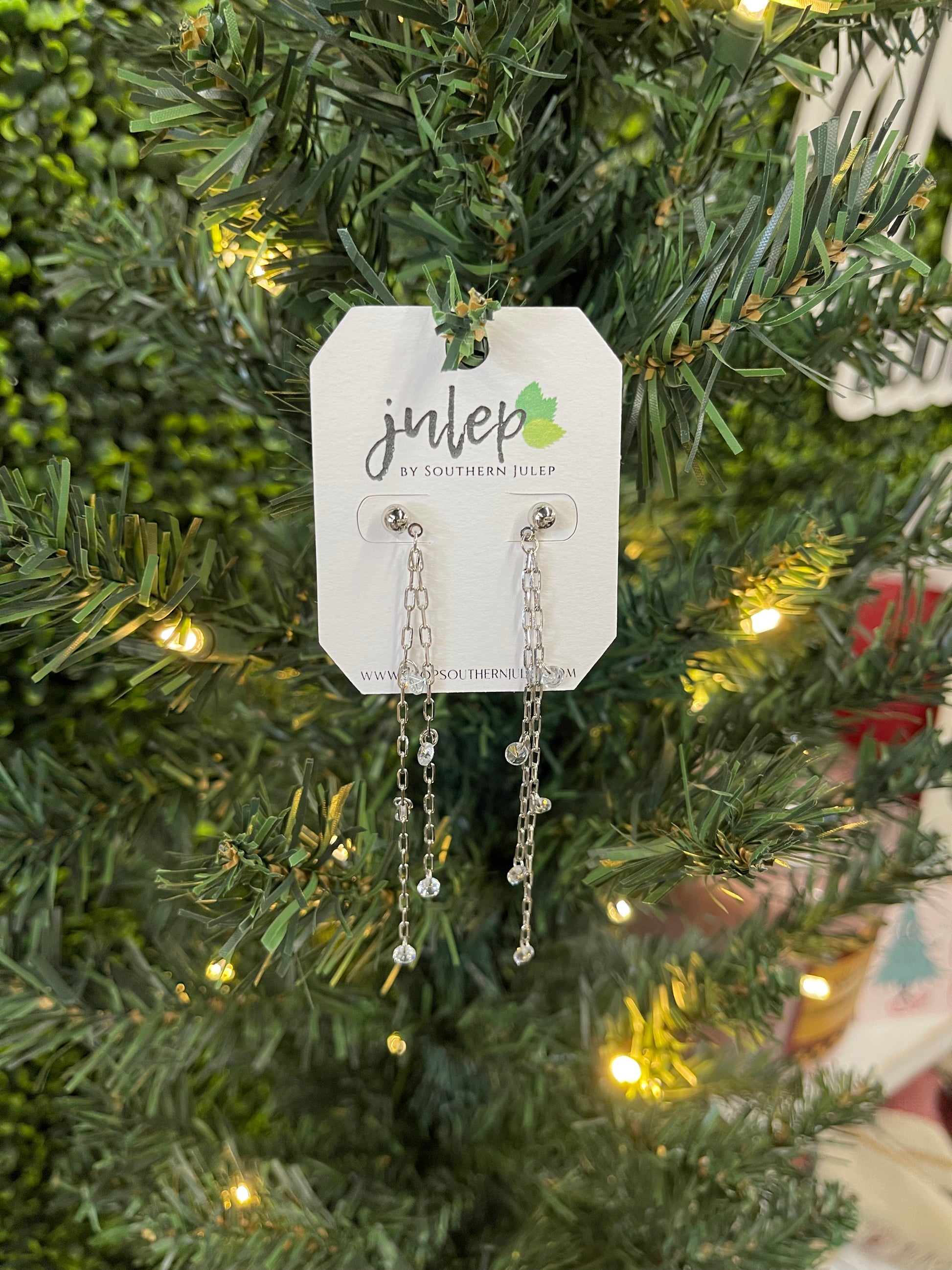 As an industry expert, these elegant Jewel Earrings in Silver are a must-have for any jewelry collection. The silver chain links and crystal diamond accents provide a touch of luxury while remaining versatile for any occasion. Add these to your wardrobe today for a touch of sophistication.