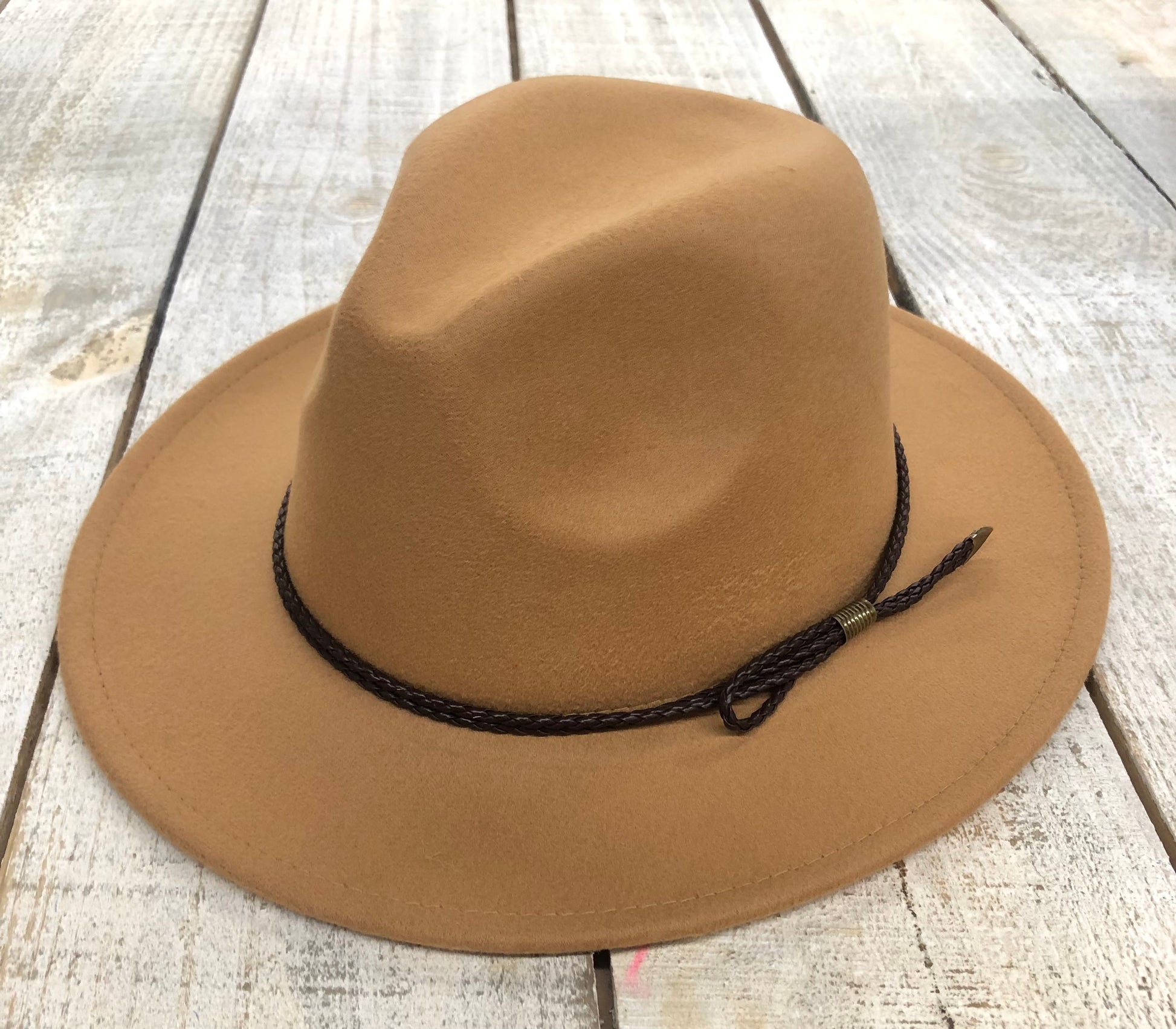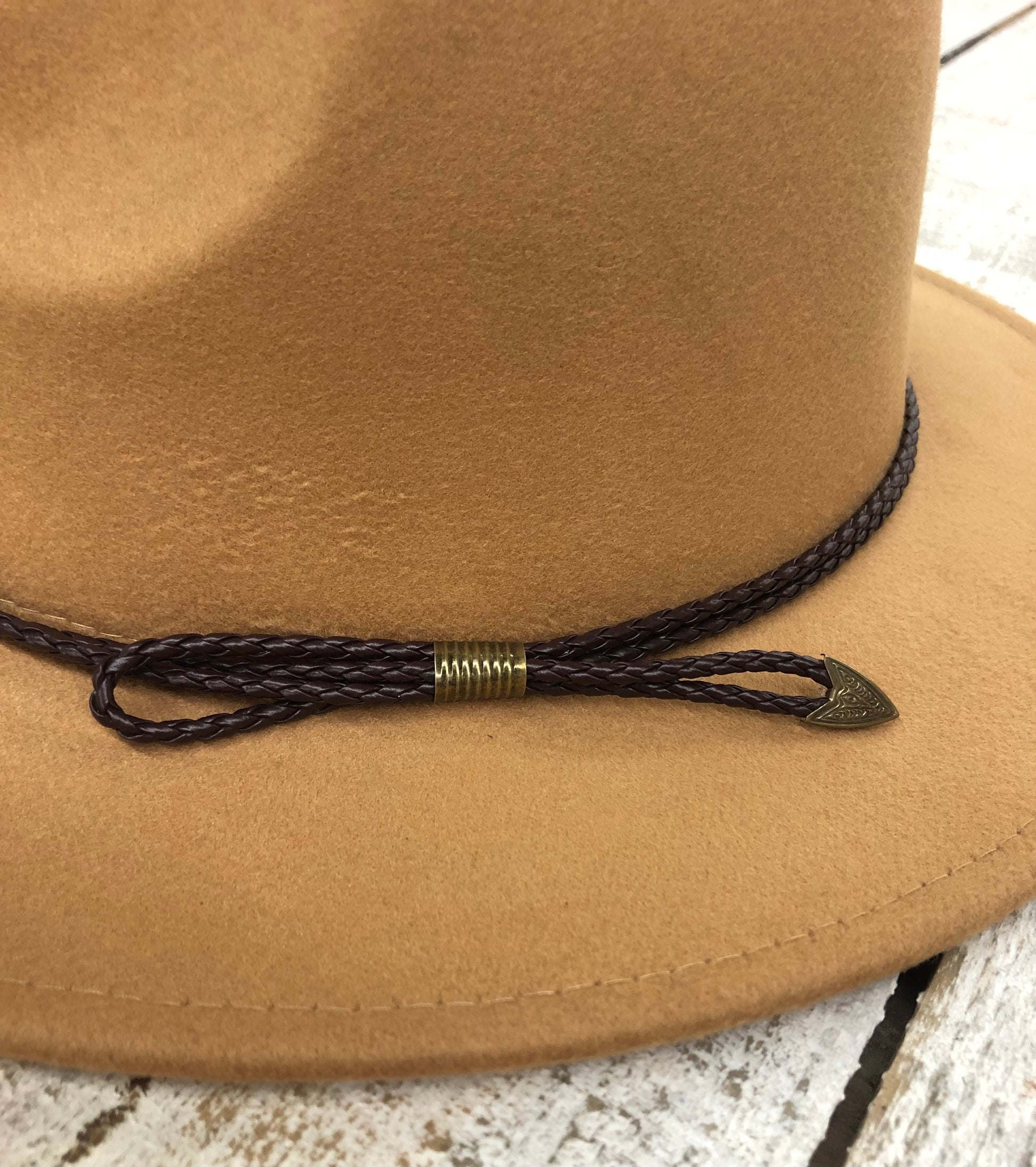 Felt Wide Brim Hat With Thin Braided Leather Band Around Crown.