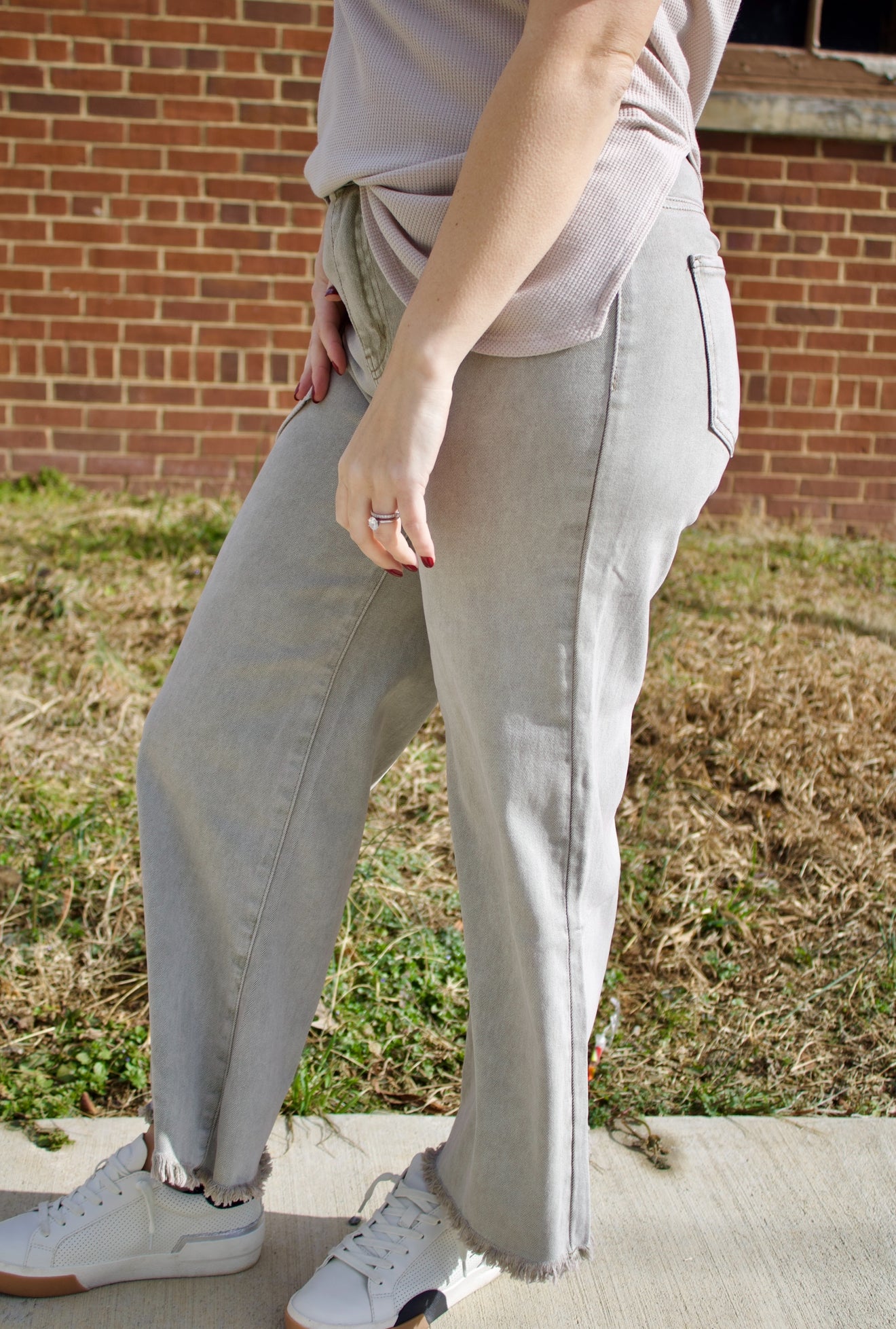 Expertly crafted with a trendy acid wash finish, these cropped pants are a must-have for any wardrobe. The raw hem adds an edge to the cropped length, making these pants a versatile and stylish choice. Elevate your look with the Kristi Acid Wash Cropped Pants in light olive.