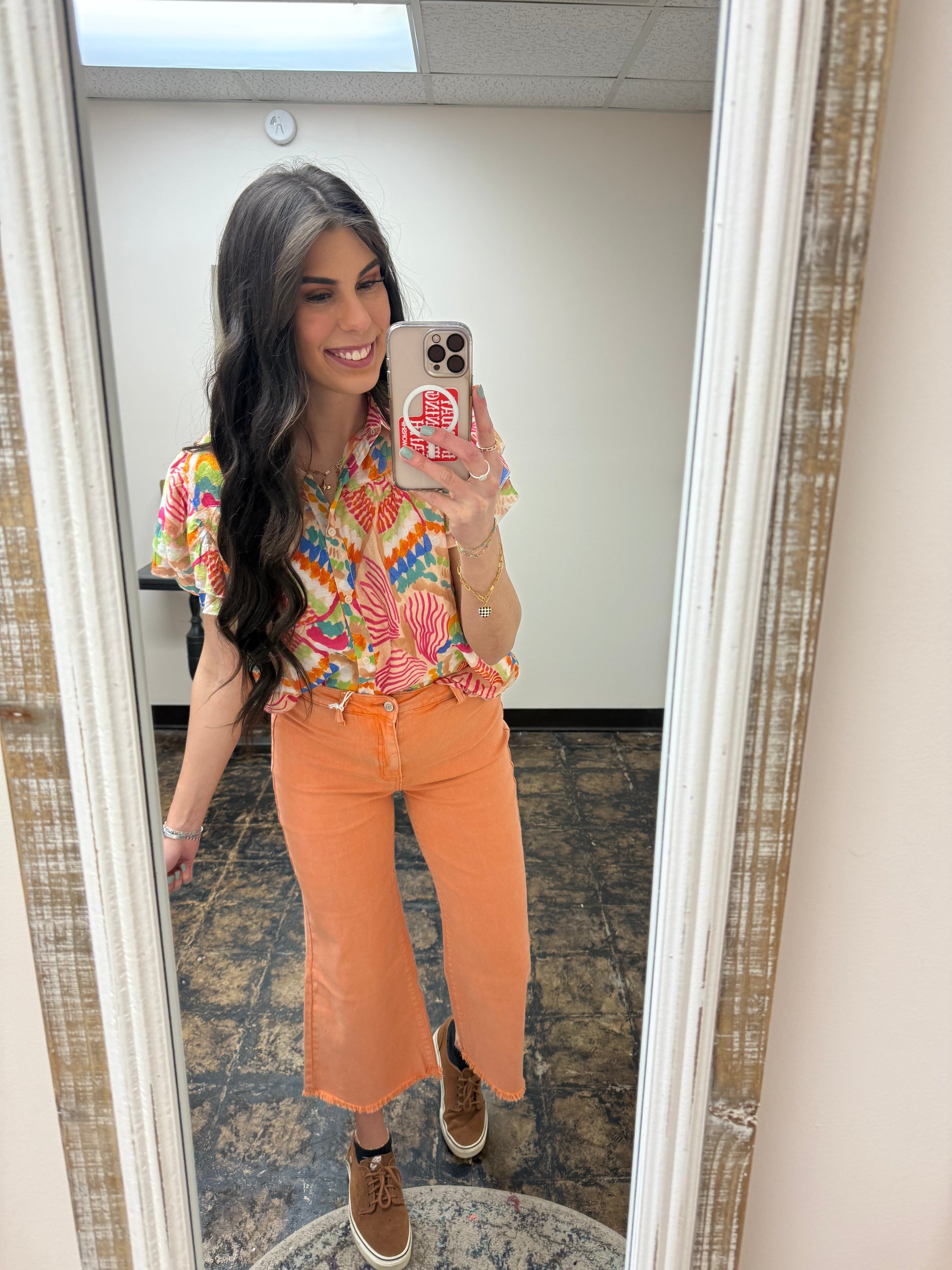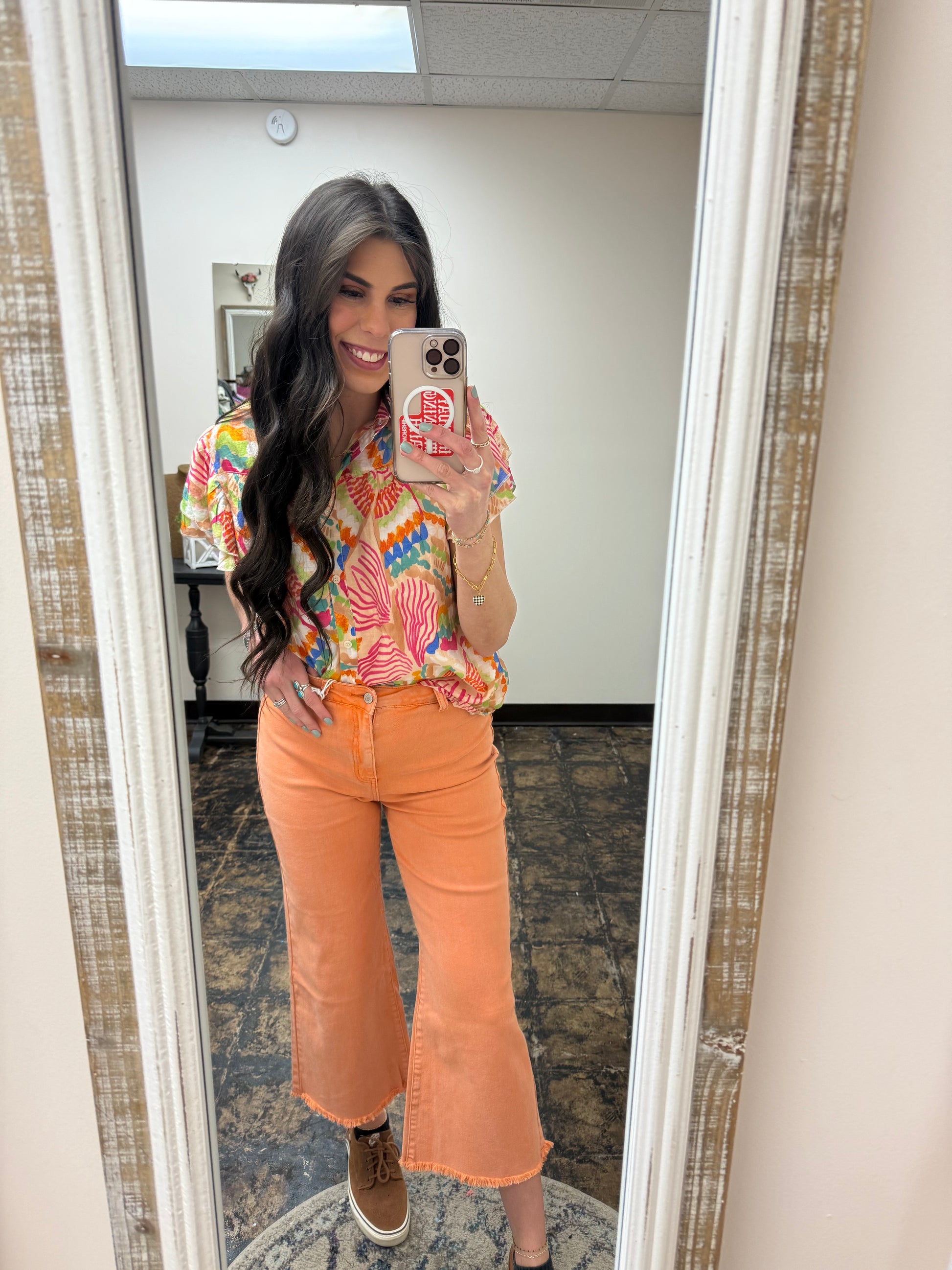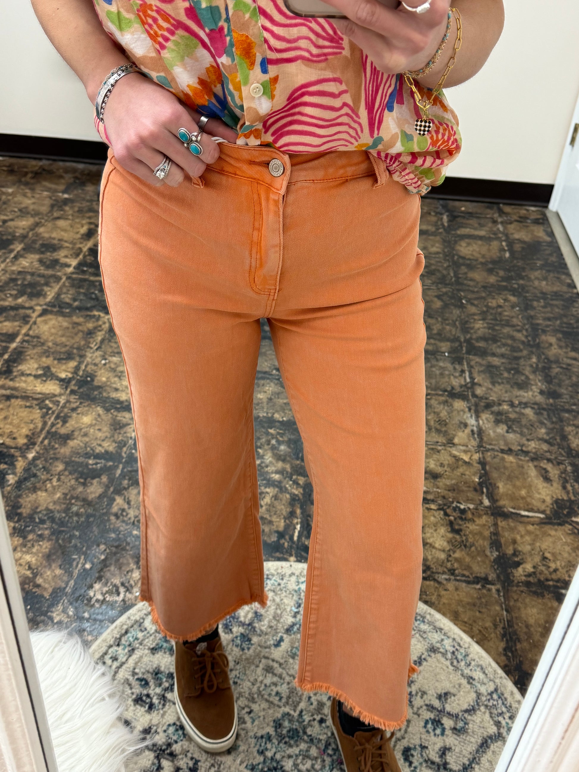 Expertly crafted with a trendy acid wash finish, these cropped pants are a must-have for any wardrobe. The raw hem adds an edge to the cropped length, making these pants a versatile and stylish choice. Elevate your look with the Kristi Acid Wash Cropped Pants in orange.