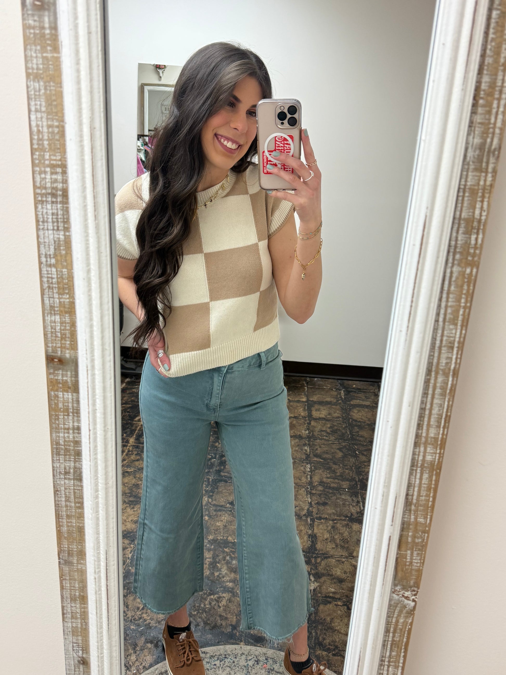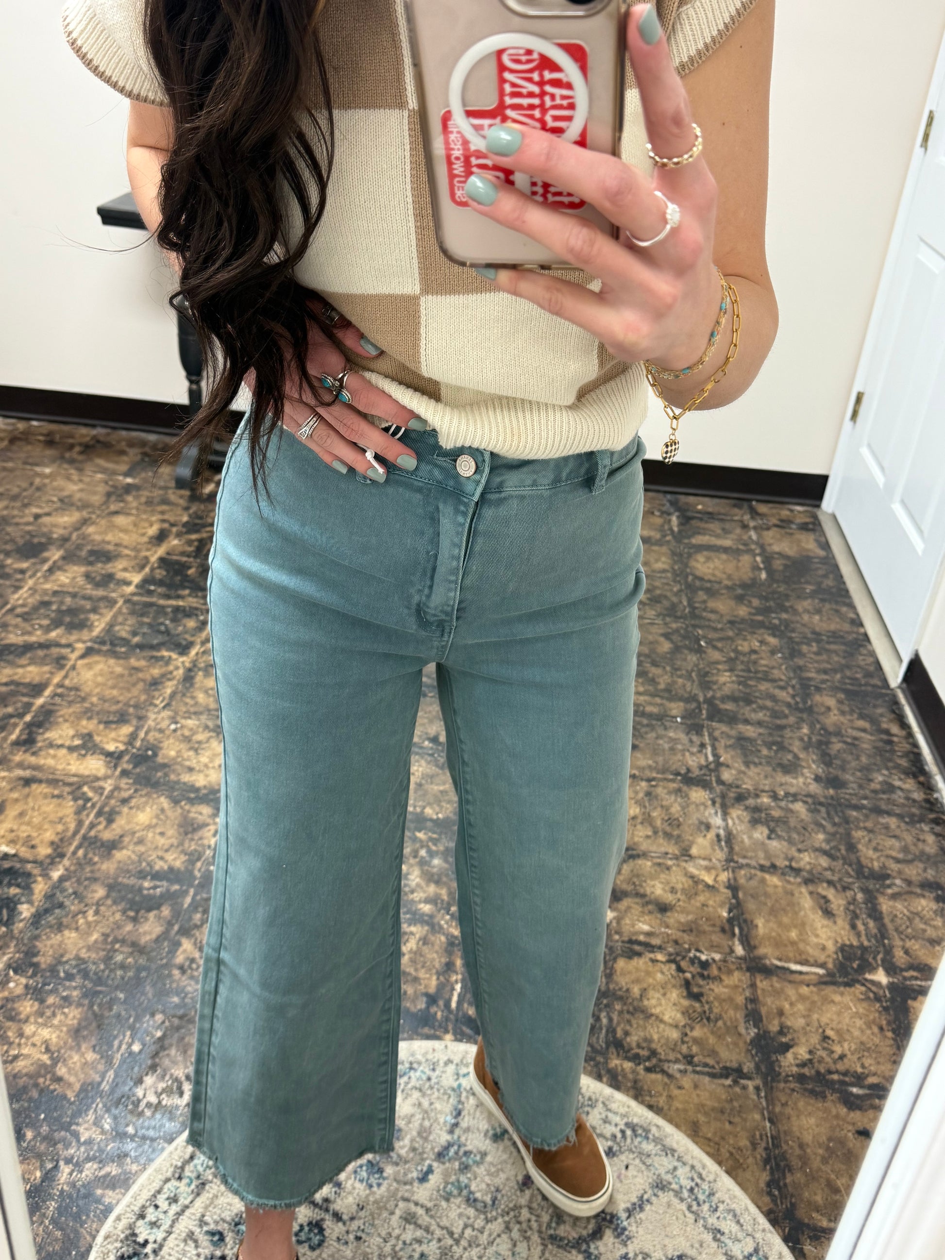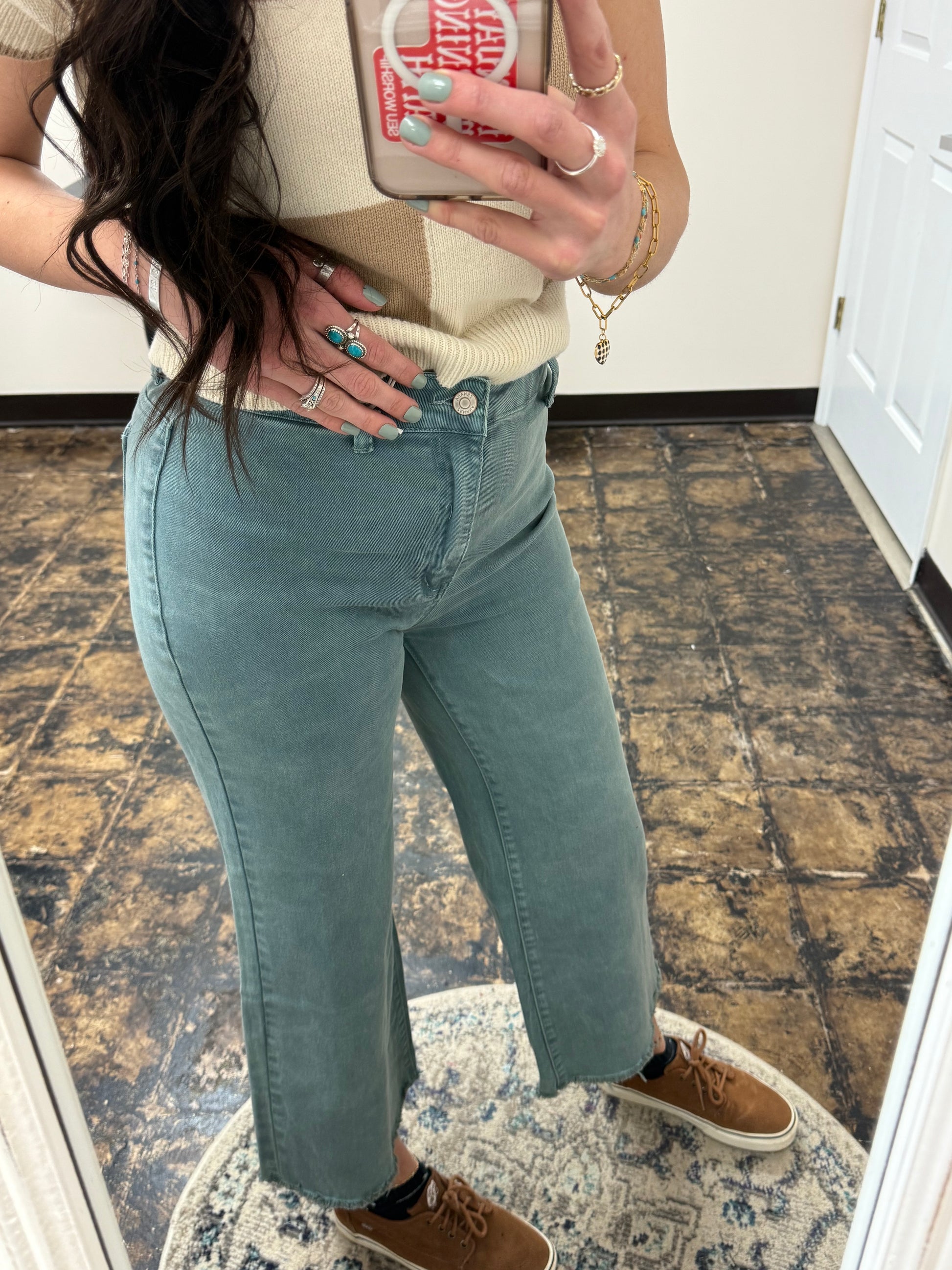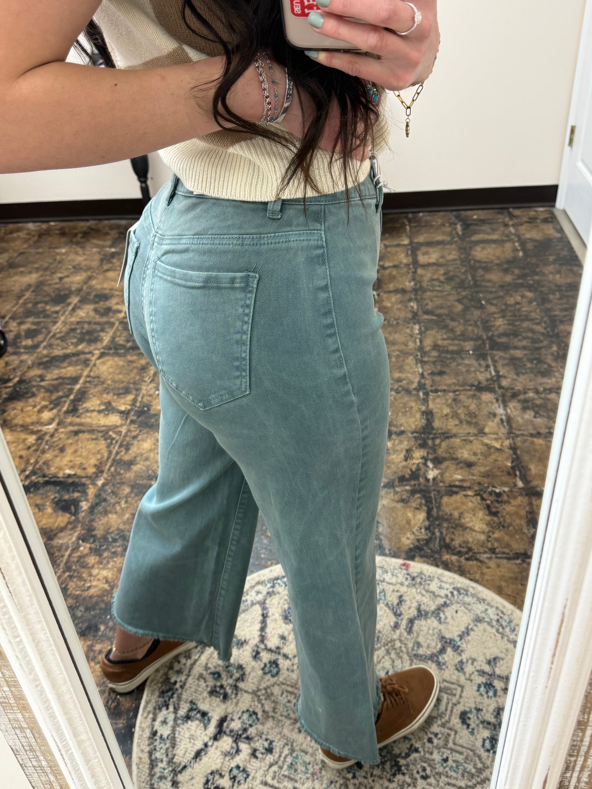 Expertly crafted with a trendy acid wash finish, these cropped pants are a must-have for any wardrobe. The raw hem adds an edge to the cropped length, making these pants a versatile and stylish choice. Elevate your look with the Kristi Acid Wash Cropped Pants in teal.