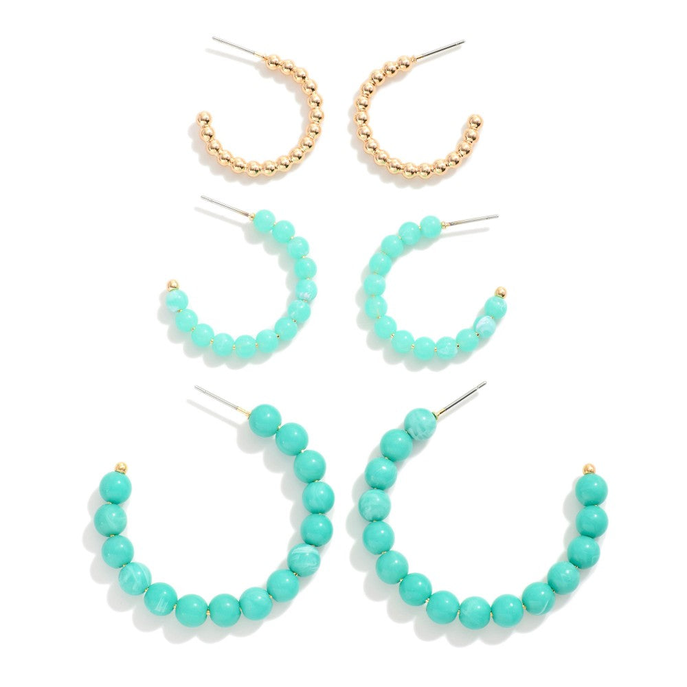 Add a splash of color to your daily look with The Leanna Earring Set. This set includes three stunning beaded drop hoop earrings that are perfect for mix-and-matching for maximum style. Measuring 0.75-1.5 inches in length, these earrings are the ideal accessory to complete any outfit.