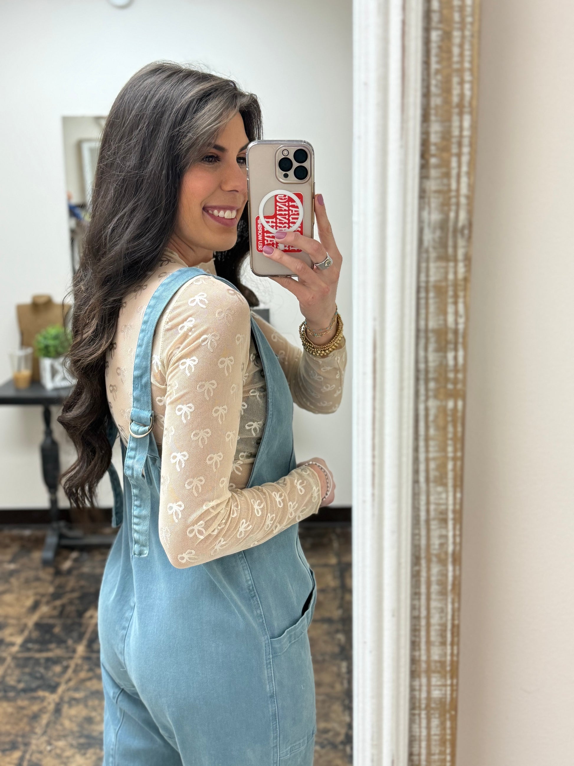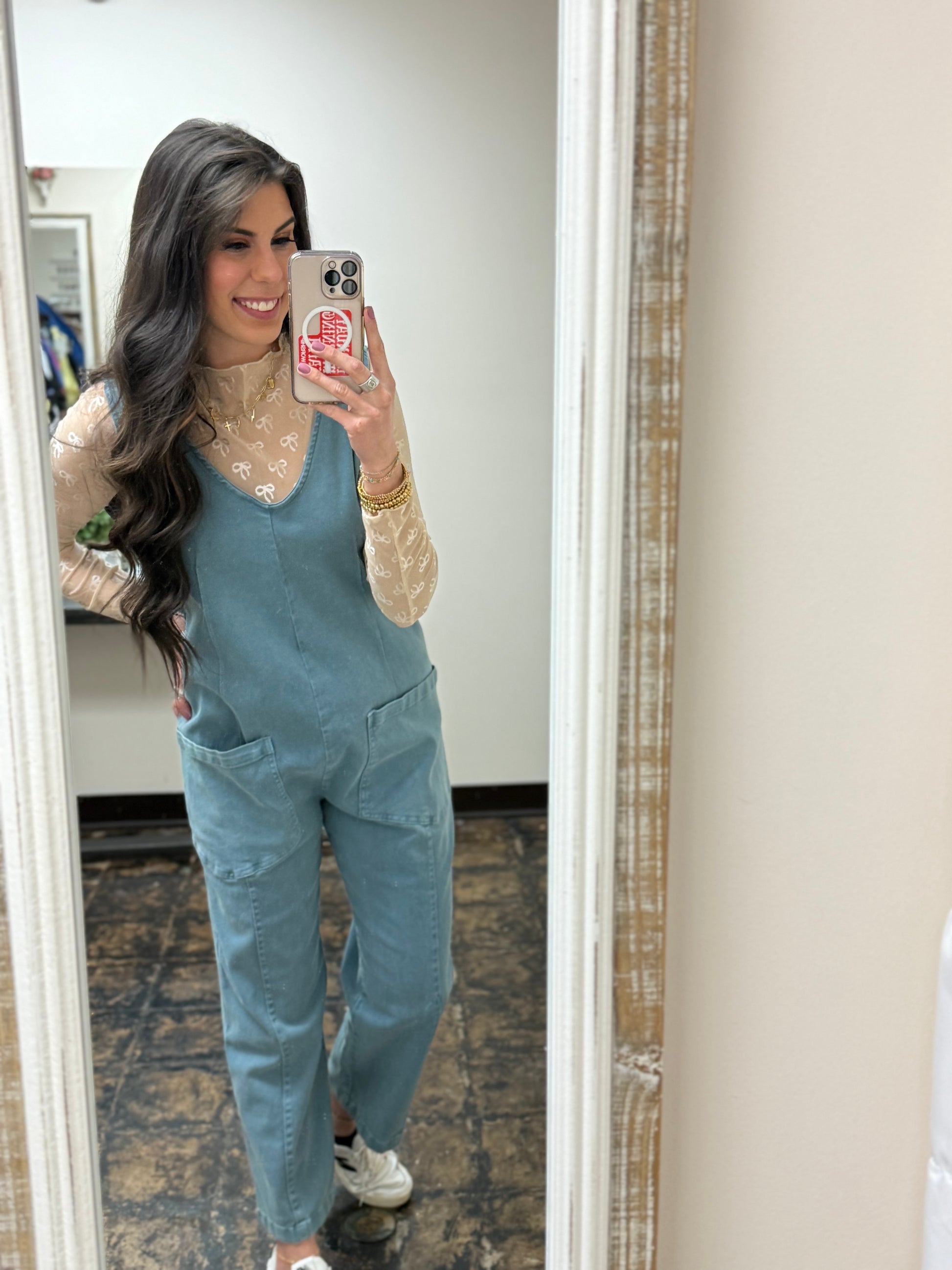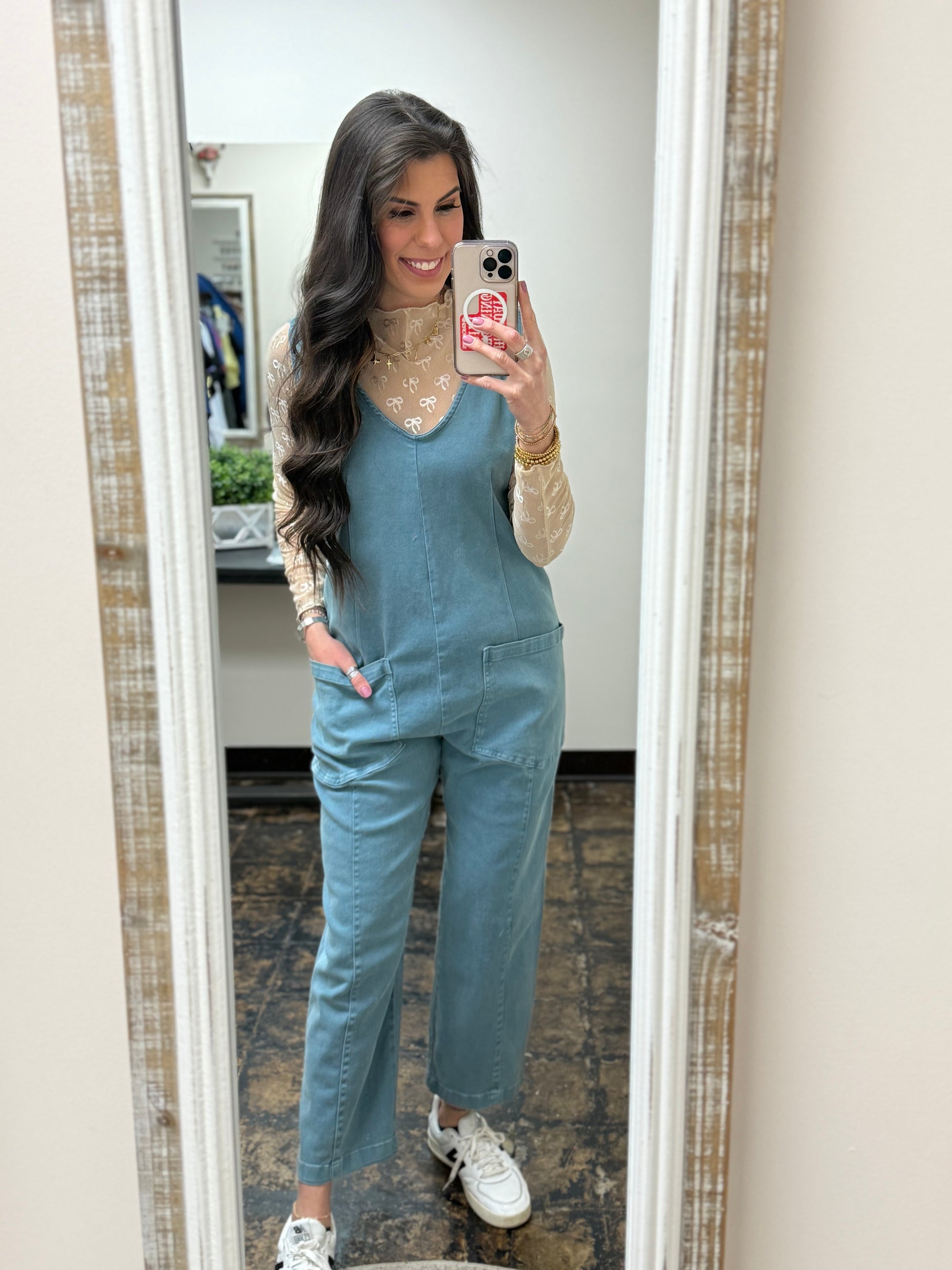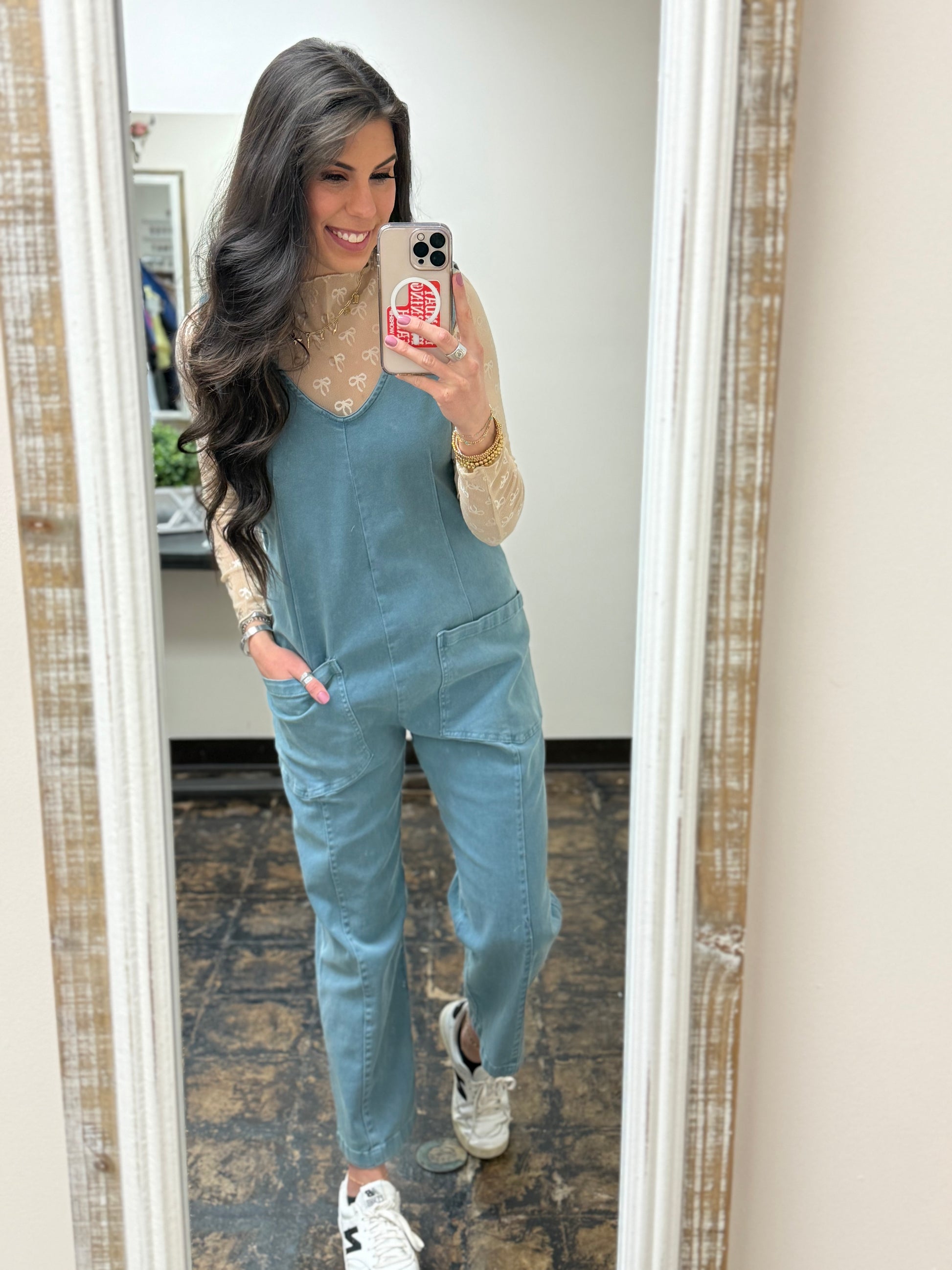 Featuring a colored denim look and adjustable straps for a perfect fit, this jumpsuit moves with your body for all-day comfort. The baggy fit and deep v-neck add a touch of fun!