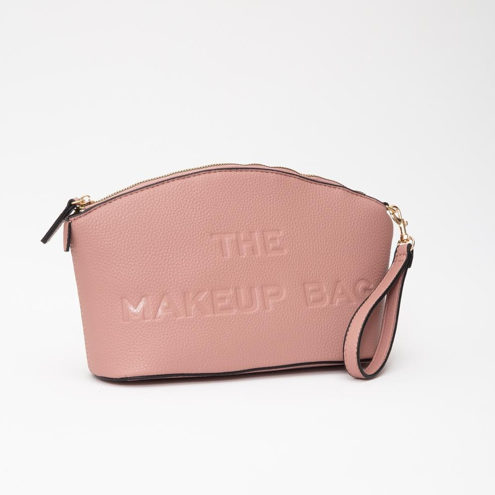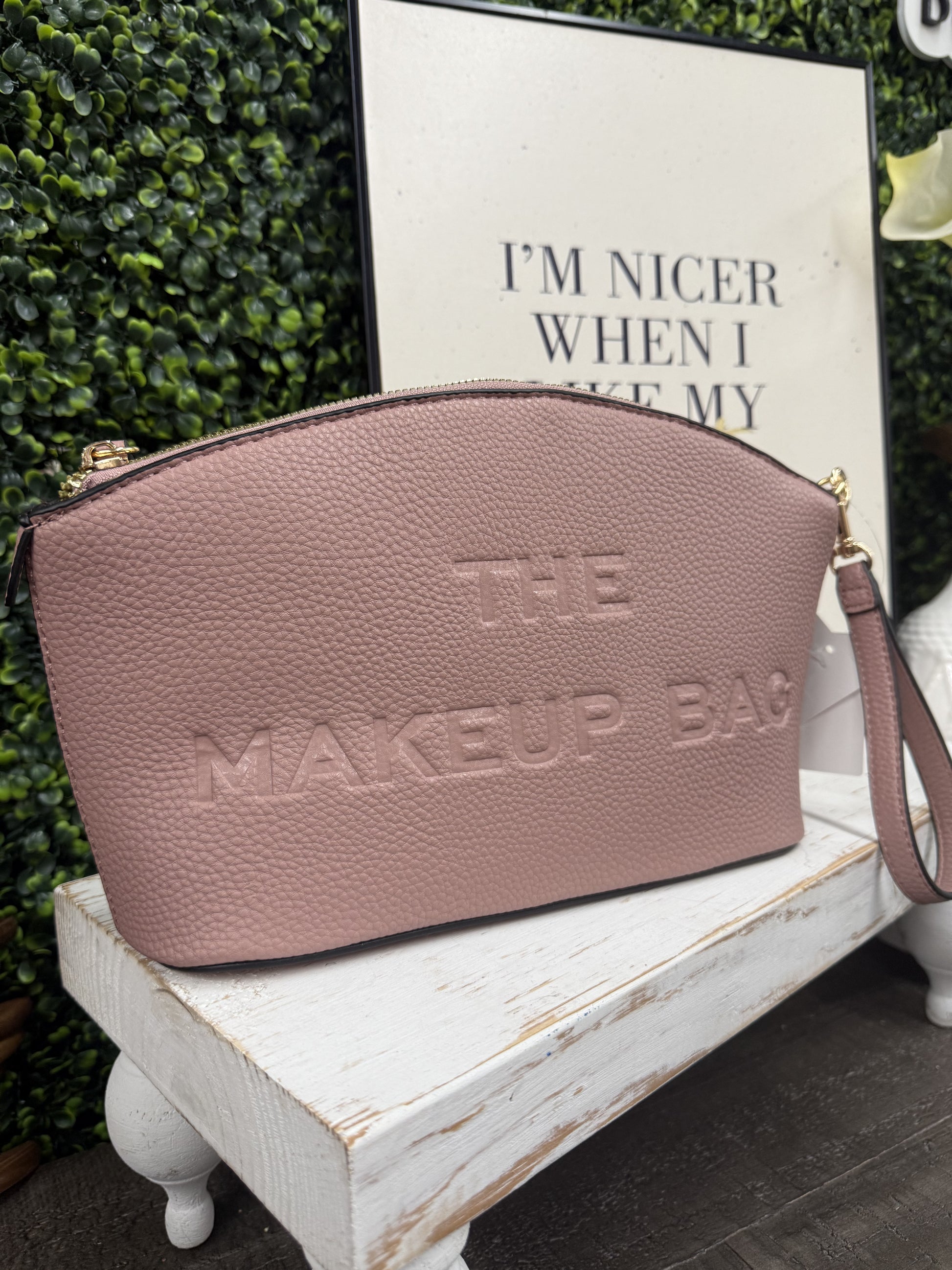 Stay organized and stylish with The Makeup Bag! Made of vegan leather, this bag features a chic "THE MAKEUP BAG" detail, full zip closure, and a removable wristlet for on-the-go convenience. With an internal zip pocket, it's perfect for storing all your beauty essentials in one place. Measures 10.5" L x 6.5" T x 3" D.