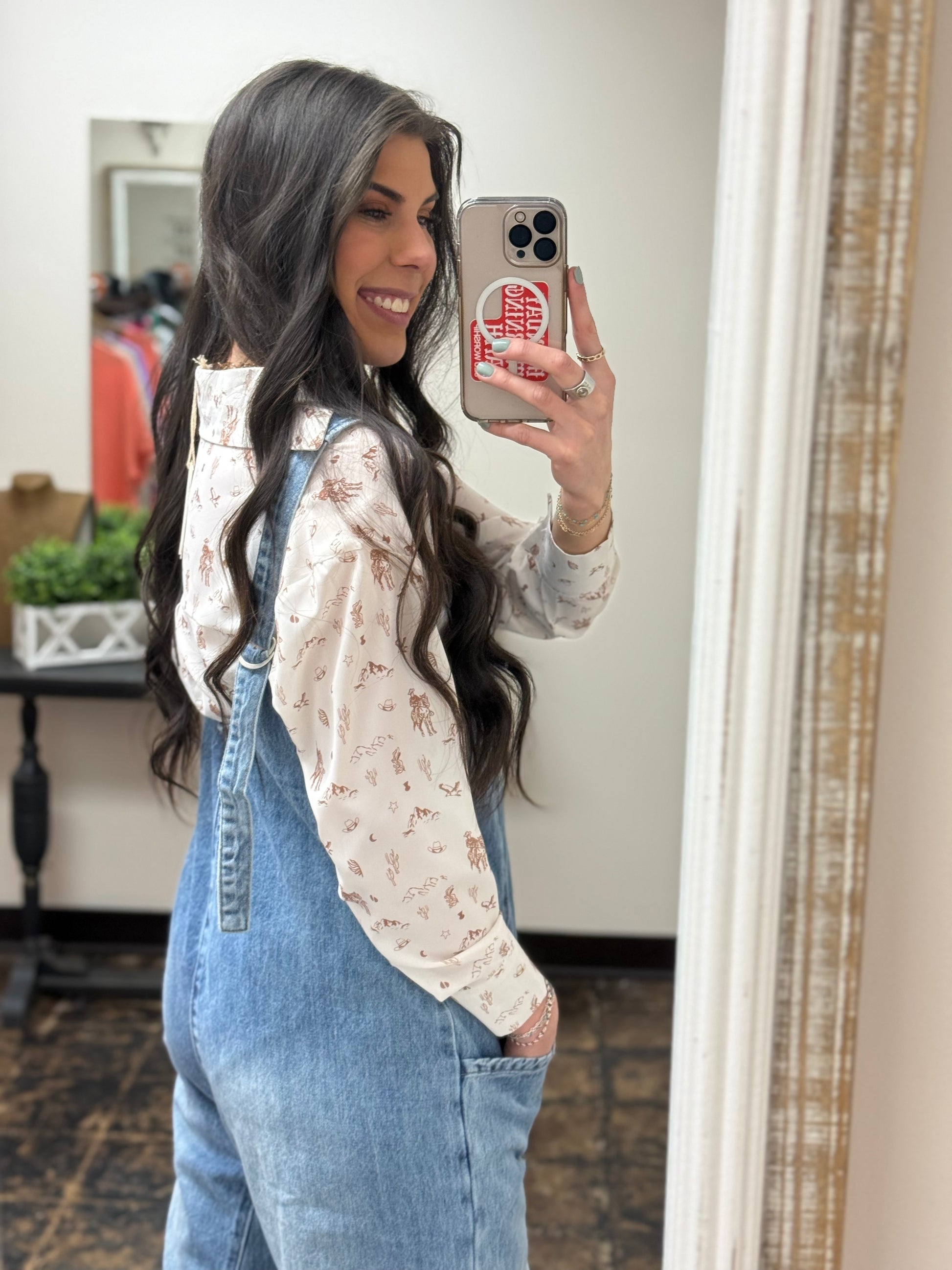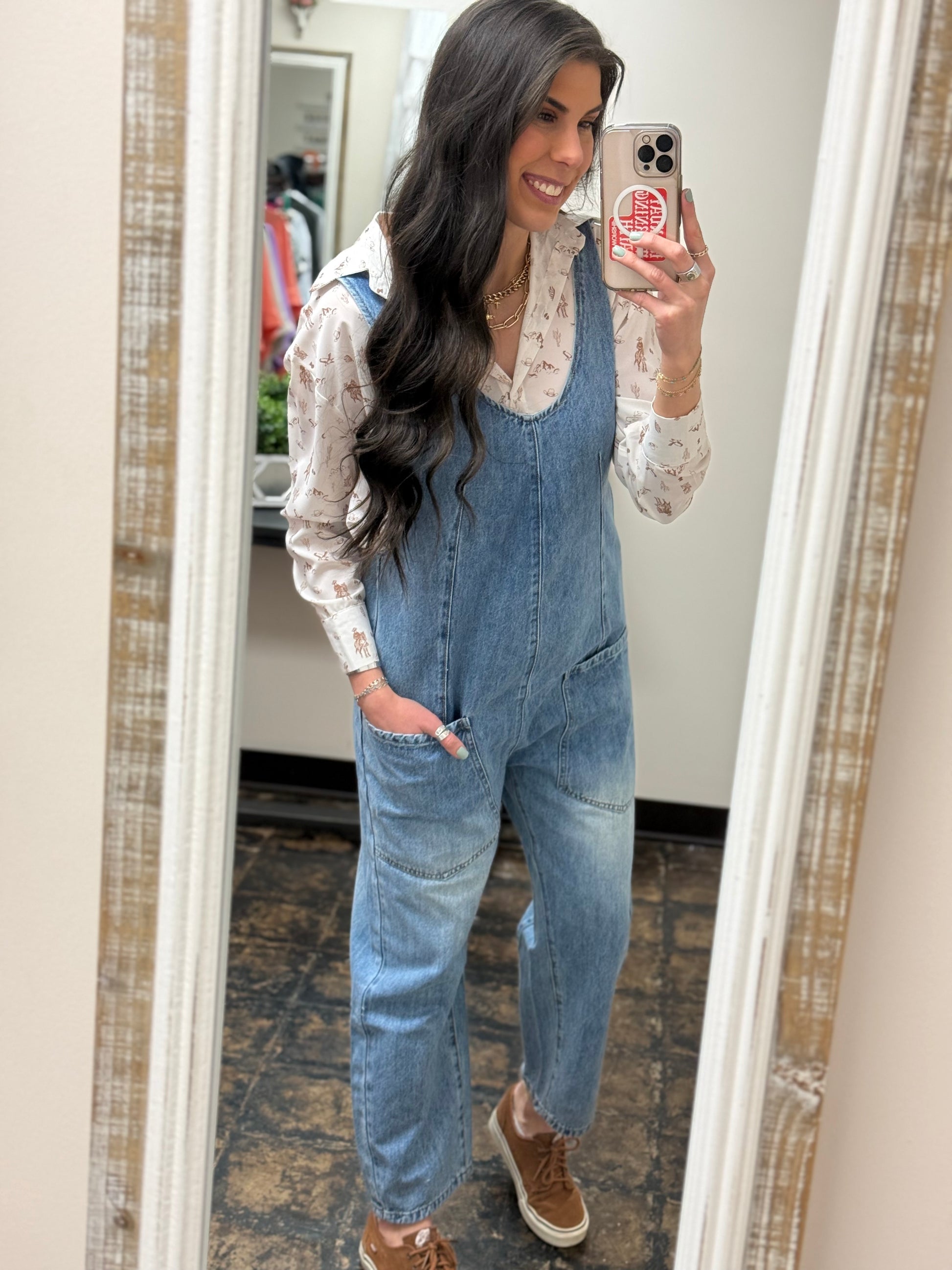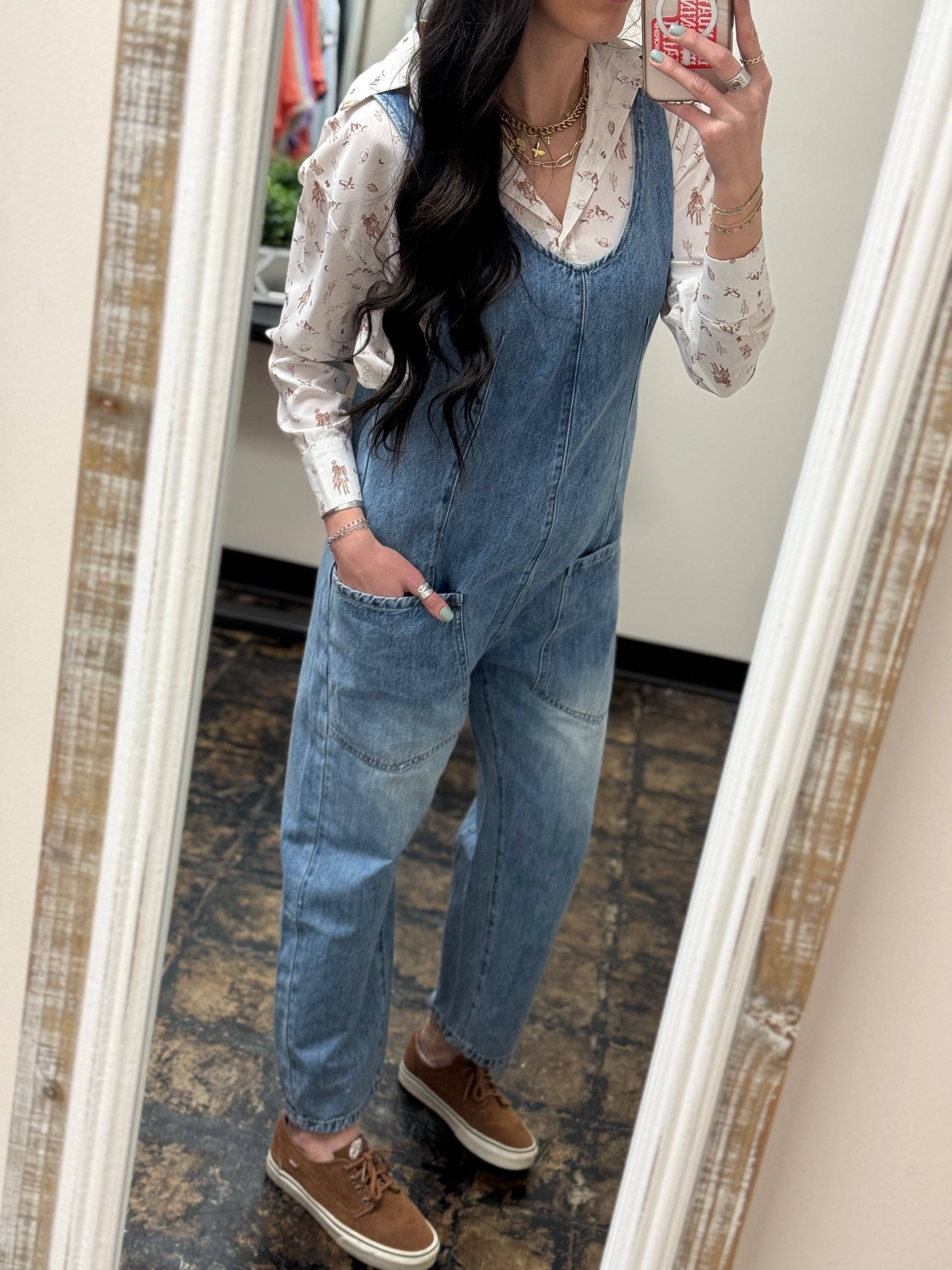 Featuring a medium wash denim and adjustable straps for a perfect fit, this jumpsuit moves with your body for all-day comfort. The baggy fit and deep v-neck add a touch of fun!