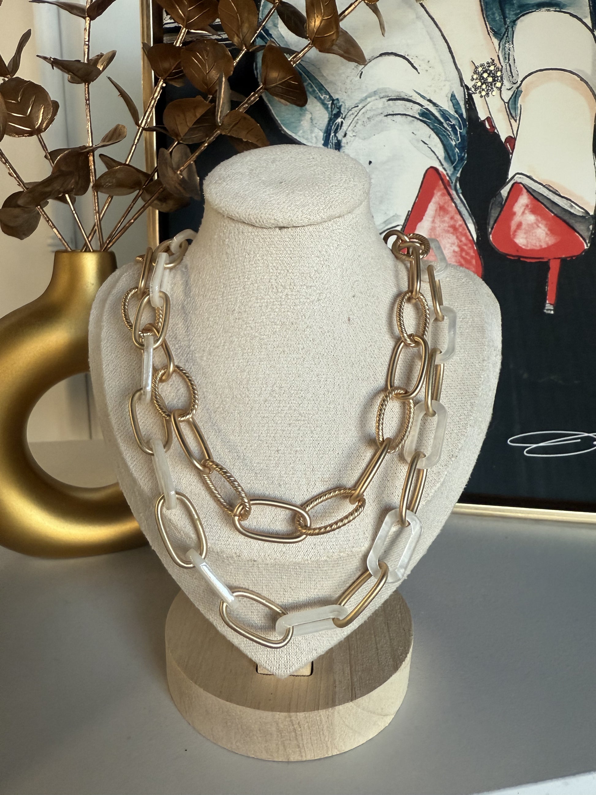 Indulge in luxury with The Marlene Necklace. This exquisite piece features a layered design of gold and white chain links, adding a touch of elegance to any outfit. Elevate your style and make a statement with this sophisticated and exclusive necklace.