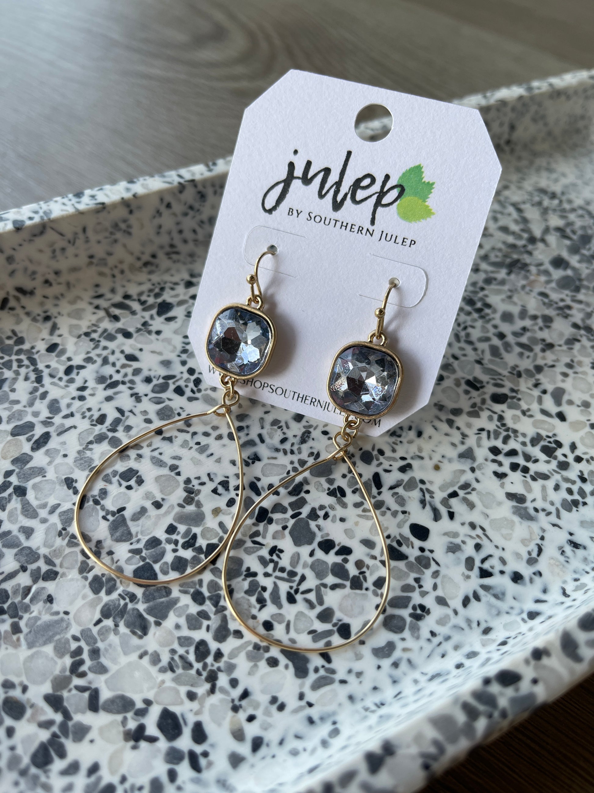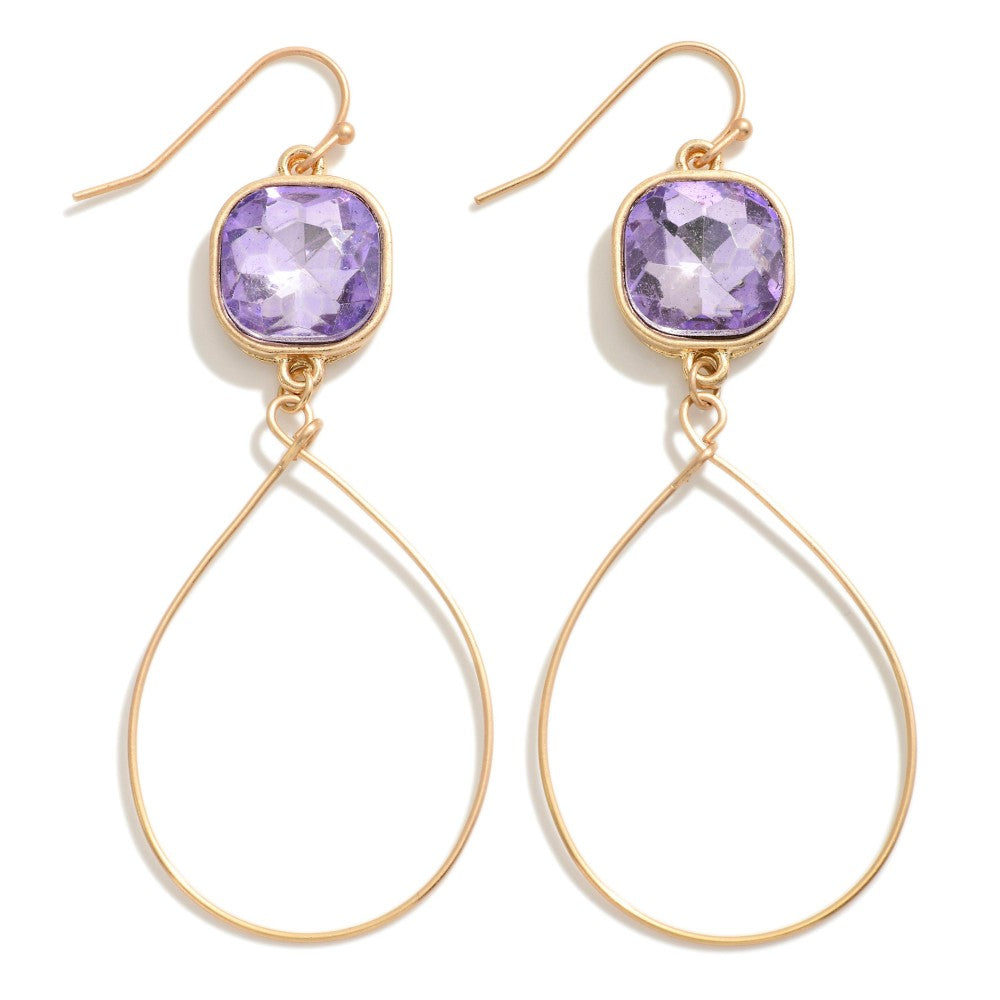 The Marlowe Earrings feature a metal wire loop and cushion cut rhinestone accents - all surrounding an lavender centerpiece for a stunning visual effect. With a length of 3", these earrings will draw attention to any outfit you choose to wear. Use them as a statement piece and enjoy their sophistication and elegance.