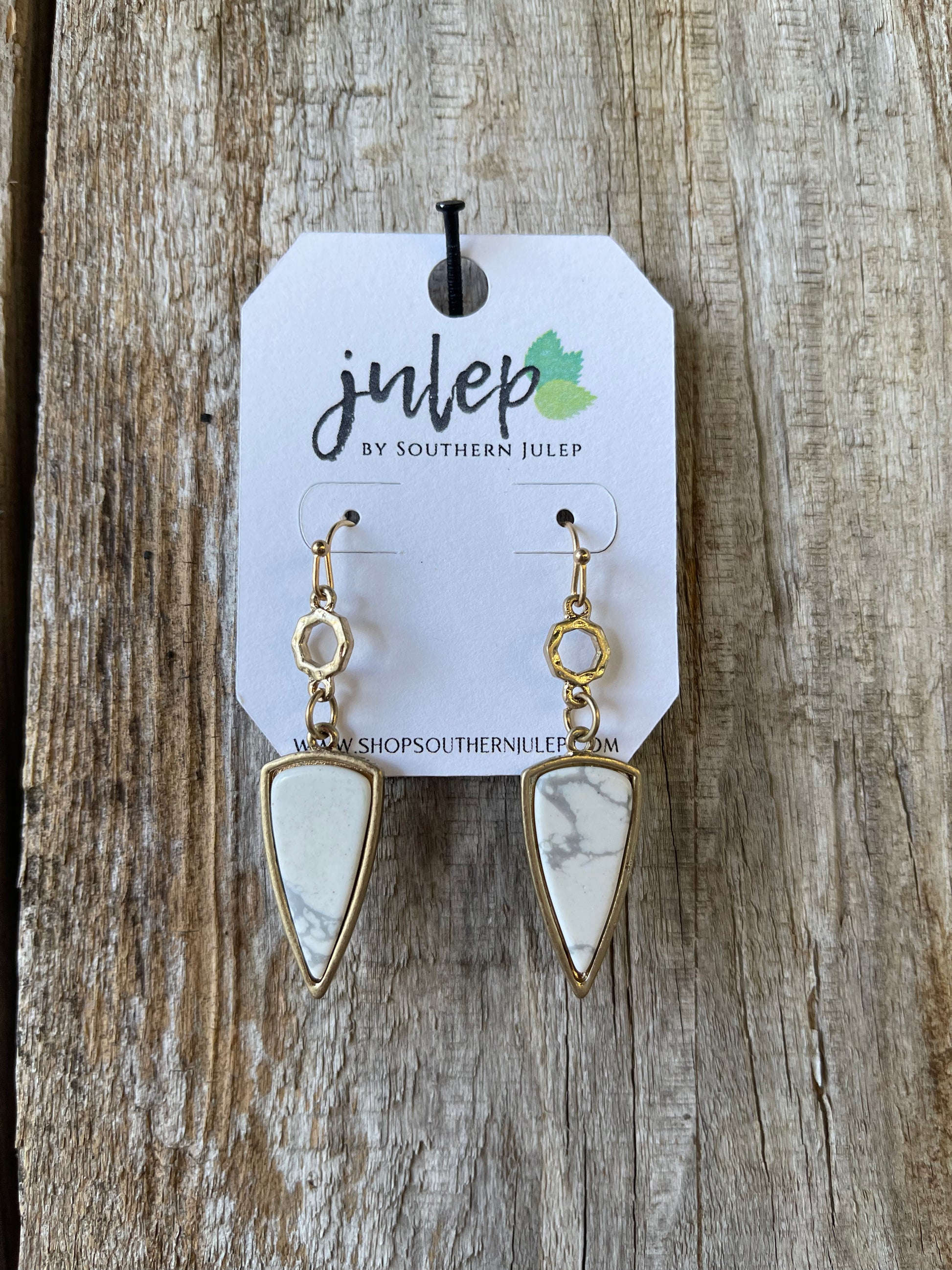 - Metal fish hook earrings with a semi-precious stone in a arrowhead shape.