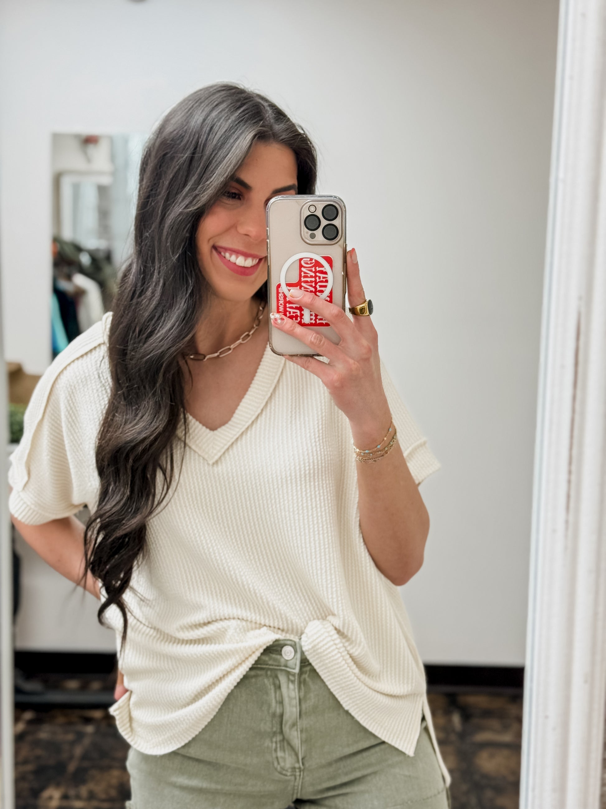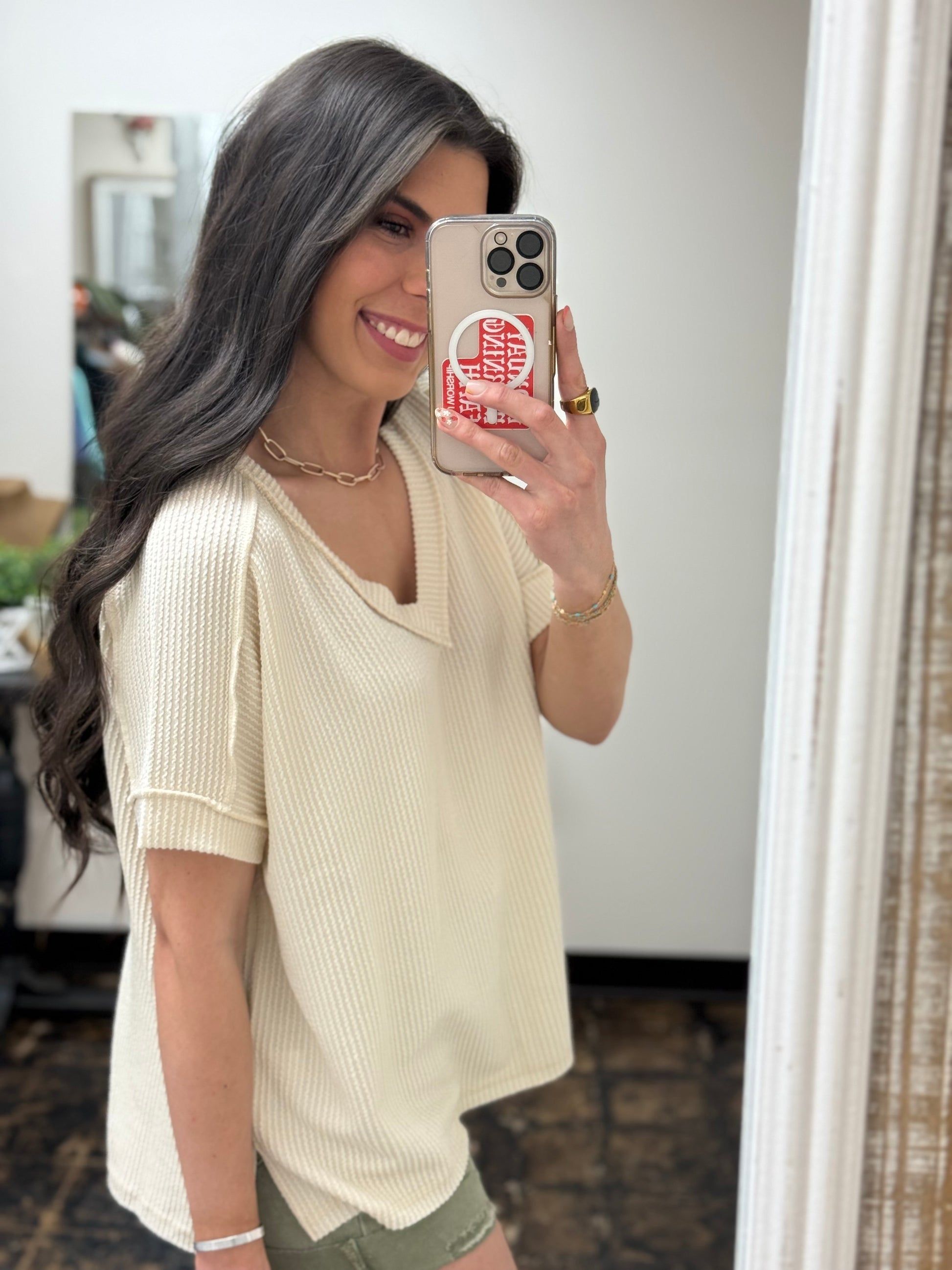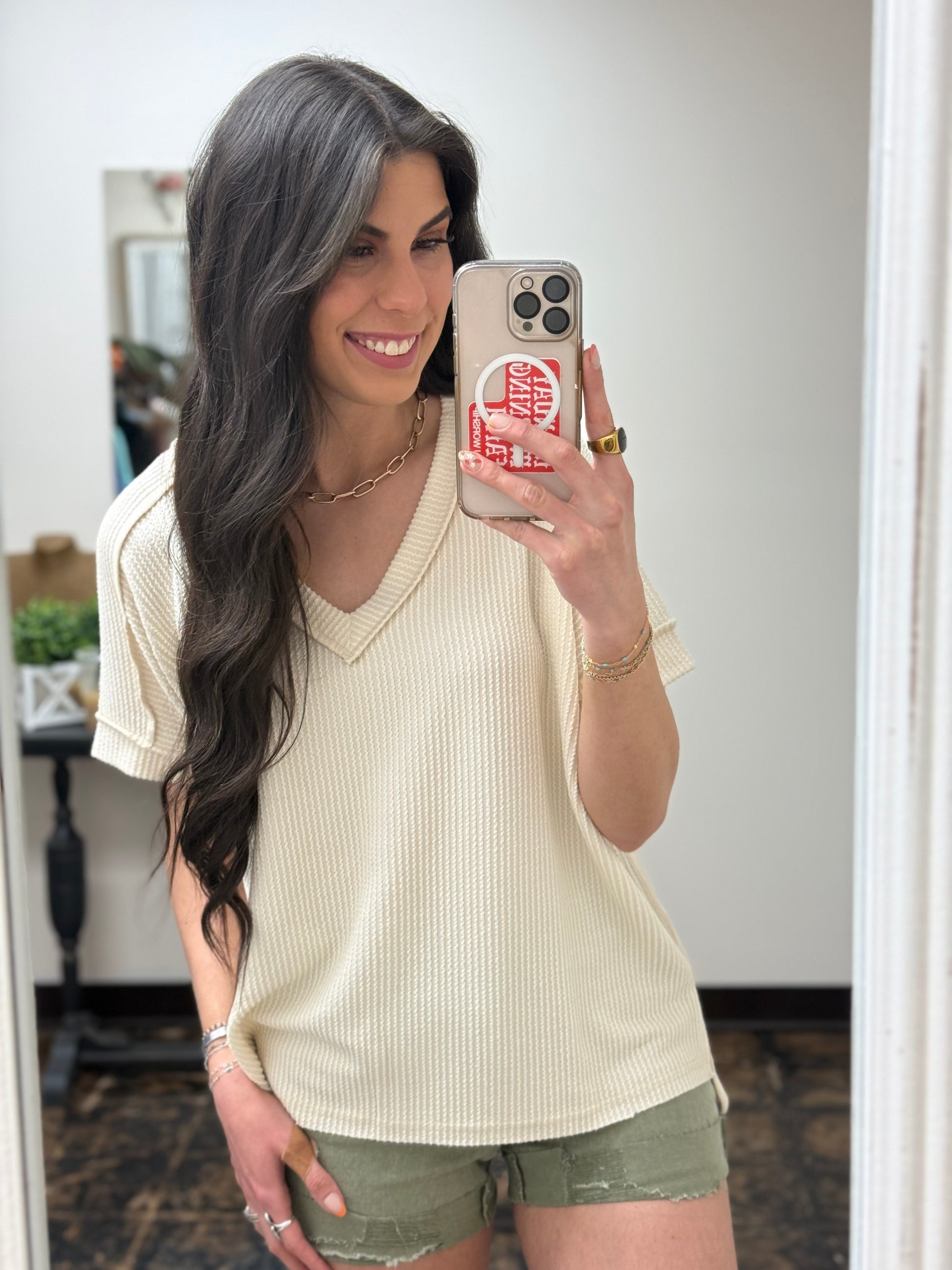 The Roxie Corded Top is the sweet addition your wardrobe needs. Its ribbed v-neck design and short sleeves are perfect for a casual yet chic look. Exposed sleeves give it a playful edge. Get ready to turn heads with Roxie!